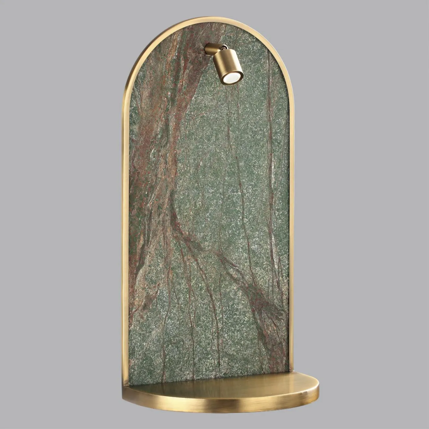 Светильник-полка Giardino был вдохновлен видом окна в сад, благоухающим цветами и запахом мокрой листвы. Декор выполнен из каменного шпона, прожилки которого напоминают силуэт деревьев. Полка и обрамление каменного шпона - в бронзовом цвете. Полка выдерживает до 6 кг. Выключатель расположен под полкой. Спот вращается на градусов и при необходимости может быть повернут наверх.Угол рассеивания спота - 24°, угол вращения спота - 90/350°.
