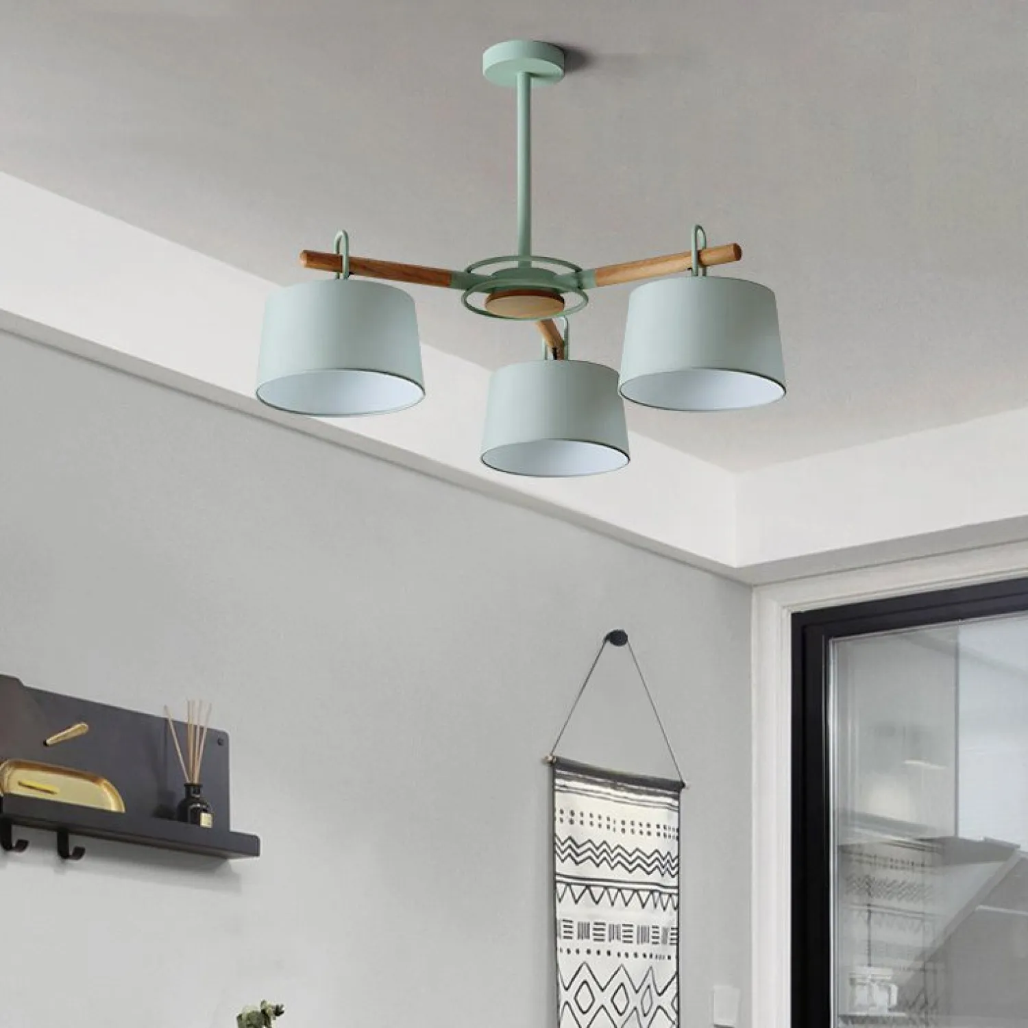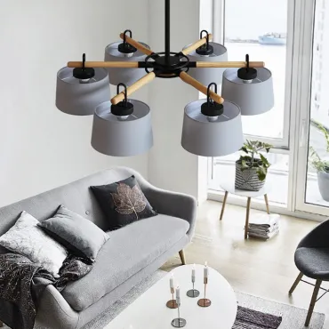 Новая люстра EVEN в стиле Сканди с текстильными плафонами на лучевом каркасе с фактурными деревянными элементами на корпусе.