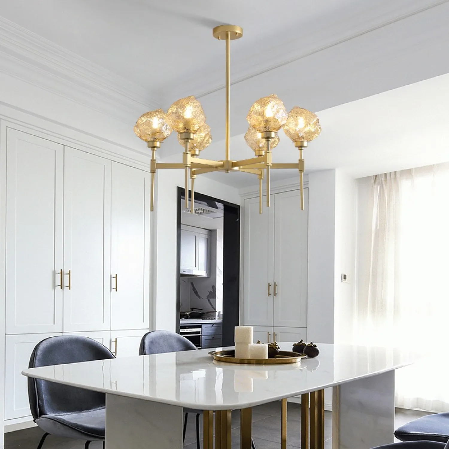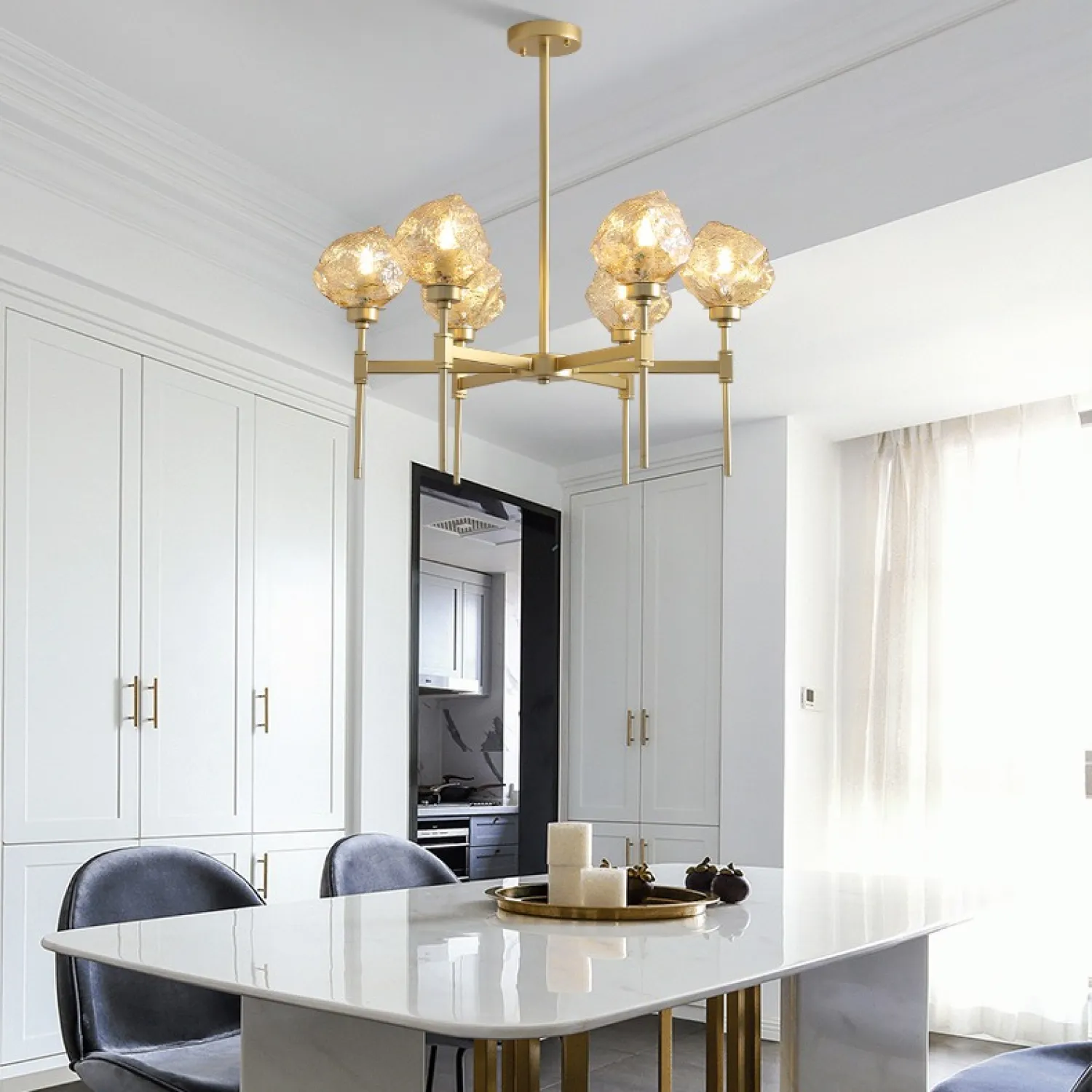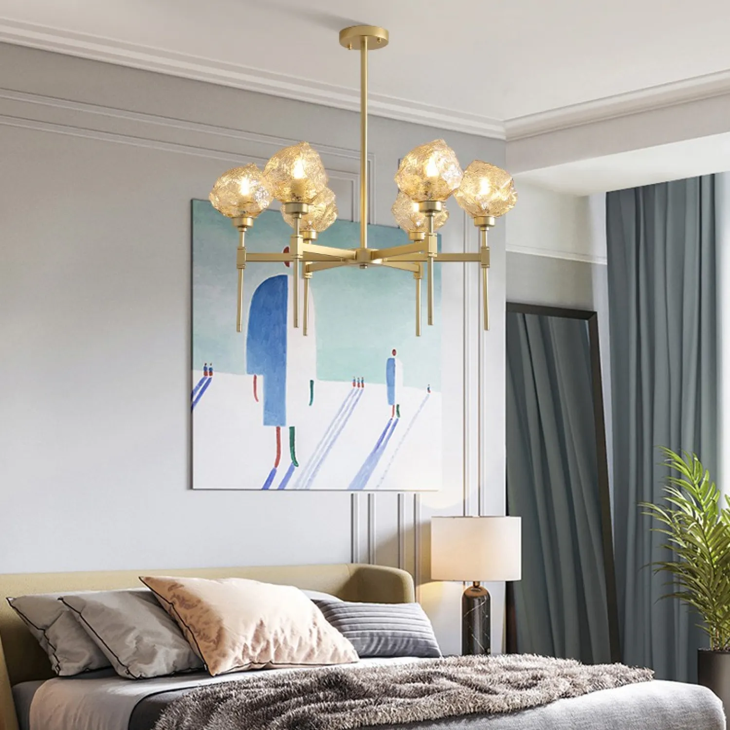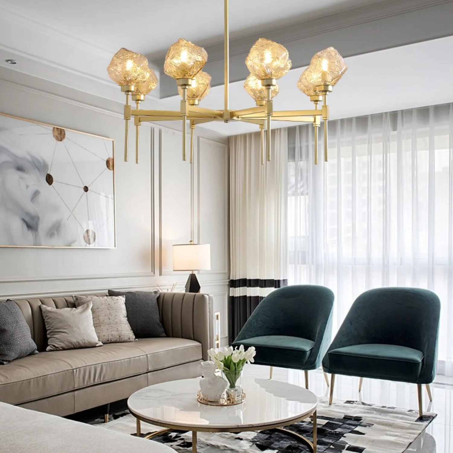 С тремя плафонами, расположенными на разной высоте, эта люстра обеспечивает равномерное и яркое освещение всей комнаты. Она идеально подходит для гостиной, столовой или спальни, добавляя в них шарм и изысканность.