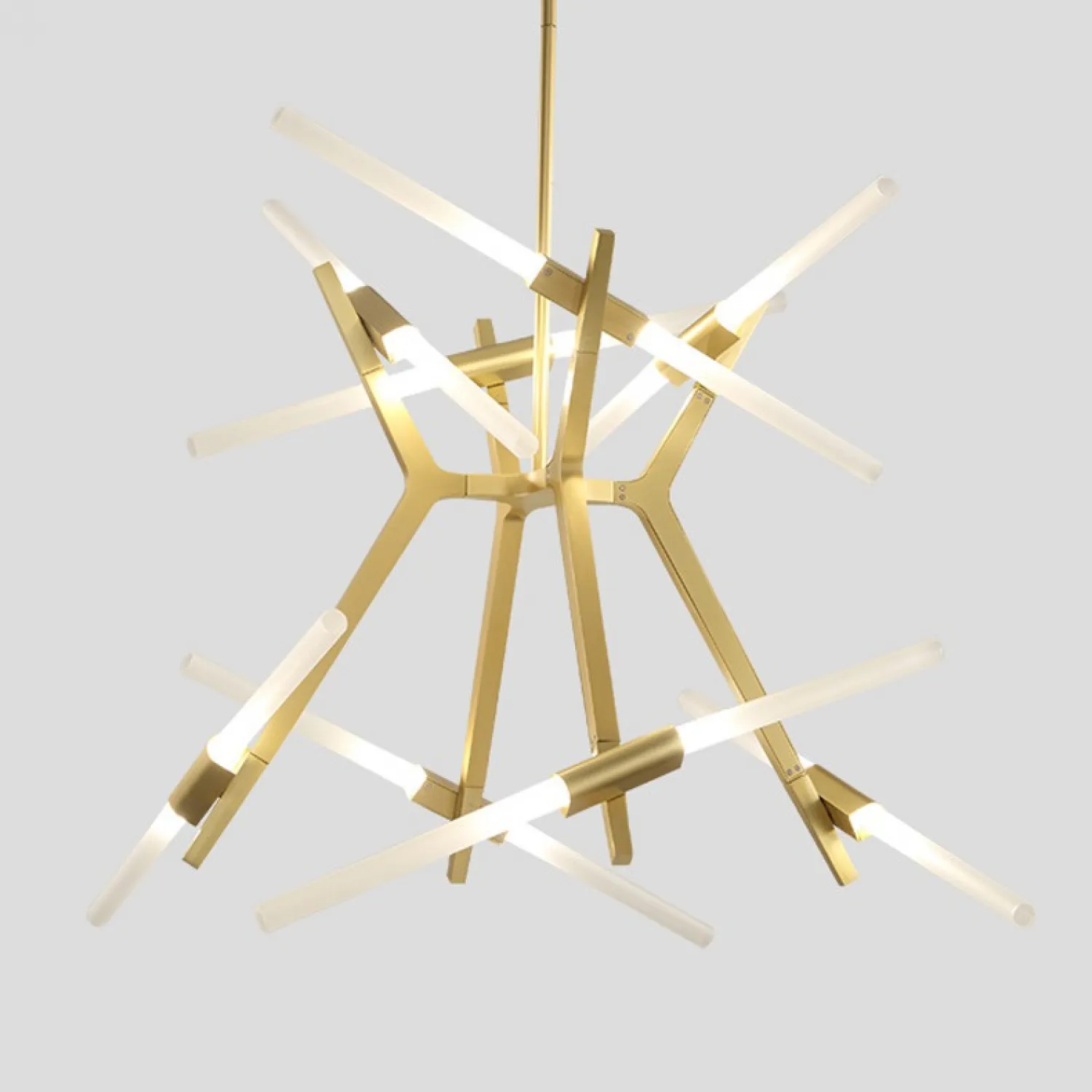 Одна из самых востребованных дизайнерами люстр молекулярной формы, с огромным спектром конфигураций: от 6-х до 20 трубчатых плафонов на каркасе латунного или черного цветов.