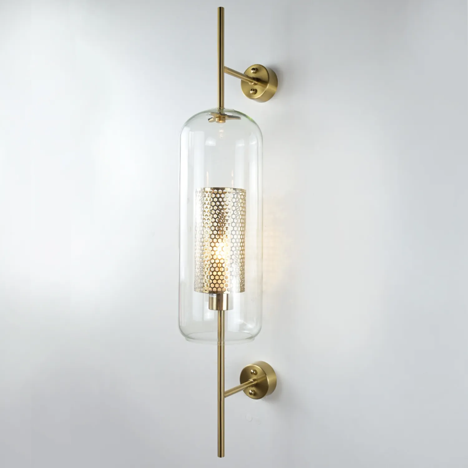 Настенный светильник с комбинированным абажуром из стекла и металлической сетки с ячейками в форме сот. Выпускается 2-х типов: в форме усеченного шара или цилиндра. Каждый тип имеет два размера и отличается цветом внутренней сетки (латунь или сталь). Сочетайте светильники вместе С ПОДВЕСАМИ из этой же серии для создания единого стиля освещения. Цена указана за размер «L». Всю остальную информацию узнавайте у наших менеджеров. Настенный светильник CATCH WALL cylinder L78 brass - это элегантное и стильное решение для освещения вашего интерьера. Он прекрасно дополнит любой современный дизайн комнаты, придавая ей уют и изысканность. Светильник выполнен из латуни высокого качества, что обеспечивает ему долговечность и привлекательный внешний вид. Его цилиндрическая форма создает эффектный световой акцент на стене, добавляя в помещение неповторимый шарм. Благодаря своей компактности и удобной конструкции, настенный светильник CATCH WALL cylinder L78 brass легко устанавливается на любую поверхность. Он идеально подходит для освещения коридоров, гостиных, спален или офисных помещений. Кроме того, светильник оснащен регулируемым световым потоком, что позволяет вам создавать разные атмосферы в помещении - от яркого и функционального освещения до мягкого и расслабляющего света. Не упустите возможность приобрести настенный светильник CATCH WALL cylinder L78 brass и добавить элегантность и стиль в свой интерьер. Позвольте свету стать главным акцентом вашего дома или офиса!