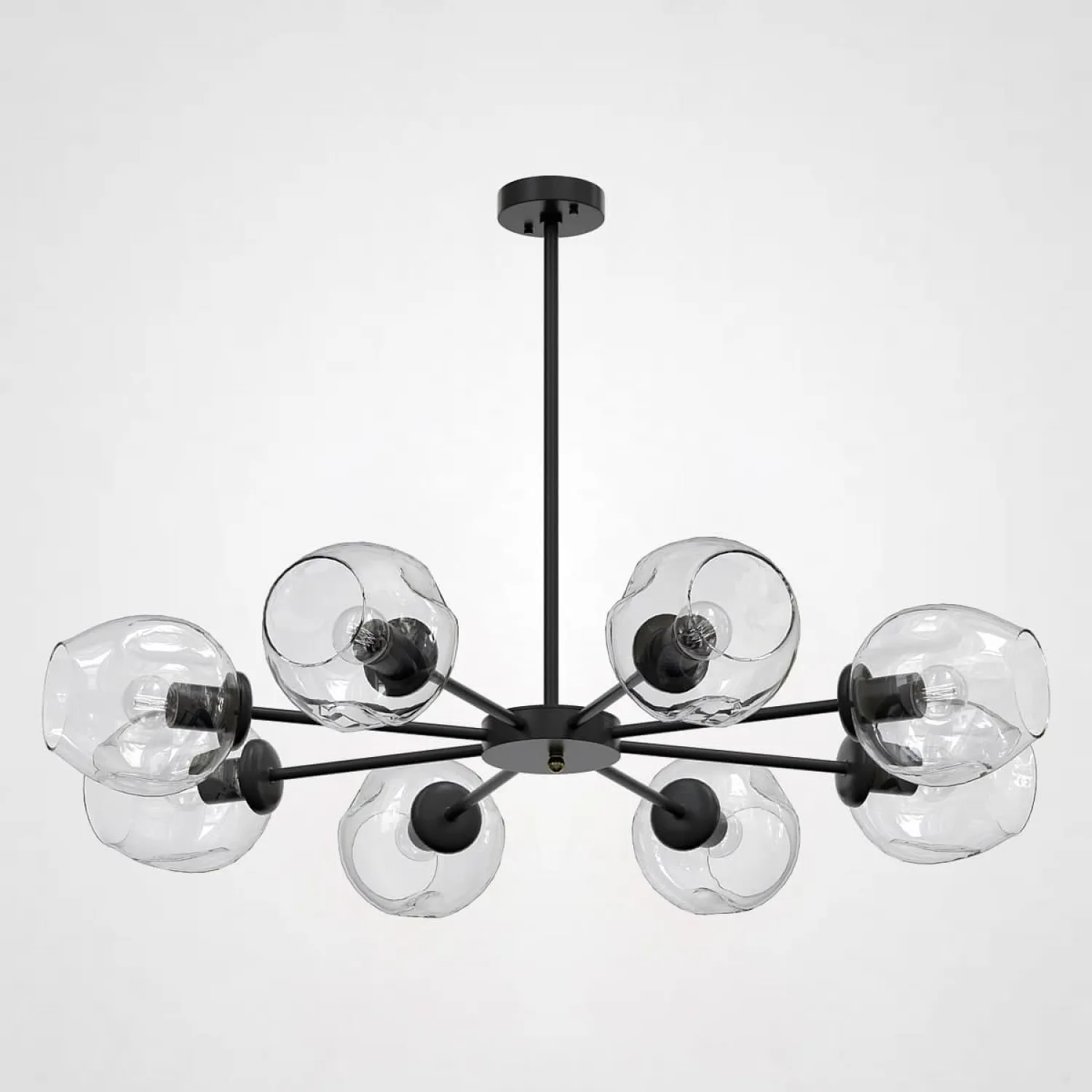 Эта потрясающая люстра имеет 8 прозрачных плафонов, выполненных из высококачественного стекла, которые создают прекрасные игры света и отражений. Черный металлический каркас придает ей стильный и современный вид, который будет гармонично вписываться в любой дизайн помещения.
