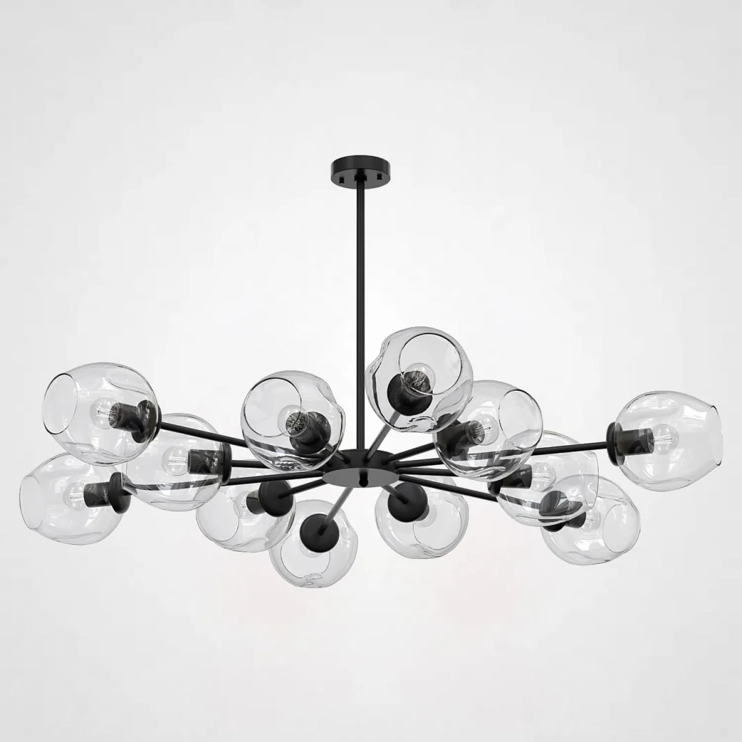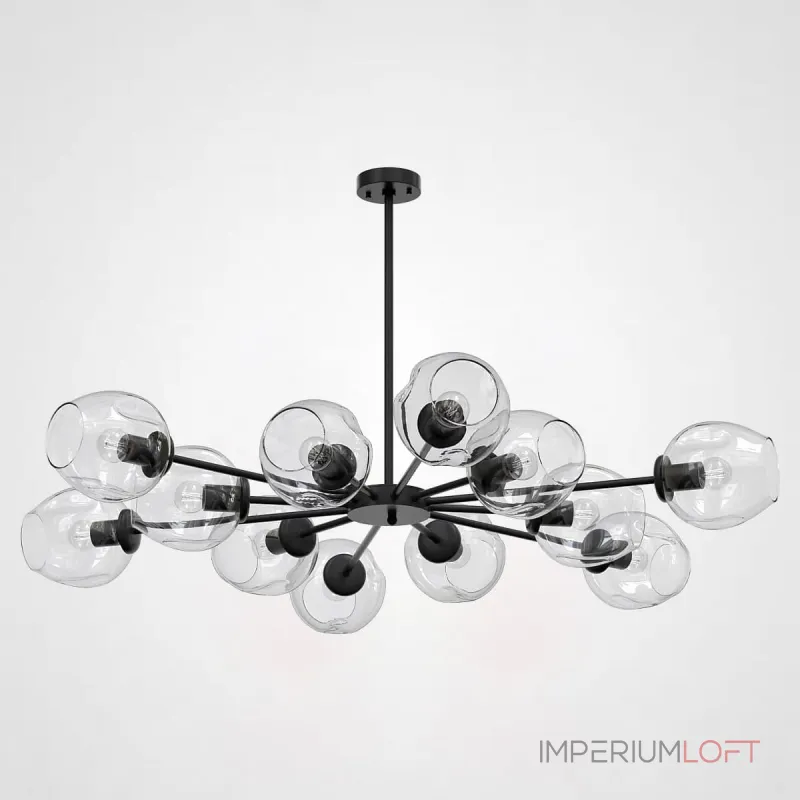 Люстра имеет 12 ламп, что обеспечивает яркое и равномерное освещение в помещении. Каждая лампа оформлена в стильном черно-прозрачном исполнении, что придает ей особый шарм и привлекательность.