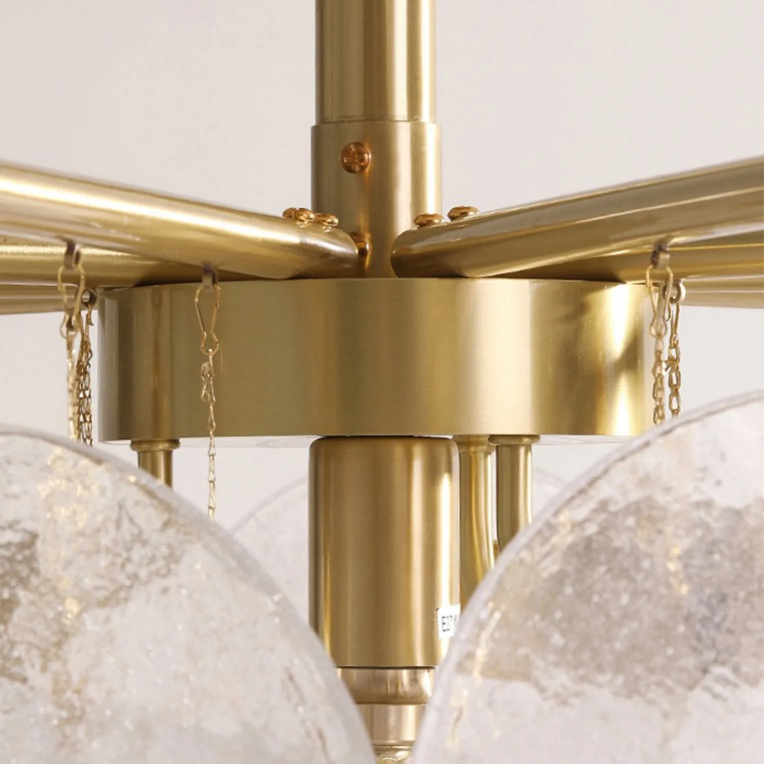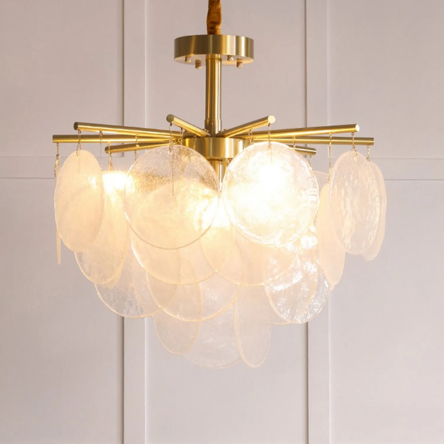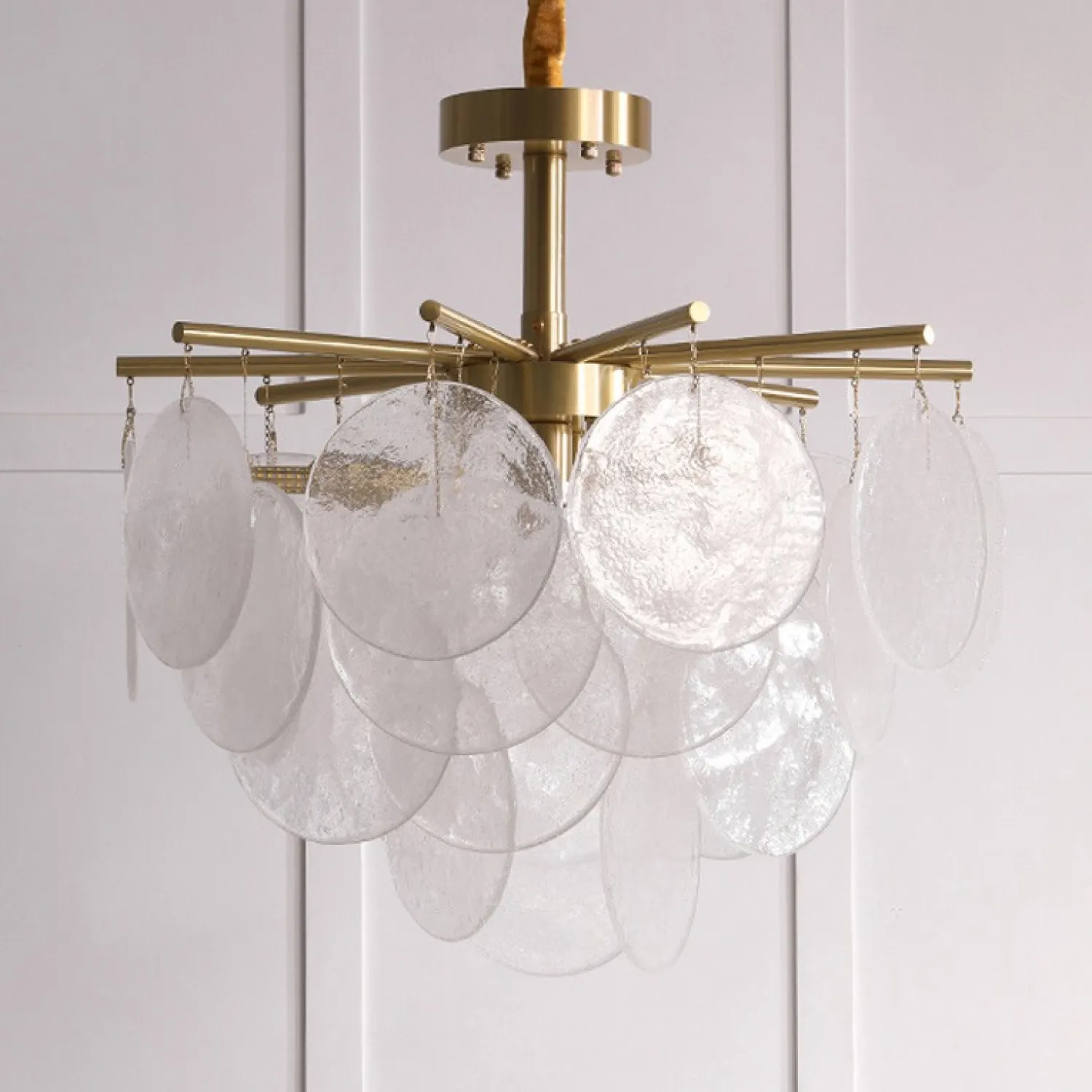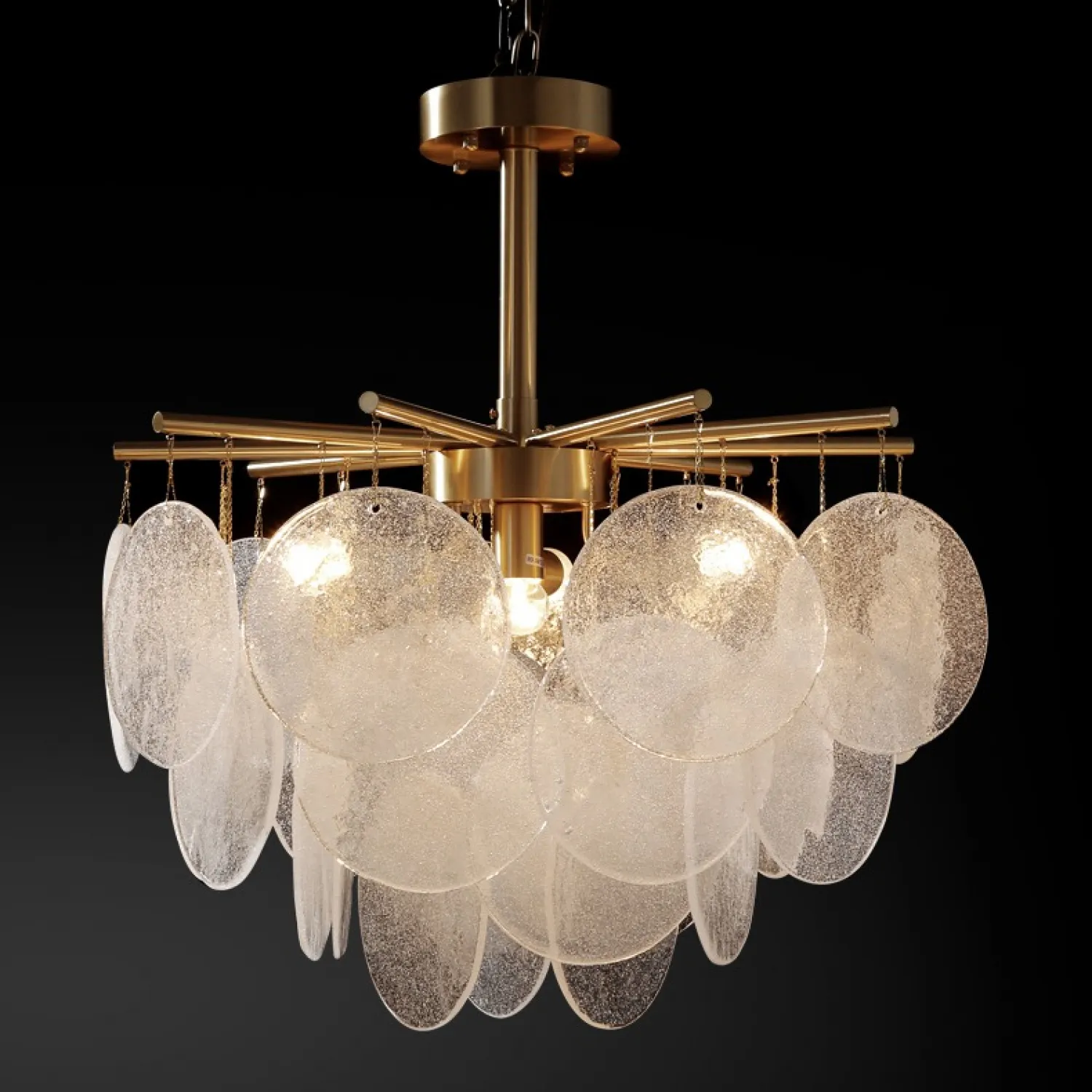 Люстра с пластинчатыми стеклянными канделябрами с фактурой «иней» на лучевой конструкции. Высокое качество сборки, латунный каркас и, конечно, внешний вид — достойны даже самого притязательного интерьера!
