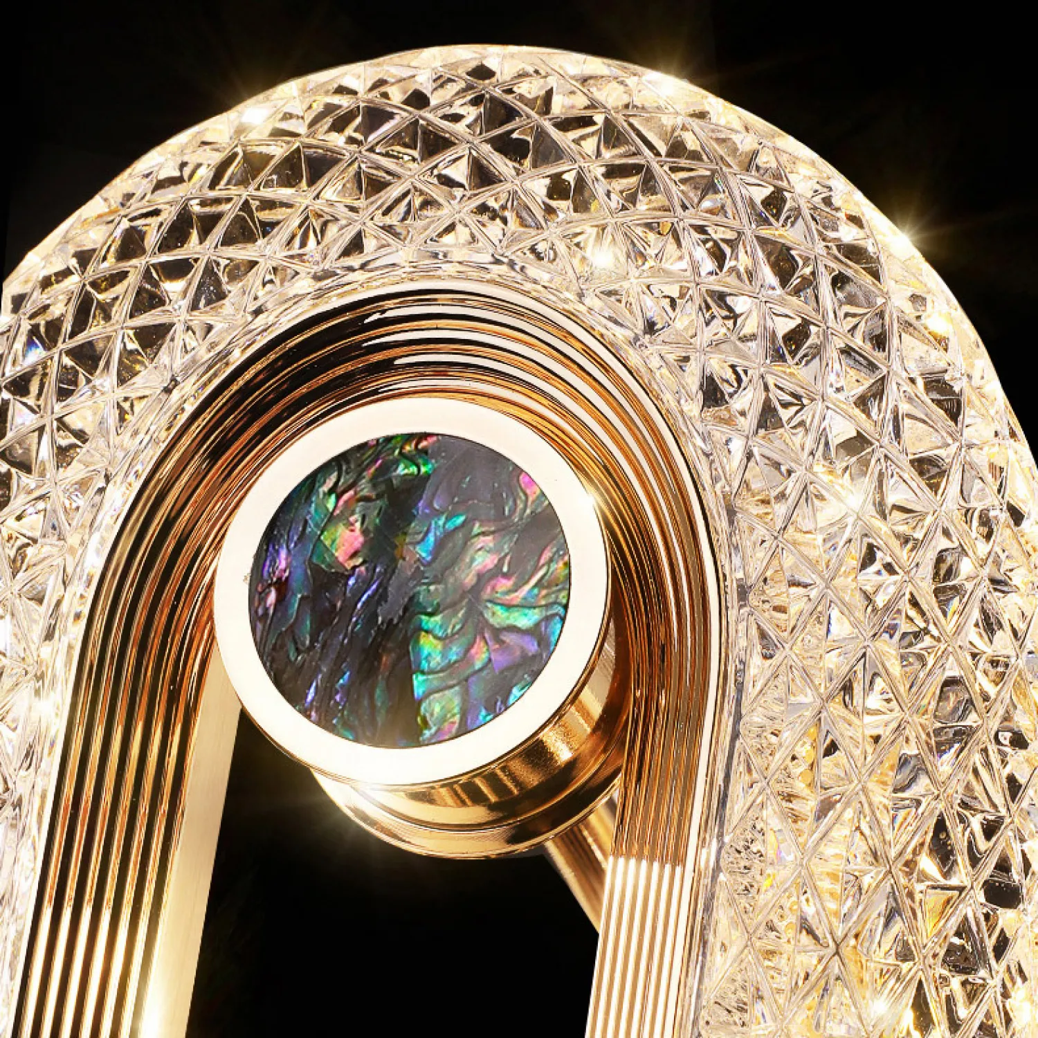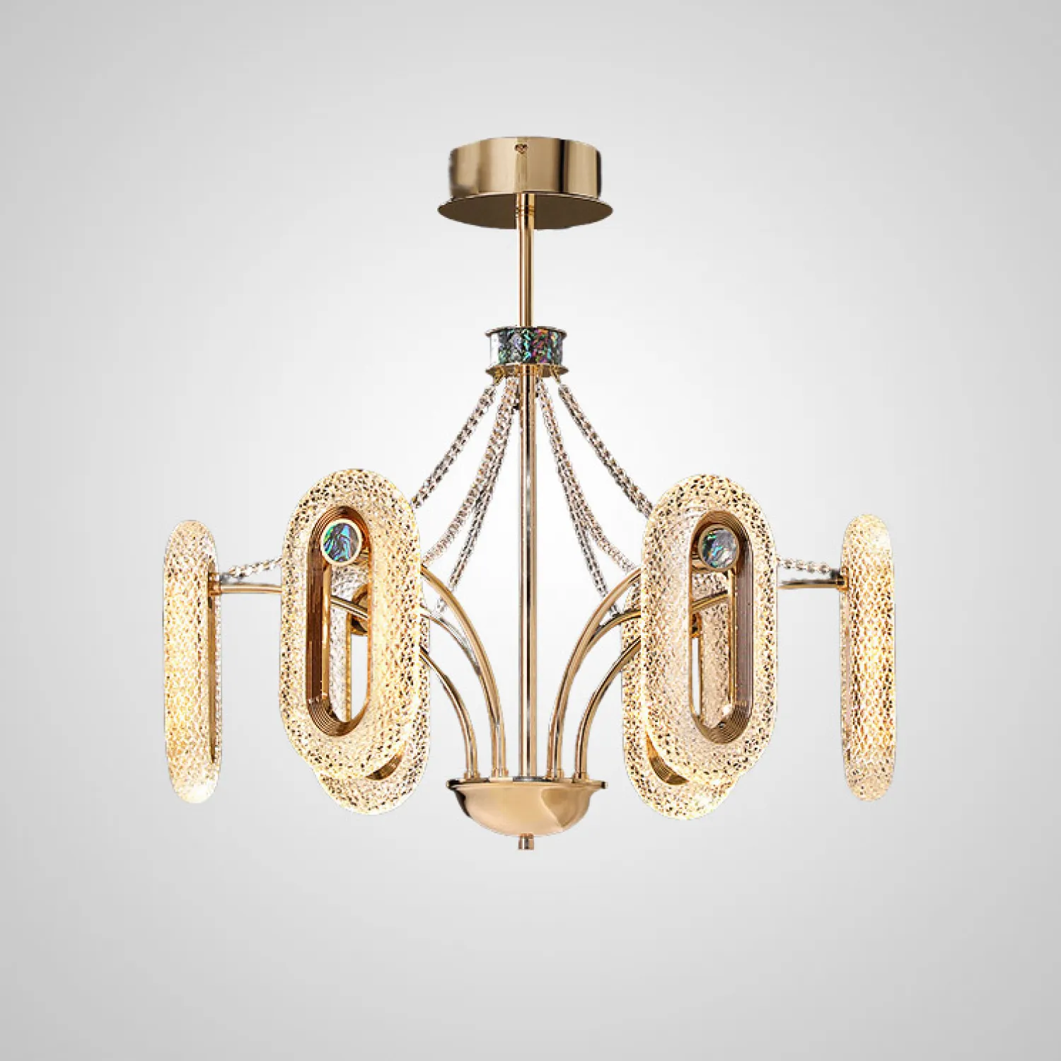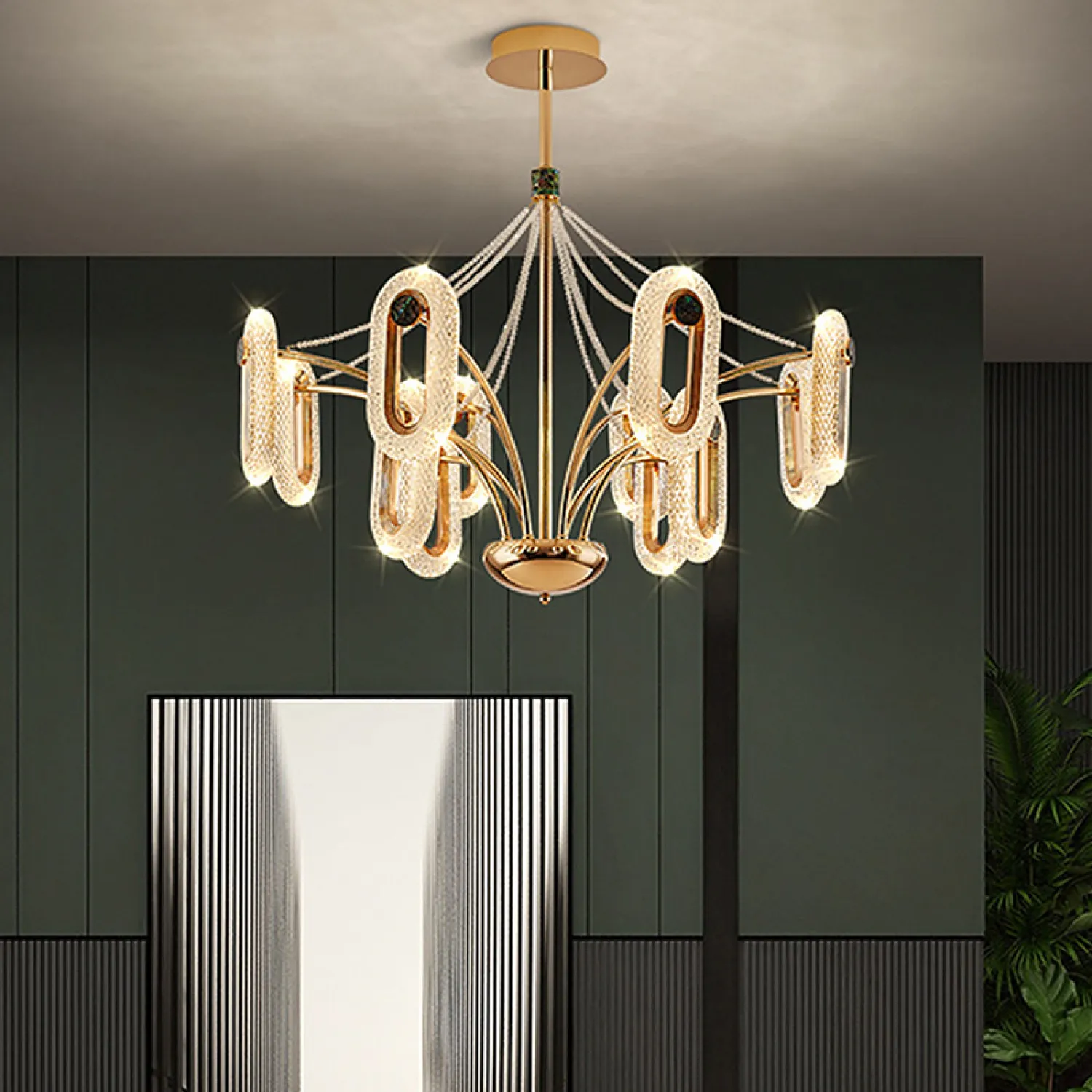 Свет от источников освещения, расположенных на 12 регулируемых плафонах, проникает сквозь кристаллы, создавая игру света и отражений, которые будут радовать глаз и наполнять комнату нежным и романтическим атмосферой.