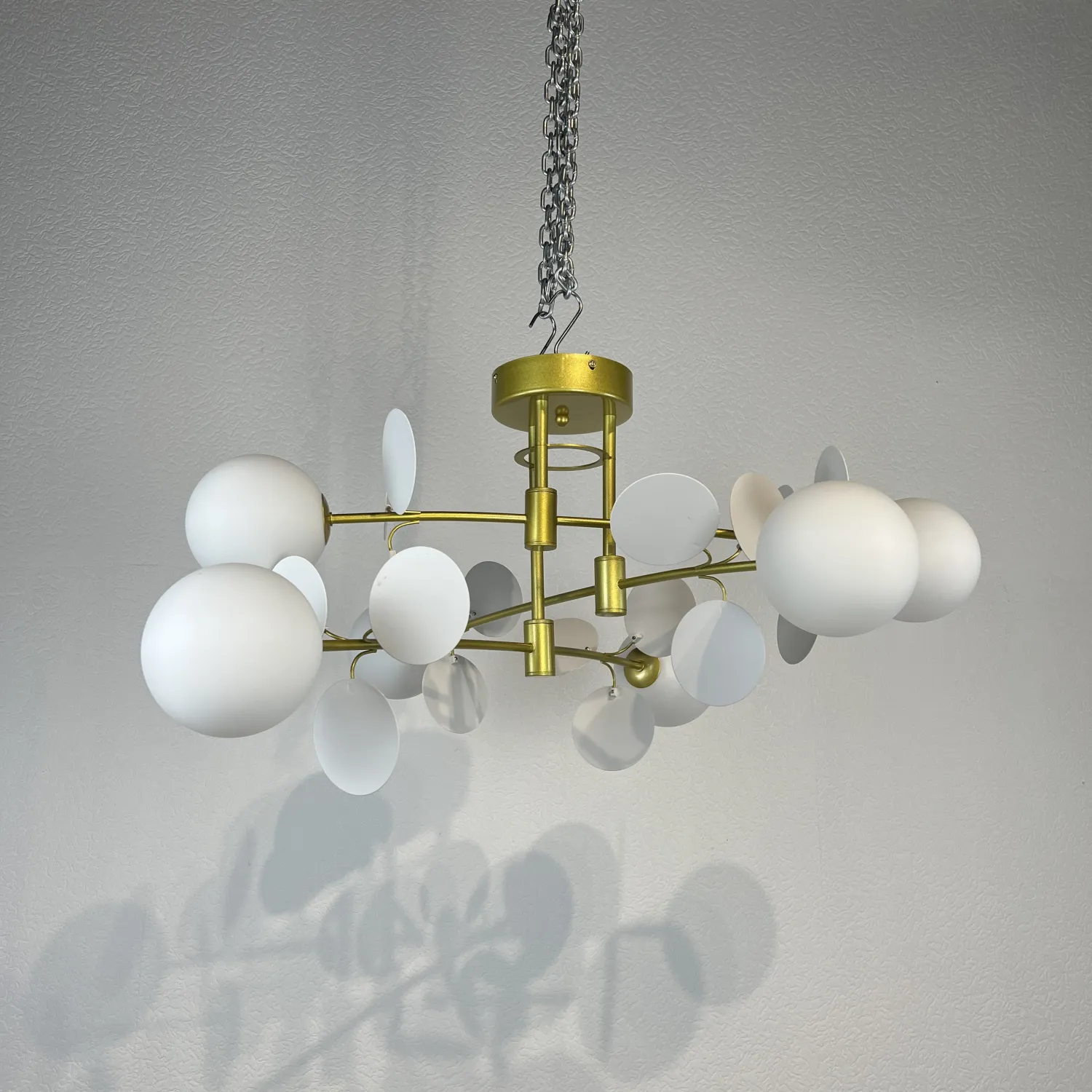 Изготовленная из высококачественного металла с золотым покрытием, эта люстра обладает прочностью и долговечностью, а также привлекательным внешним видом. Она оснащена восьмью регулируемыми плафонами из матового белого стекла, которые создают мягкий и приятный свет, наполняющий комнату теплотой и уютом.