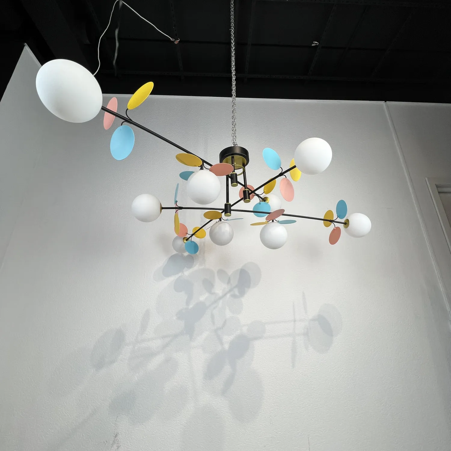 Люстра имеет диаметр 120 см, что позволяет ей занимать центральное место в комнате и привлекать всеобщее внимание. Ее черный металлический корпус и многоцветные стеклянные плафоны создают потрясающий контраст, добавляя изысканности и стиля вашему интерьеру.