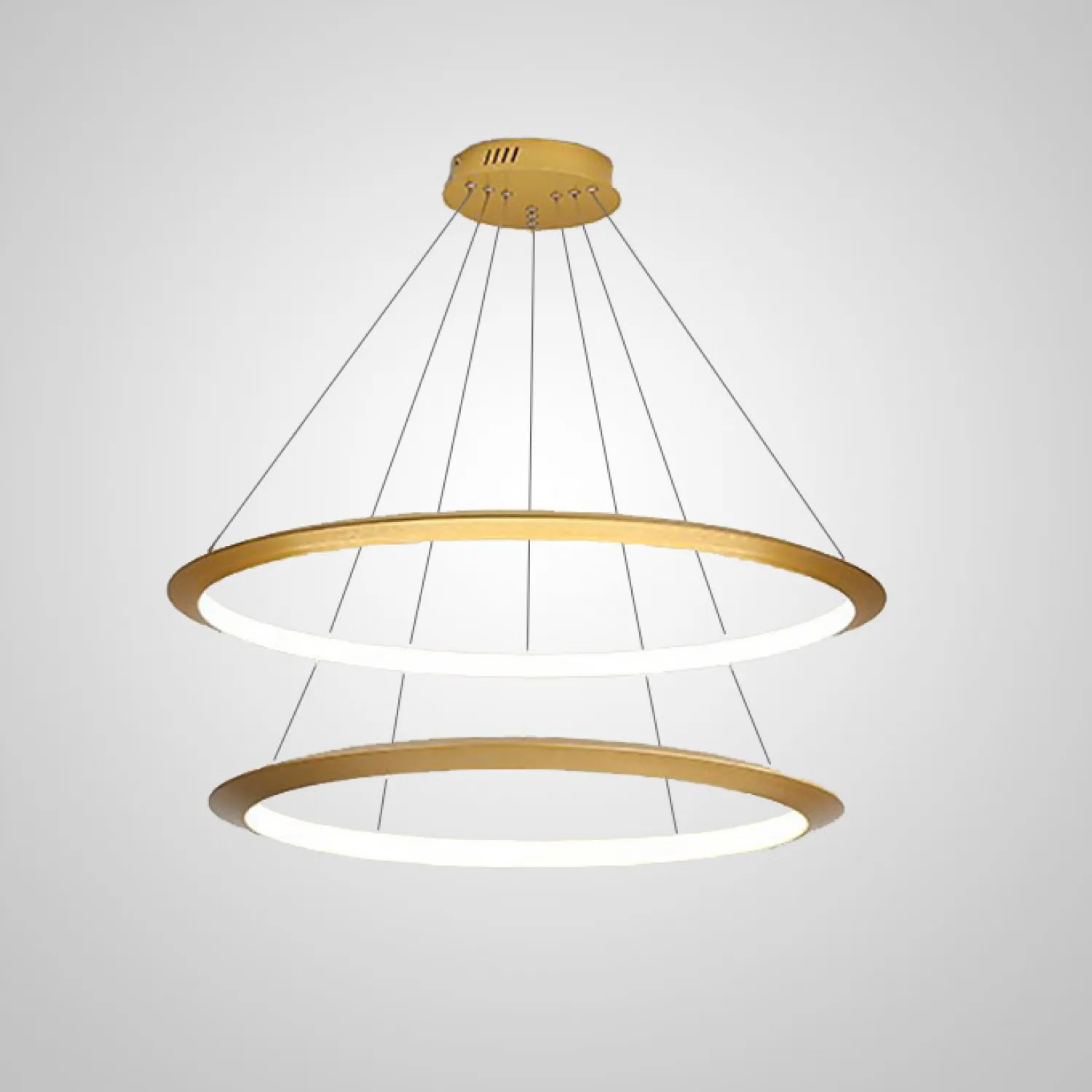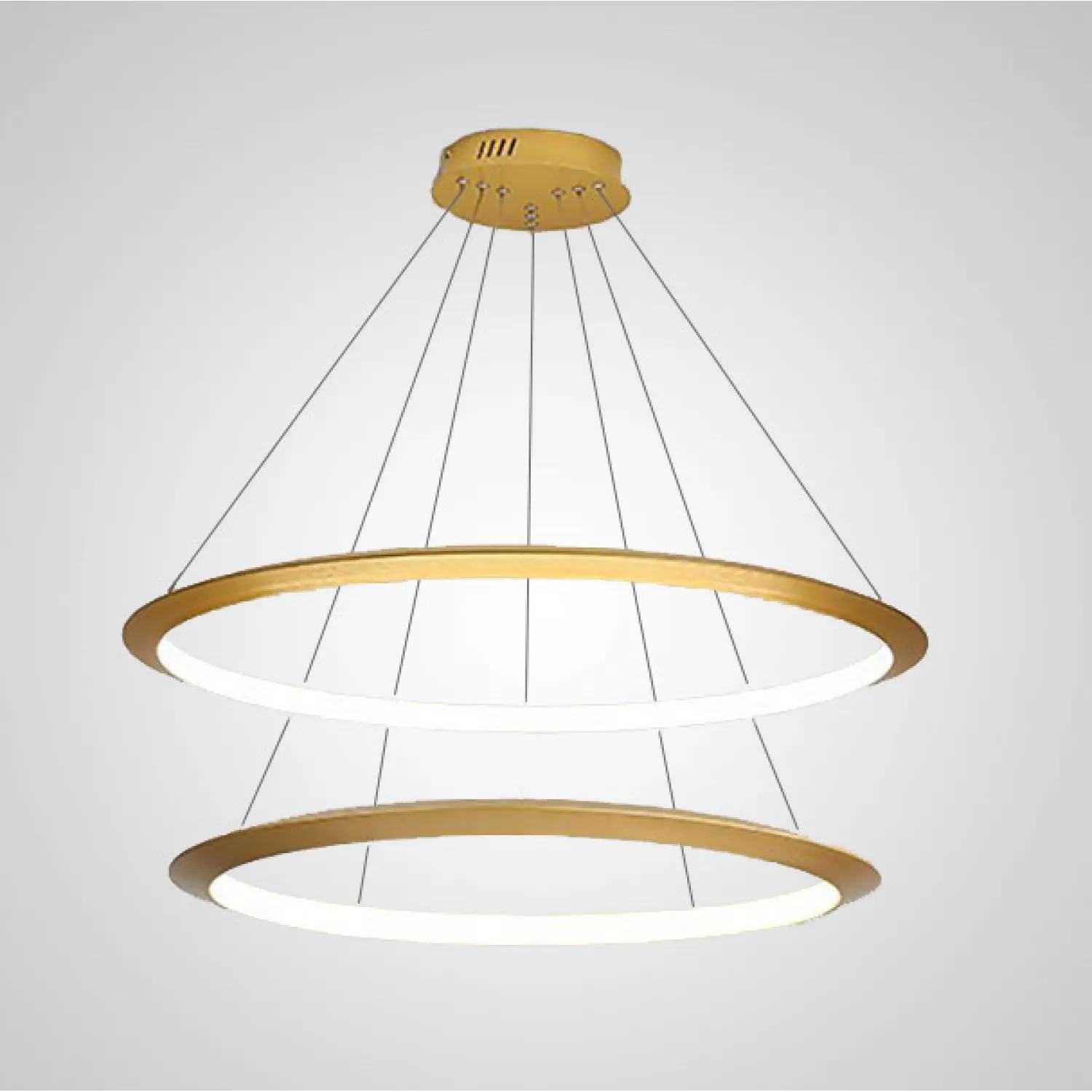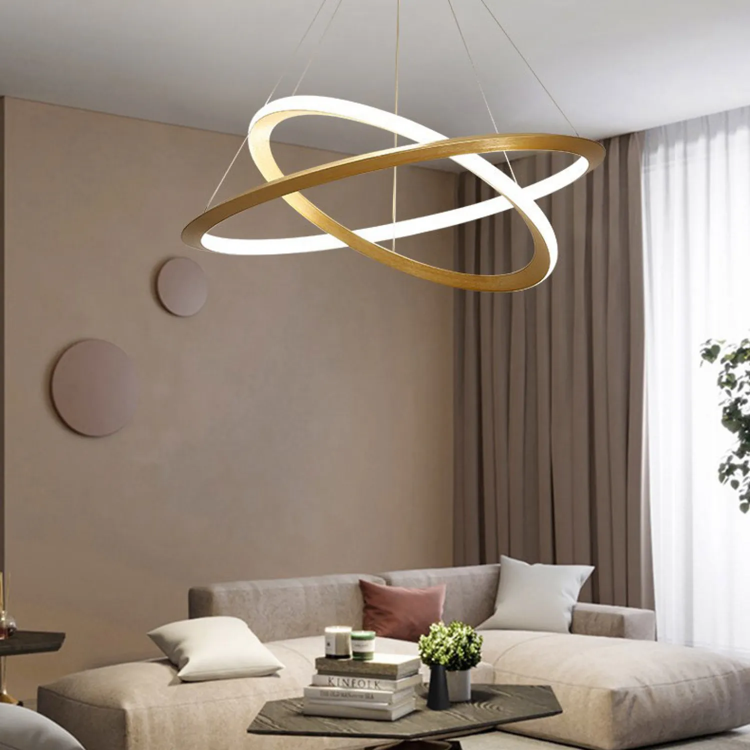 Люстра выполнена в бежевых тонах, которые легко впишутся в любой интерьер. Она имеет трехуровневую конструкцию, состоящую из трех круглых плафонов разного диаметра – 45, 65 и 85 см. Такая композиция создает впечатление легкости и гармонии.