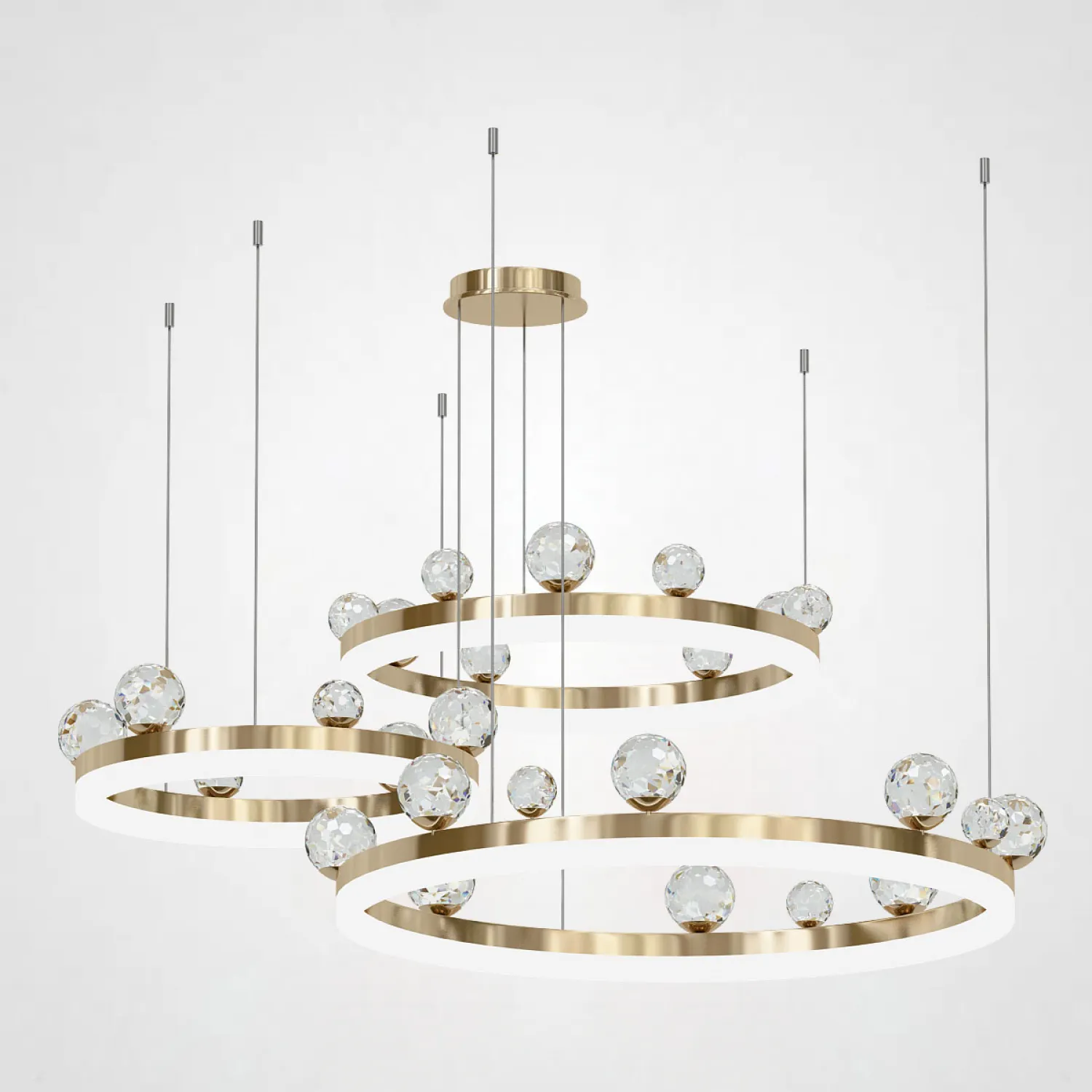 Эта люстра имеет три регулируемых кольца диаметром 40, 60 и 80 см, которые позволяют создать индивидуальный дизайн и настроить освещение под свои потребности. Вы можете выбрать любую комбинацию размеров колец, чтобы достичь оптимального распределения света в помещении.