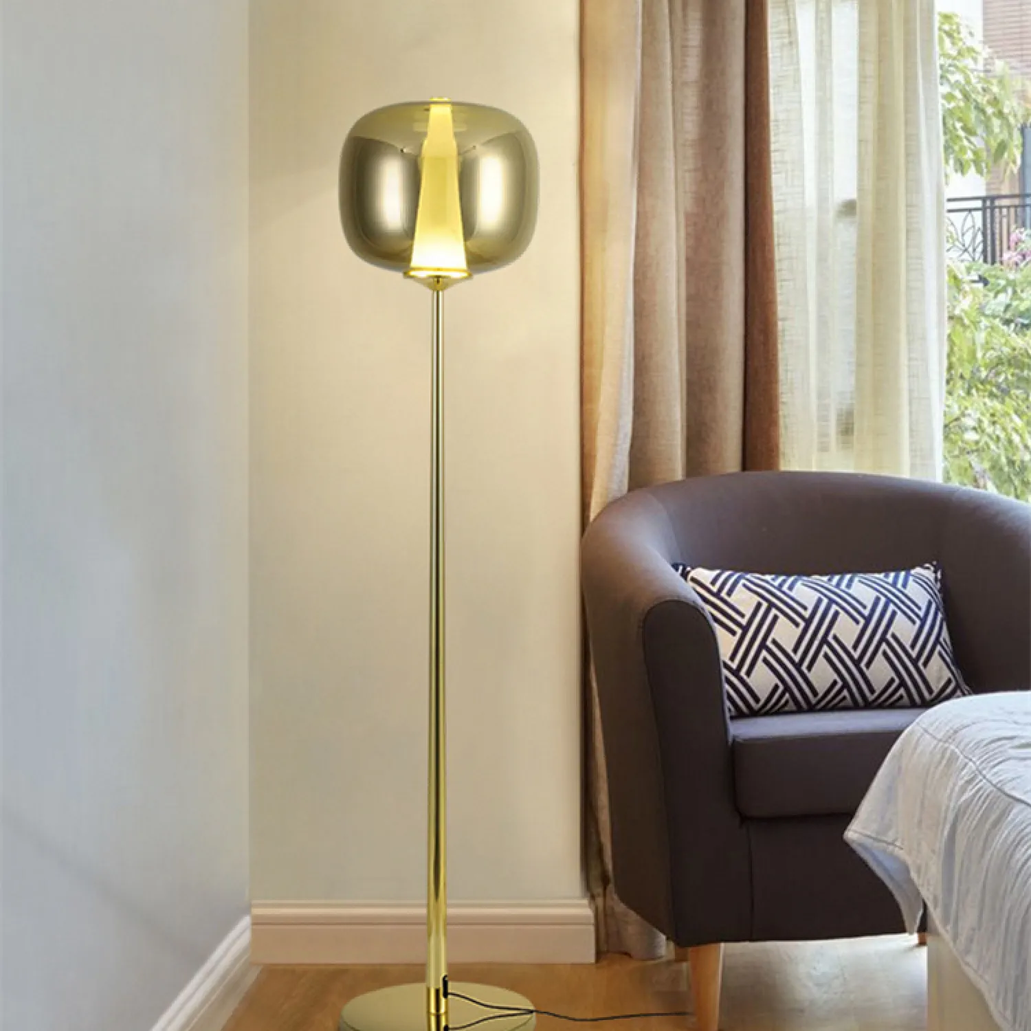 Этот изысканный торшер обладает стильным дизайном в золотистом оттенке, который привнесет изысканность и шарм в любое помещение. Его уникальная конструкция великолепно сочетает в себе функциональность и эстетику, что делает его не только источником света, но и настоящим произведением искусства.