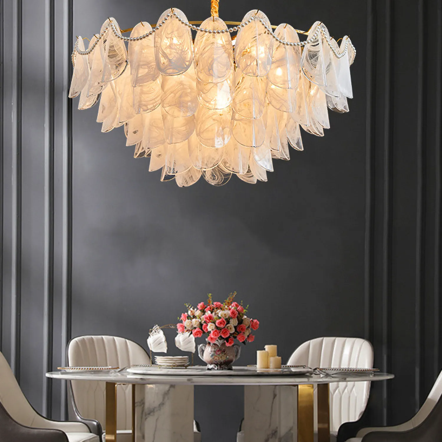 Благодаря своему стильному дизайну и уникальной форме, эта люстра станет центром внимания в любом помещении. Она идеально подойдет для гостиной, столовой или спальни, придавая им особый шарм и роскошь.