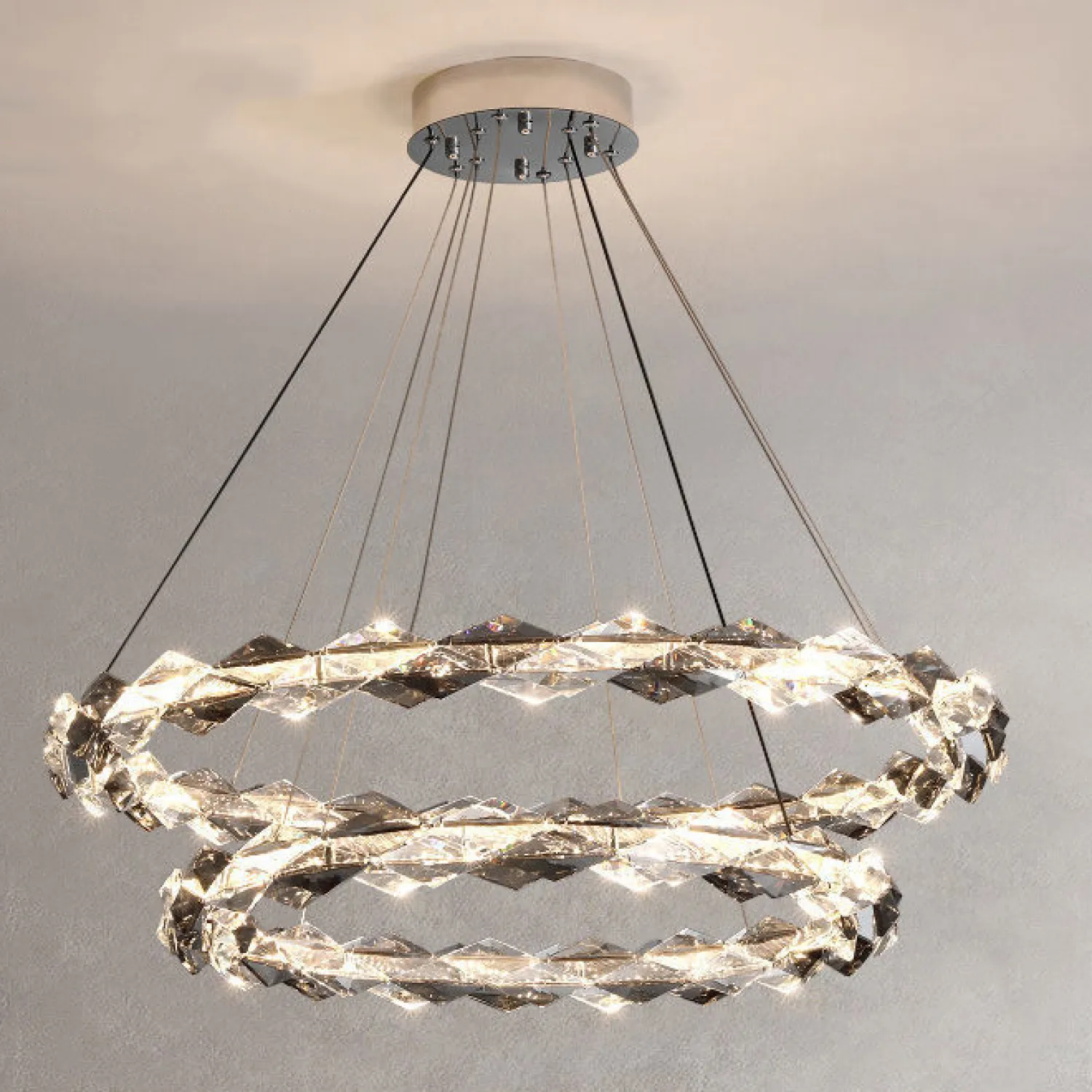 Состоящая из двух круглых плафонов диаметром 60 и 80 см, эта люстра станет ярким акцентом в любой комнате. Благодаря своему размеру она идеально подходит для просторных гостиных, столовых или ресторанов.