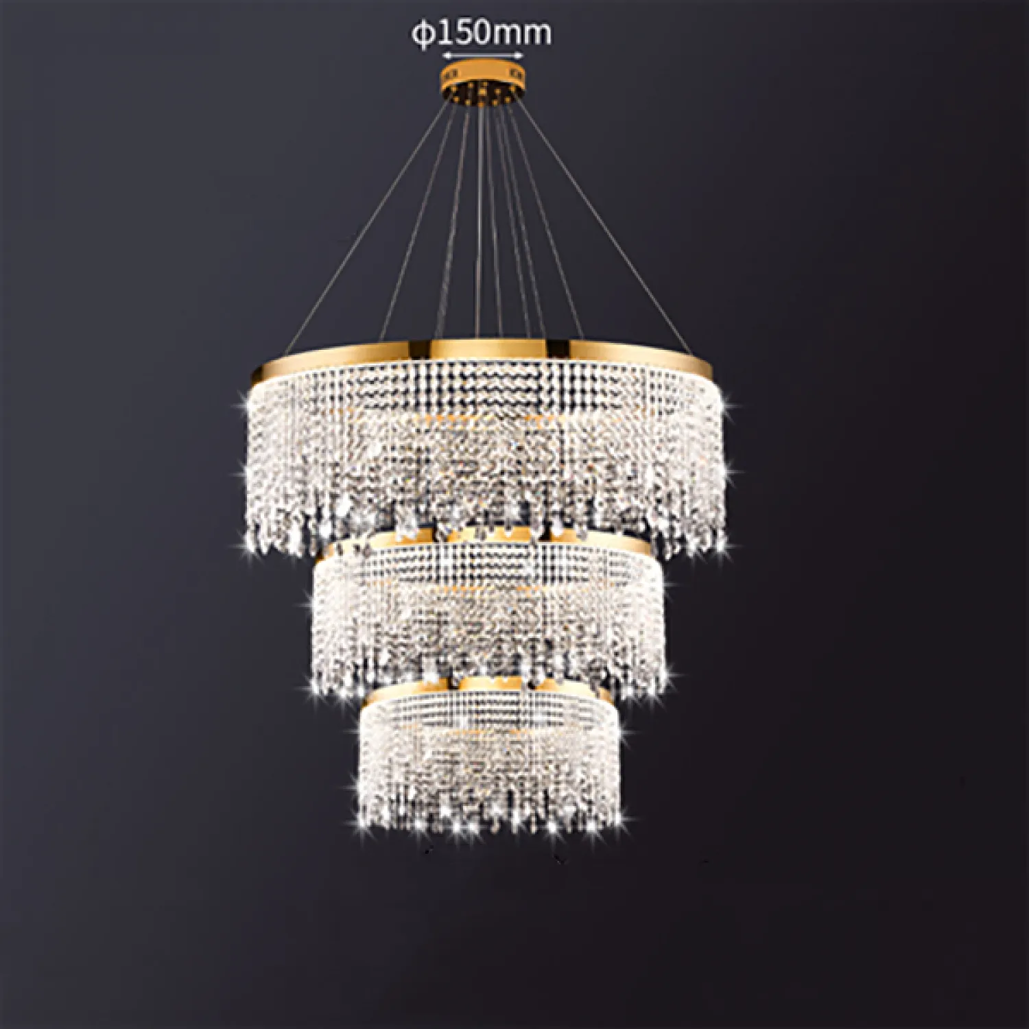 Сочетание трех размеров (диаметром 40, 60 и 80 см) позволяет создать гармоничное освещение в любом помещении. Благодаря своему изысканному дизайну и кристально-прозрачным подвескам из высококачественного стекла, эта люстра привлекает внимание и добавляет шик в любой интерьер.