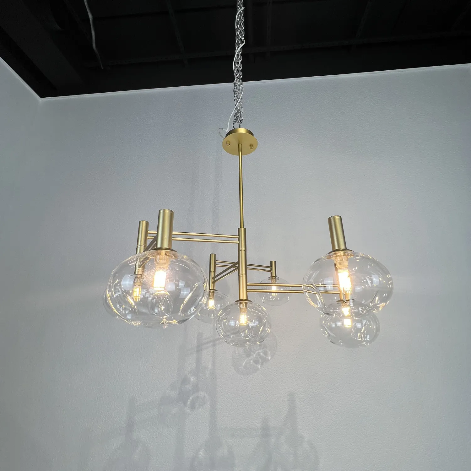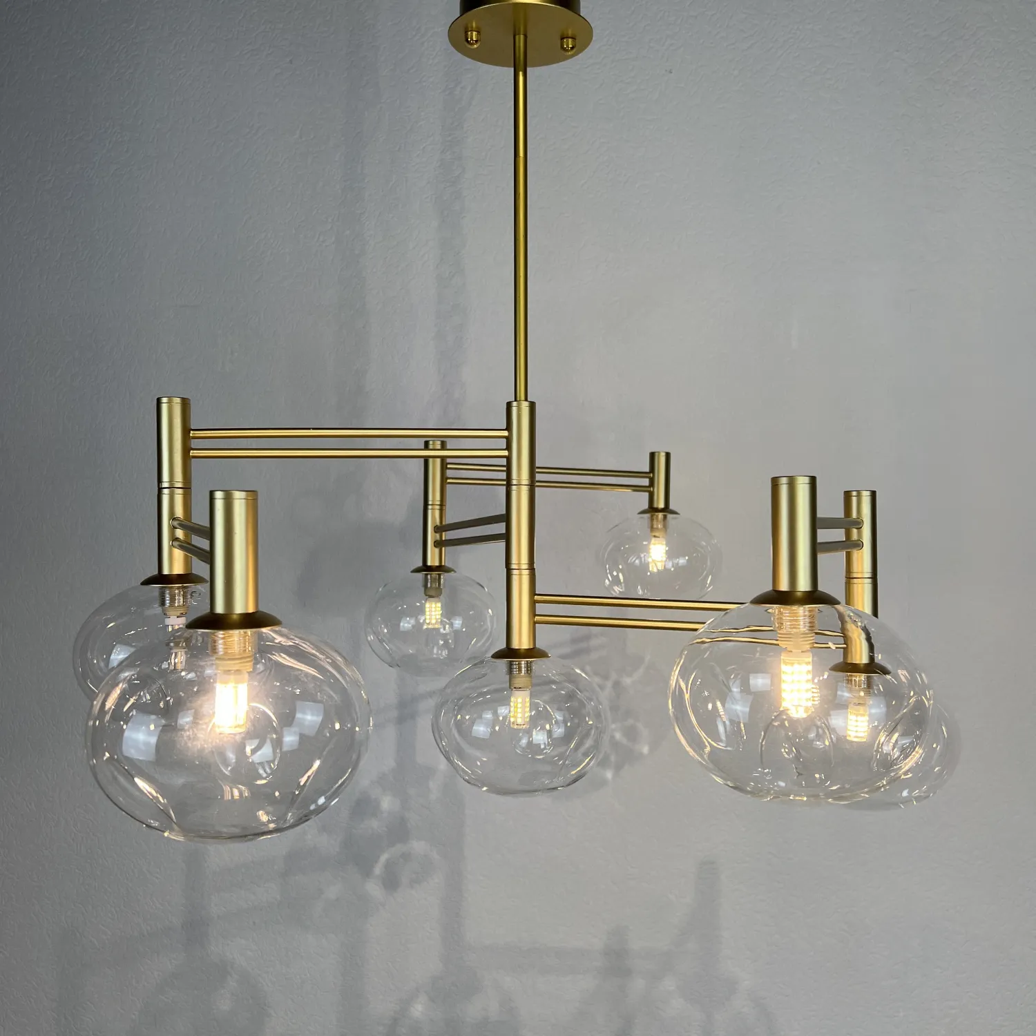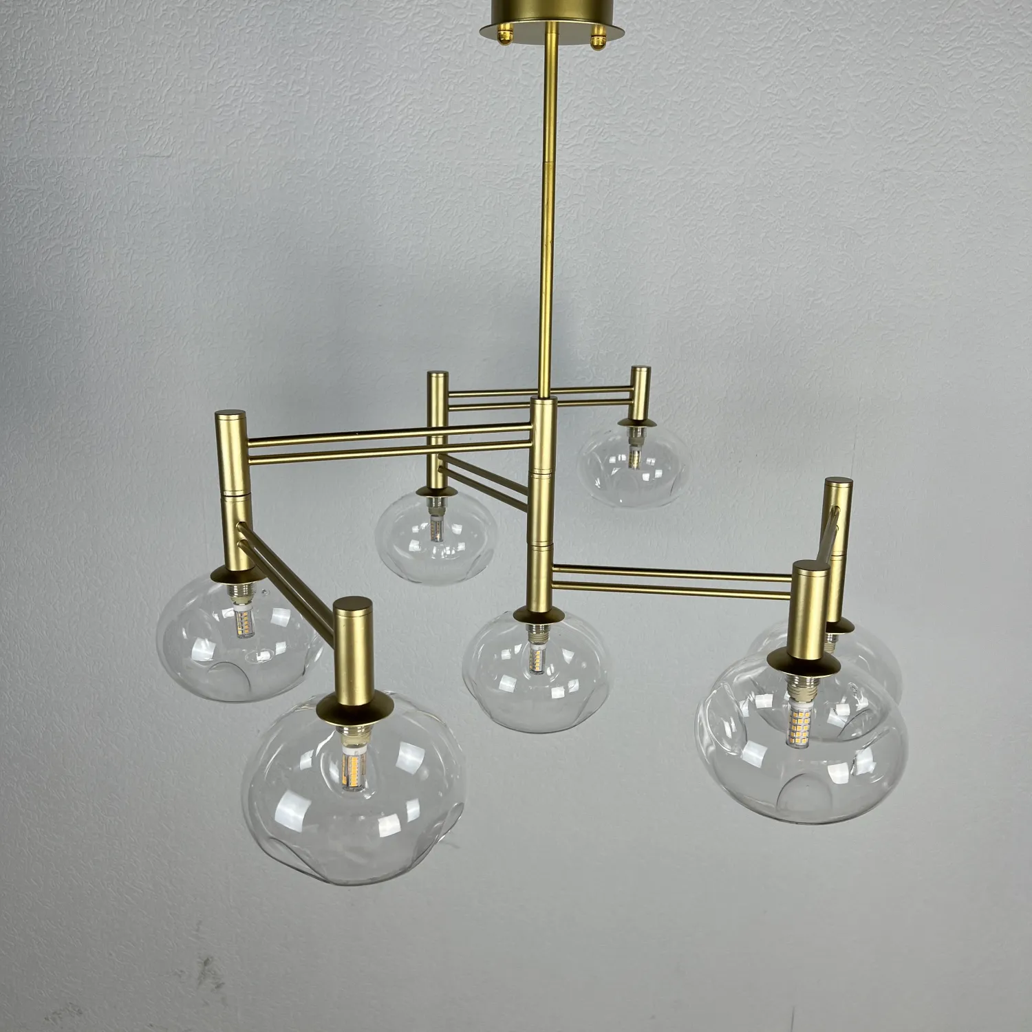 Семь прозрачных плафонов из высококачественного стекла создают прекрасное освещение, распространяя мягкий и яркий свет по всему помещению. Благодаря своей форме и размеру, эта люстра идеально подходит для гостиной, столовой или спальни.