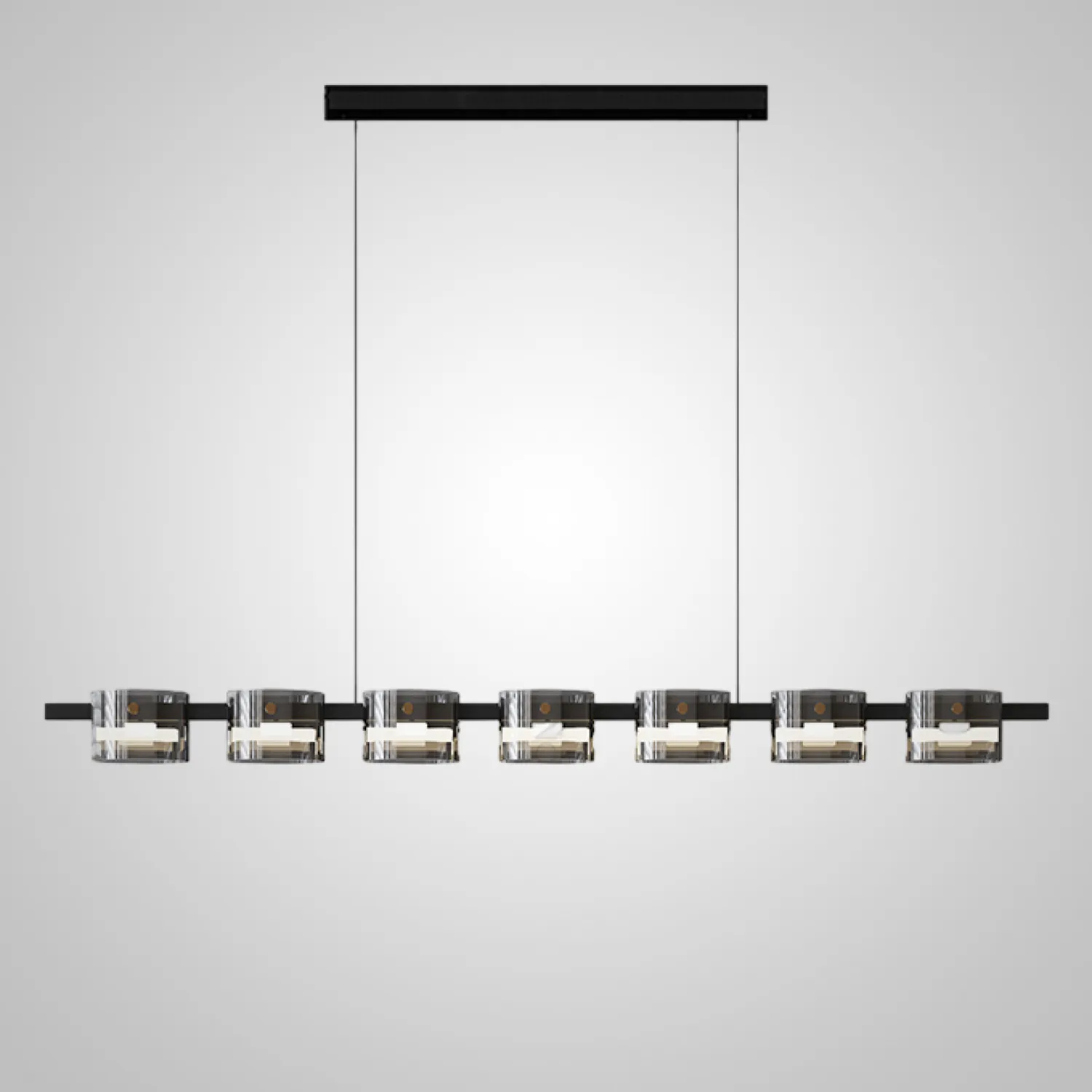 Сочетание прочного металлического каркаса с покрытием из матового хрома и качественного стекла придает светильнику изысканный и современный вид. Его удлиненная форма идеально подходит для освещения больших пространств, таких как столовые, гостиные или офисные помещения.