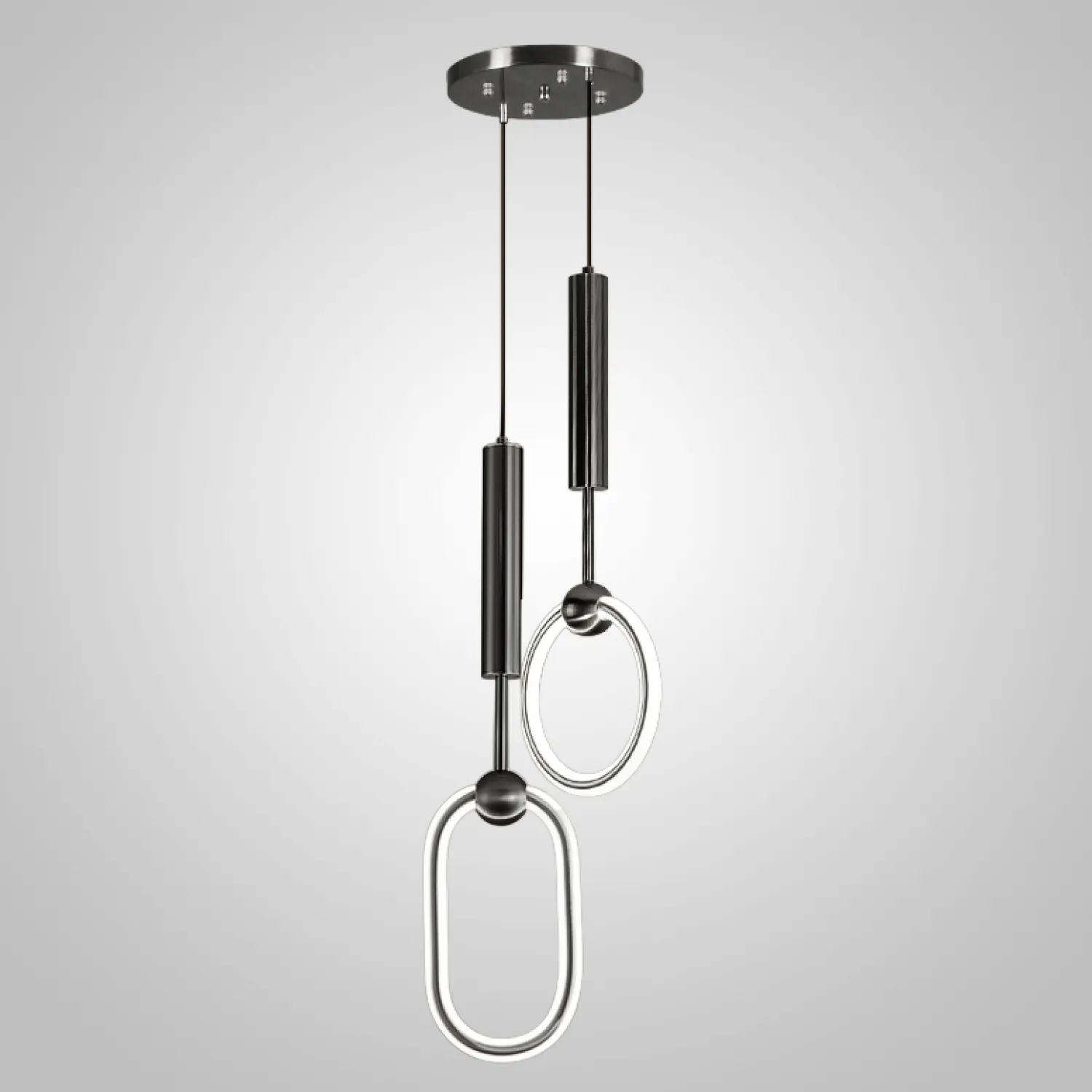 Светильник имеет две подвески, выполненные из высококачественного черного металла, которые создают эффектный и яркий световой акцент. Благодаря своему минималистичному дизайну, он легко впишется в любой стиль интерьера, добавляя ему изысканности и изящности.
