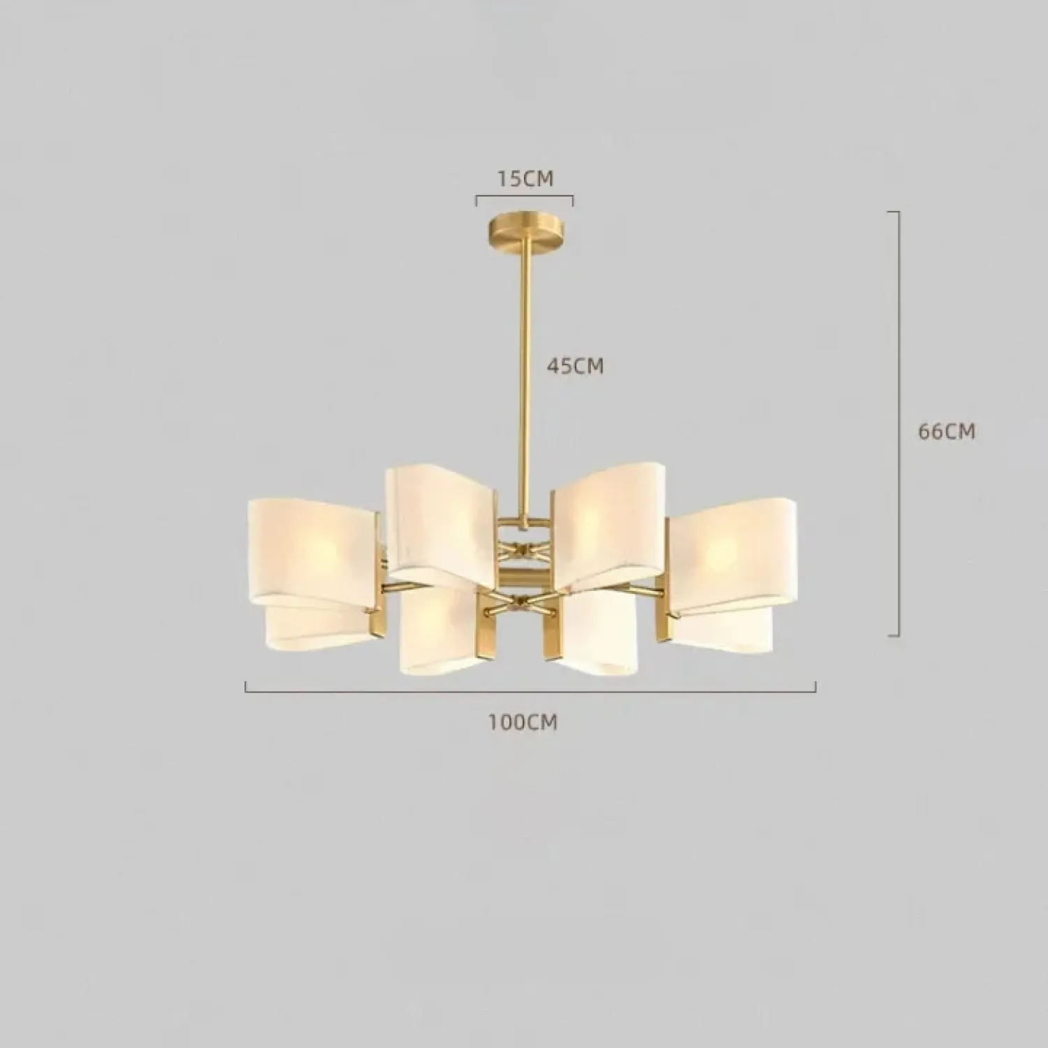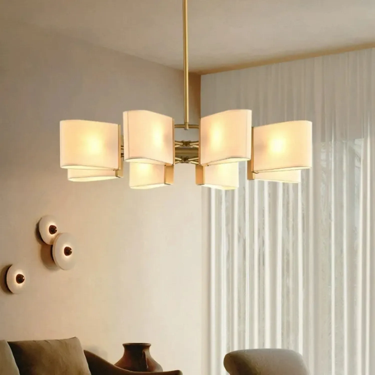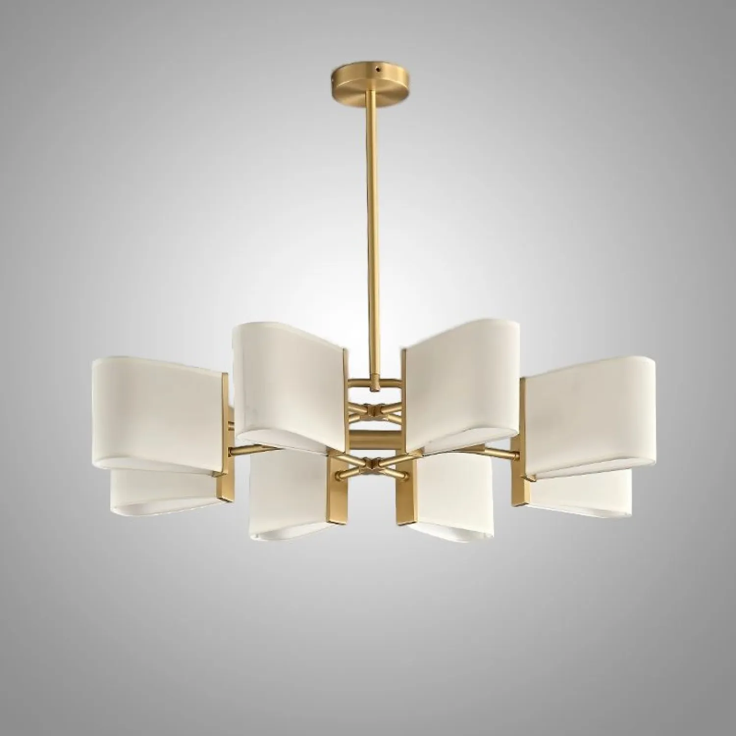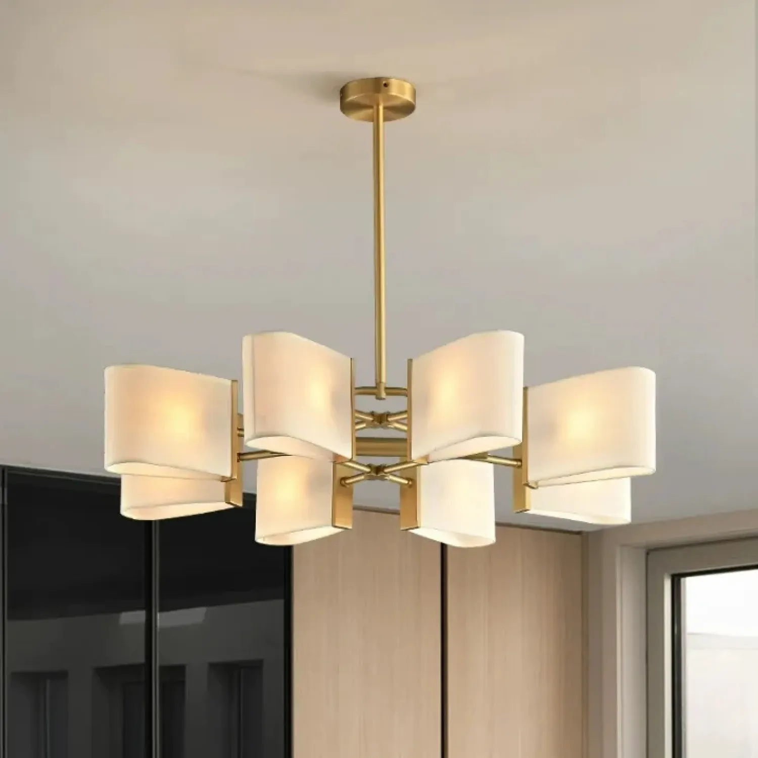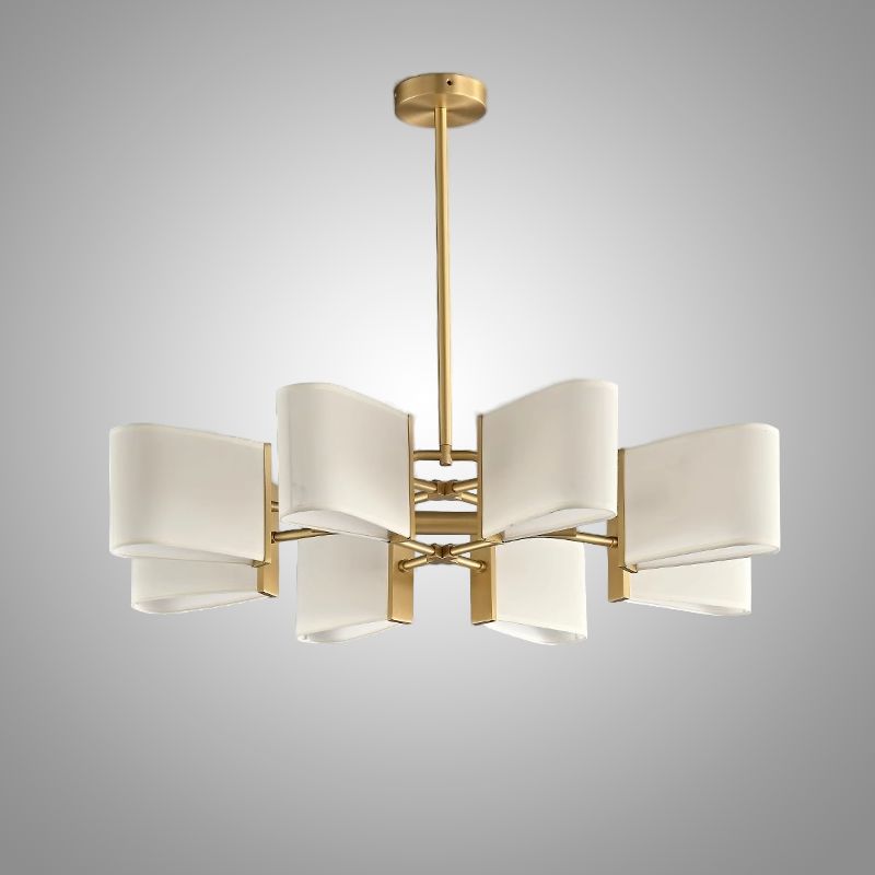 Люстра с прямоугольными текстильными рассеивателями на латунном каркасе станет стильным решением для классического интерьера.