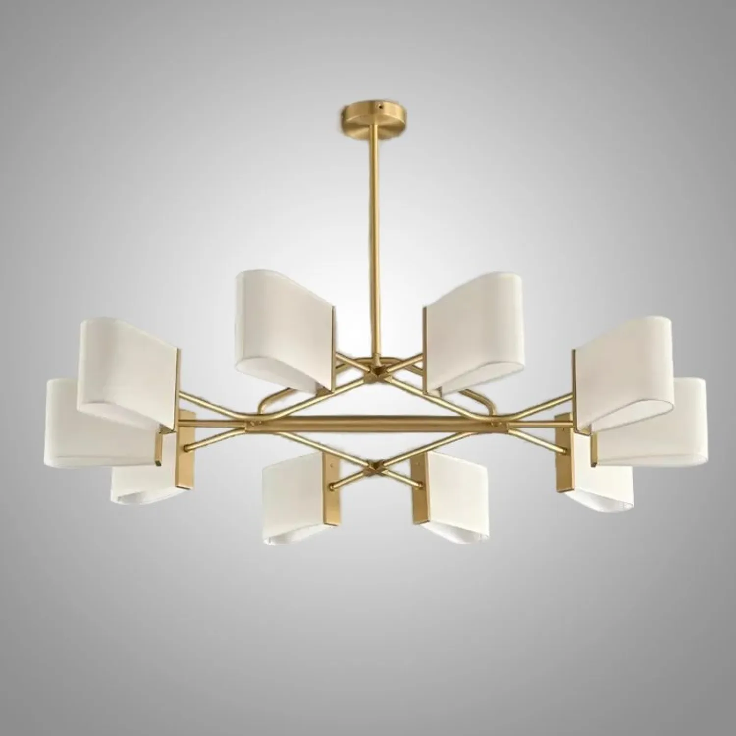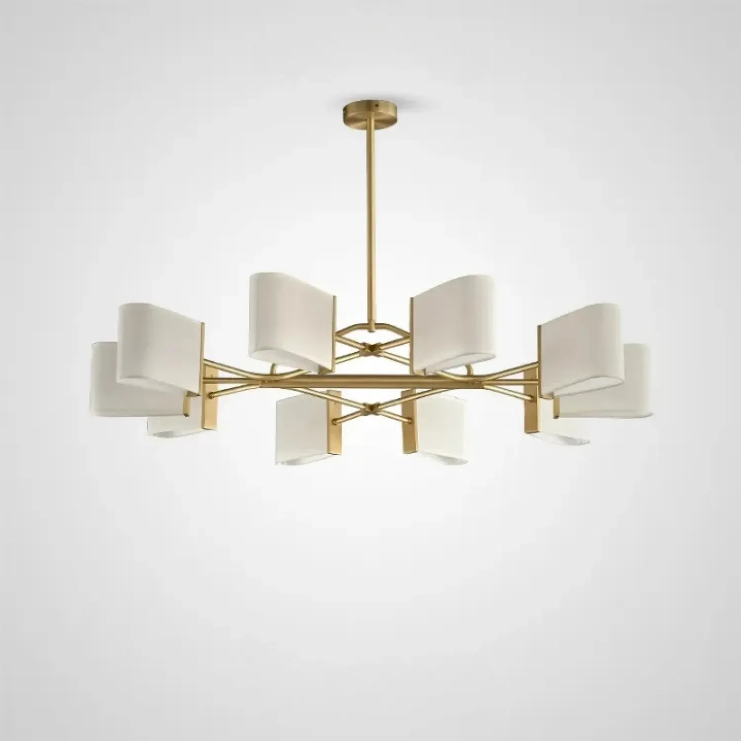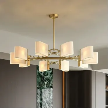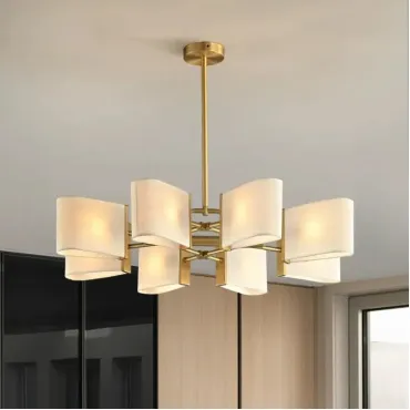 Люстра с прямоугольными текстильными рассеивателями на латунном каркасе станет стильным решением для классического интерьера.