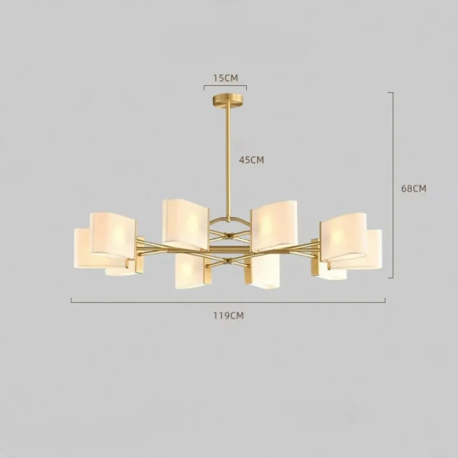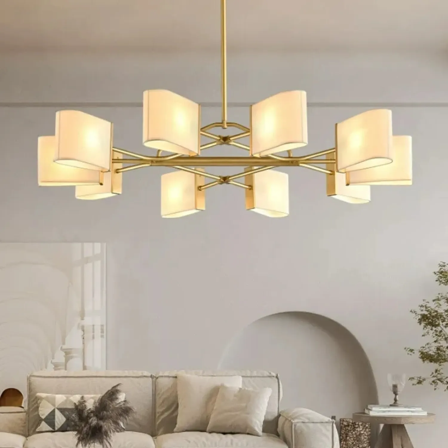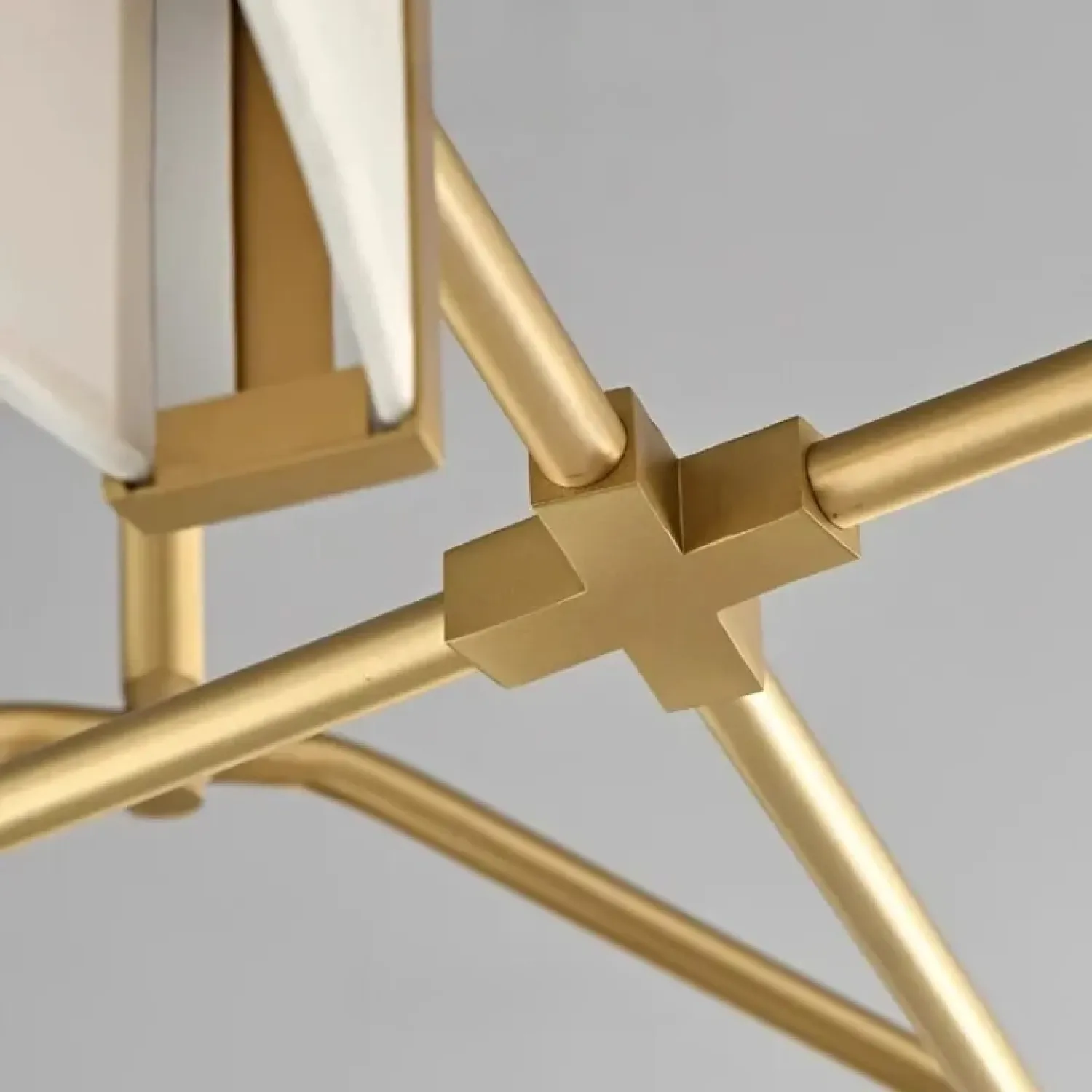 Люстра с прямоугольными текстильными рассеивателями на латунном каркасе станет стильным решением для классического интерьера.