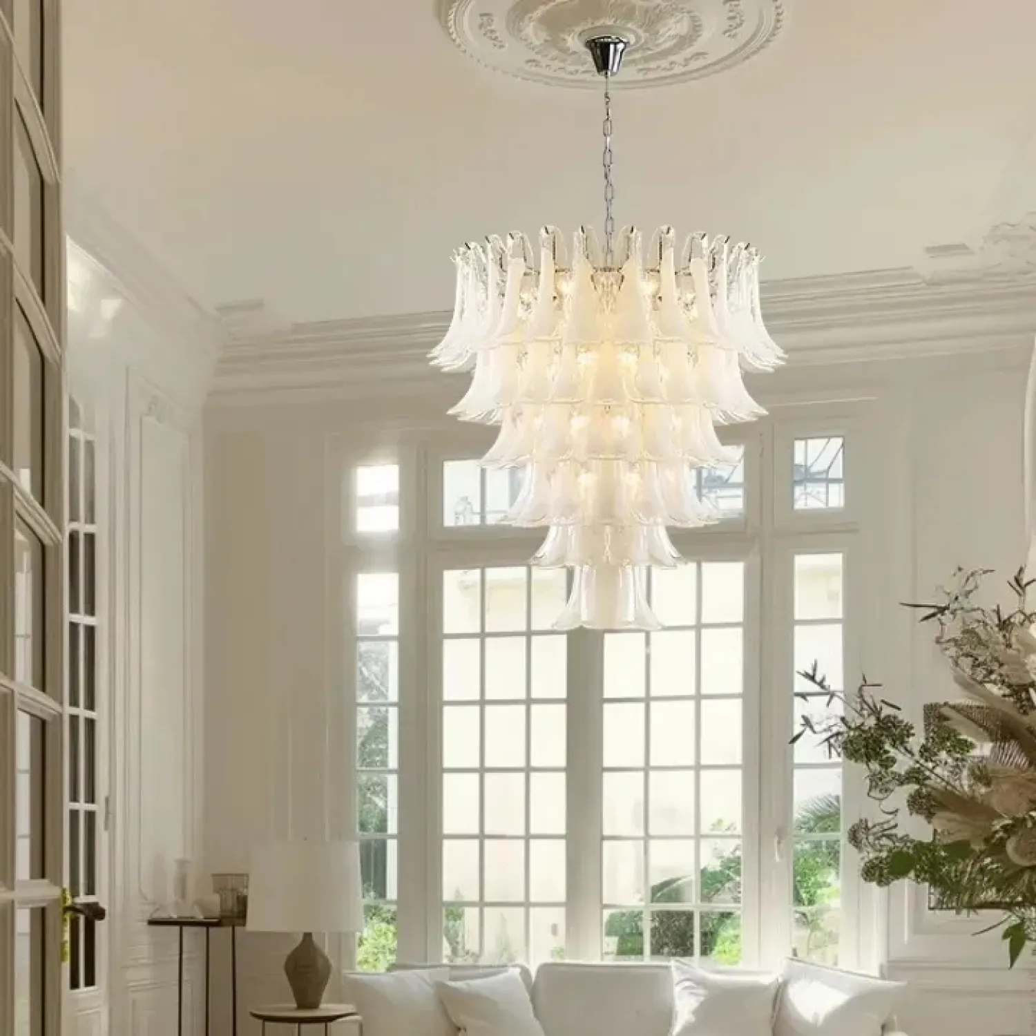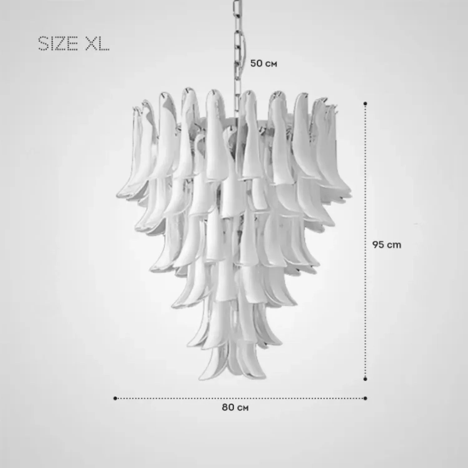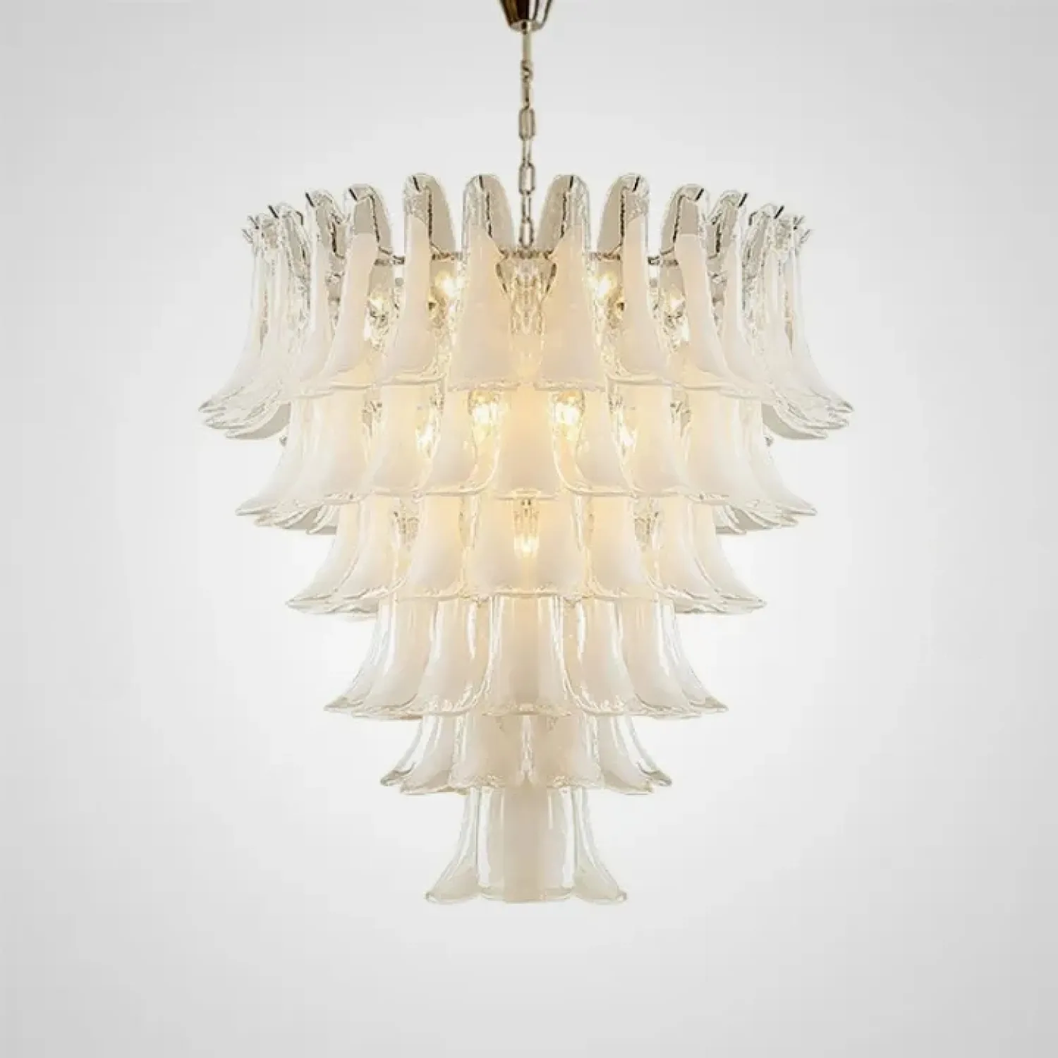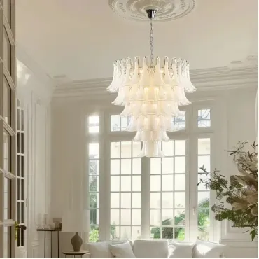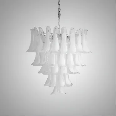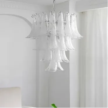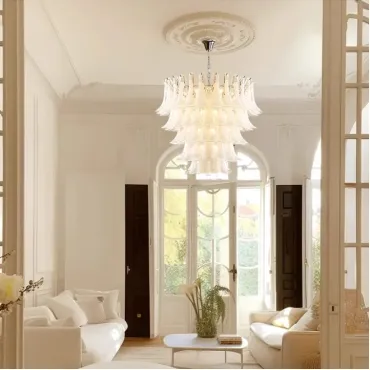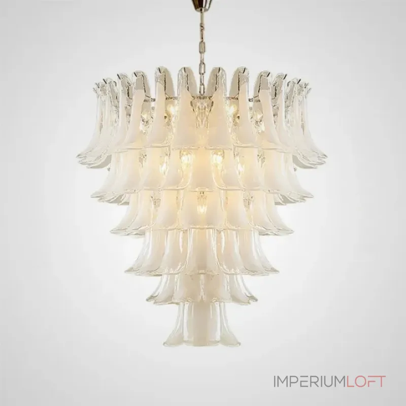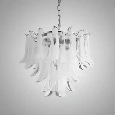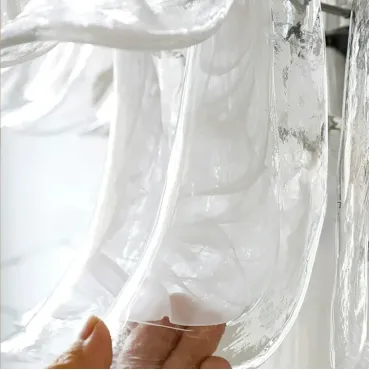 Люстра с каскадом прозрачных стеклянных пластин с молочными включениями. Оттенок цвета и узор могут отличаться от фото из-за нюансов обжига стекла и температурных условий при использовании красителей.