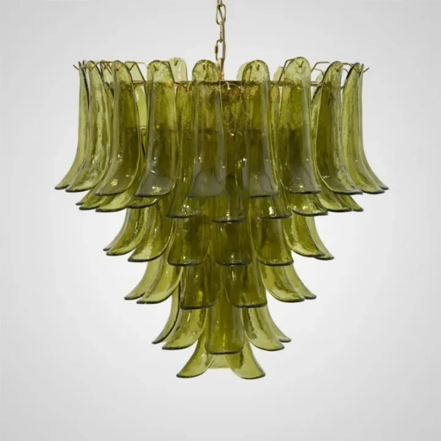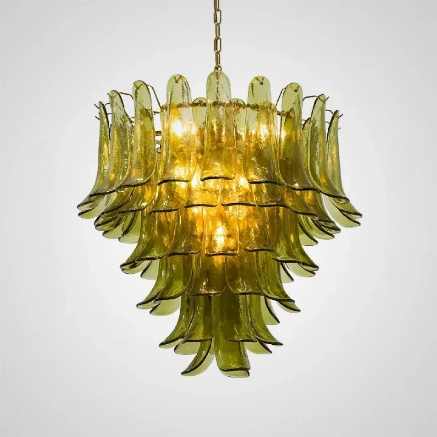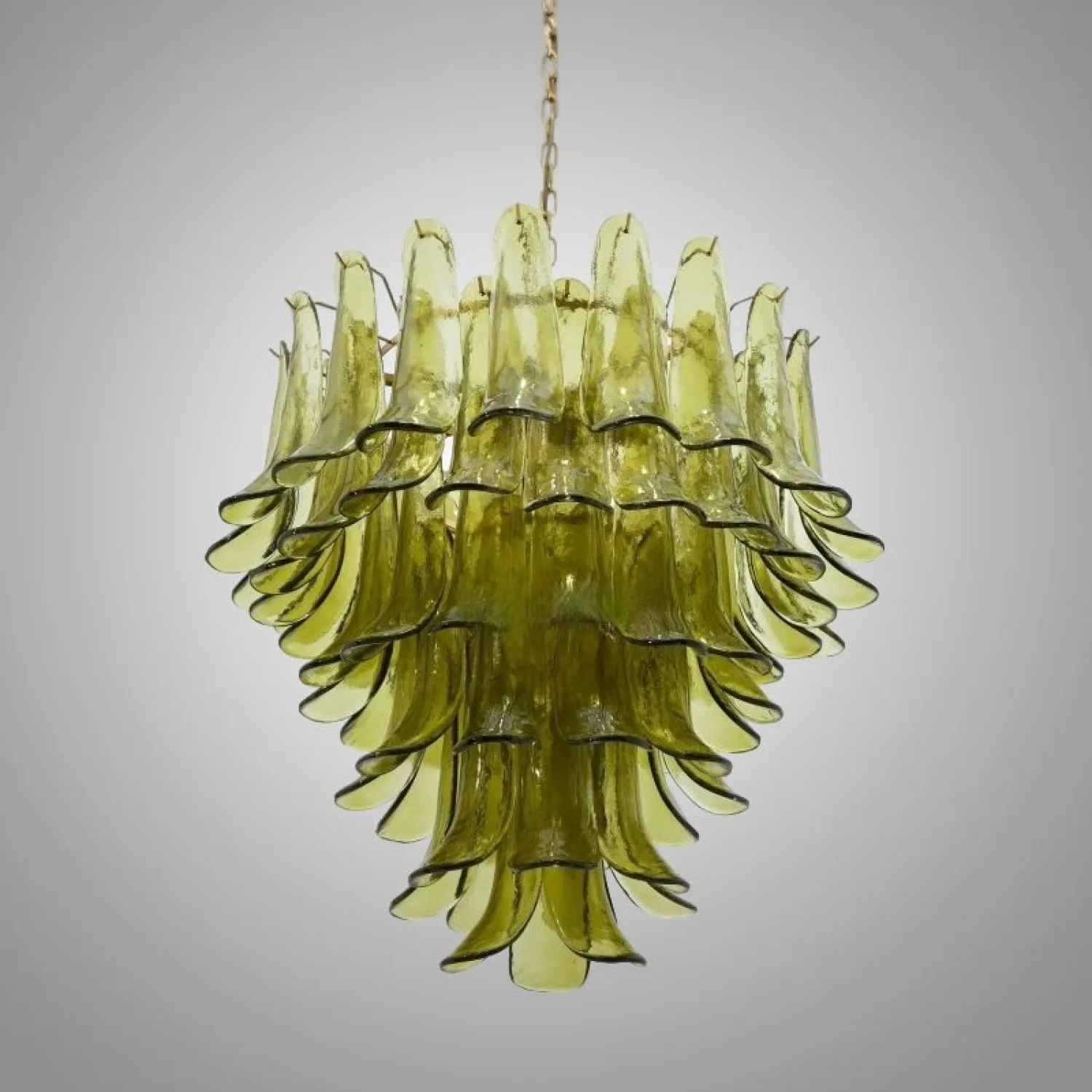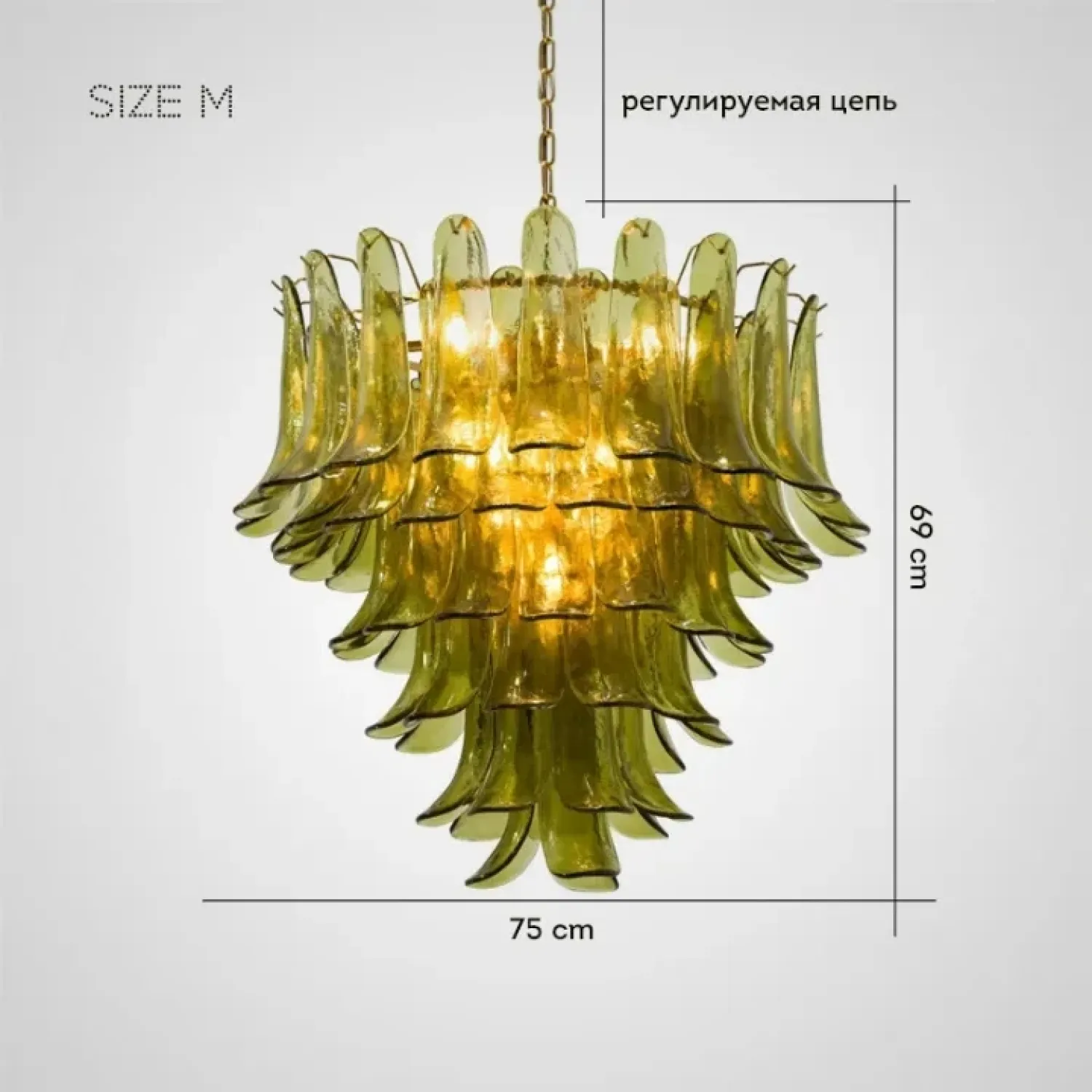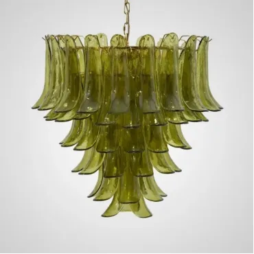 Люстра с каскадом стеклянных пластин зеленого цвета. Оттенок может немного отличаться от фотографий из-за особенностей обжига и температуры при использовании красителей.