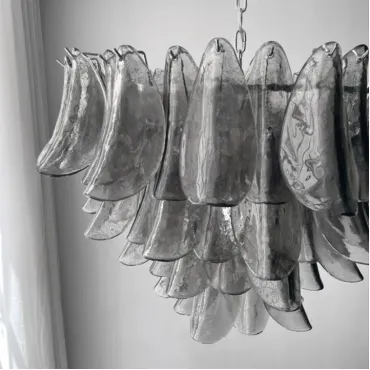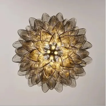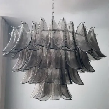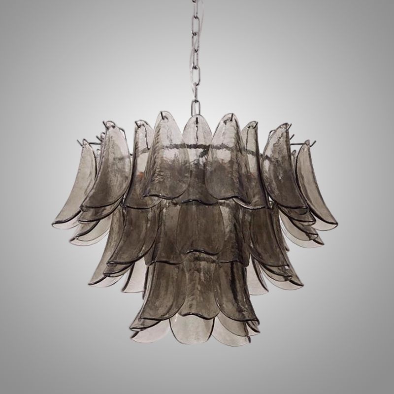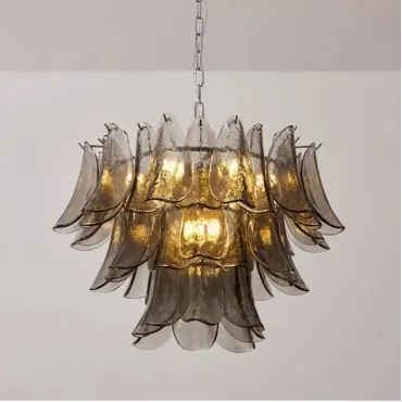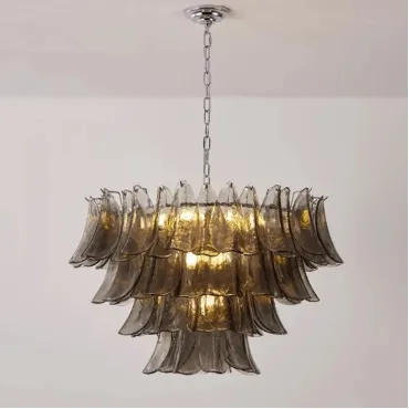 Люстра с каскадом дымчатых стеклянных пластин. Оттенок цвета пластин может отличаться от показанного на фото из-за особенностей обжига и взаимодействия с красителями.
