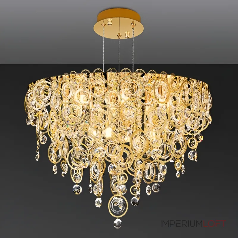 Люстра ILMO — это воплощение утонченности и богатства. Изготовленная из металла насыщенного золотого оттенка, она украшена миллионами кристаллов Swarovski, что придает ей роскошный и изысканный вид. Ее уникальный дизайн с крупными кольцами и хрустальными подвесками становится эффектным акцентом в интерьере, подчеркивая как стиль лофт, так и классическую элегантность. Мягкий рассеянный свет и декоративные элементы создают уютную атмосферу с теплыми отблесками, подходящими для гостиной или столовой.