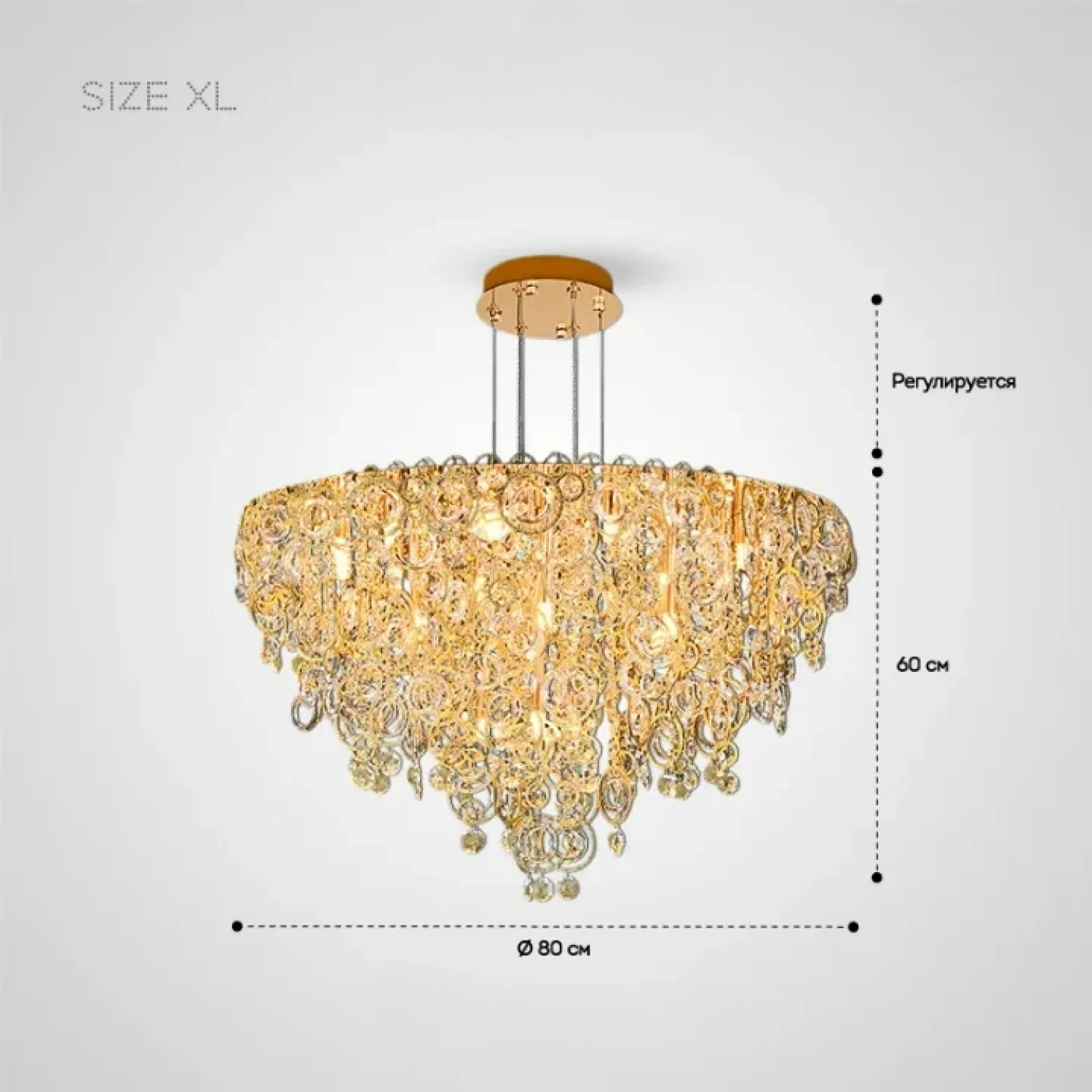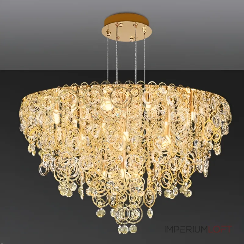 Люстра ILMO — это воплощение утонченности и богатства. Изготовленная из металла насыщенного золотого оттенка, она украшена миллионами кристаллов Swarovski, что придает ей роскошный и изысканный вид. Ее уникальный дизайн с крупными кольцами и хрустальными подвесками становится эффектным акцентом в интерьере, подчеркивая как стиль лофт, так и классическую элегантность. Мягкий рассеянный свет и декоративные элементы создают уютную атмосферу с теплыми отблесками, подходящими для гостиной или столовой.