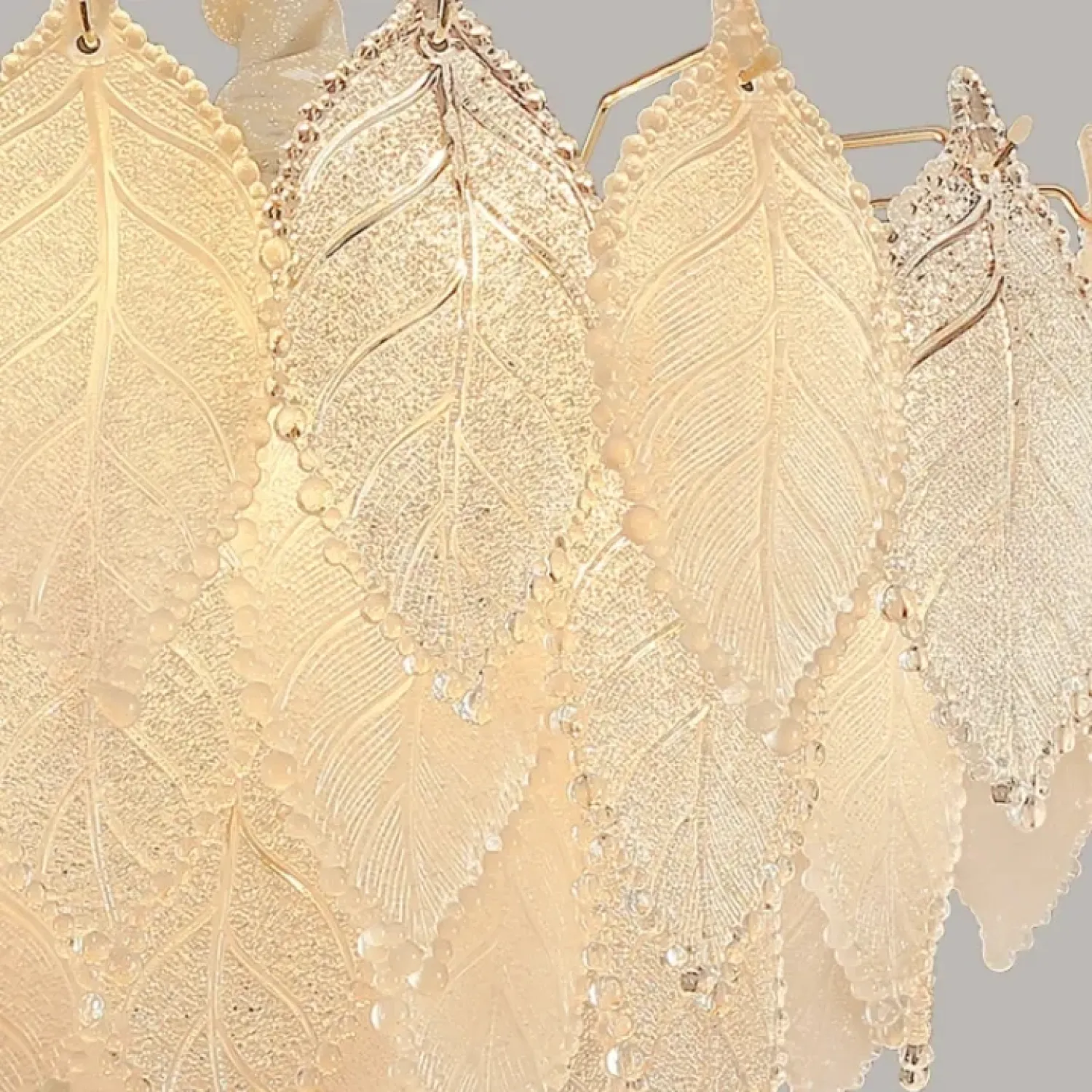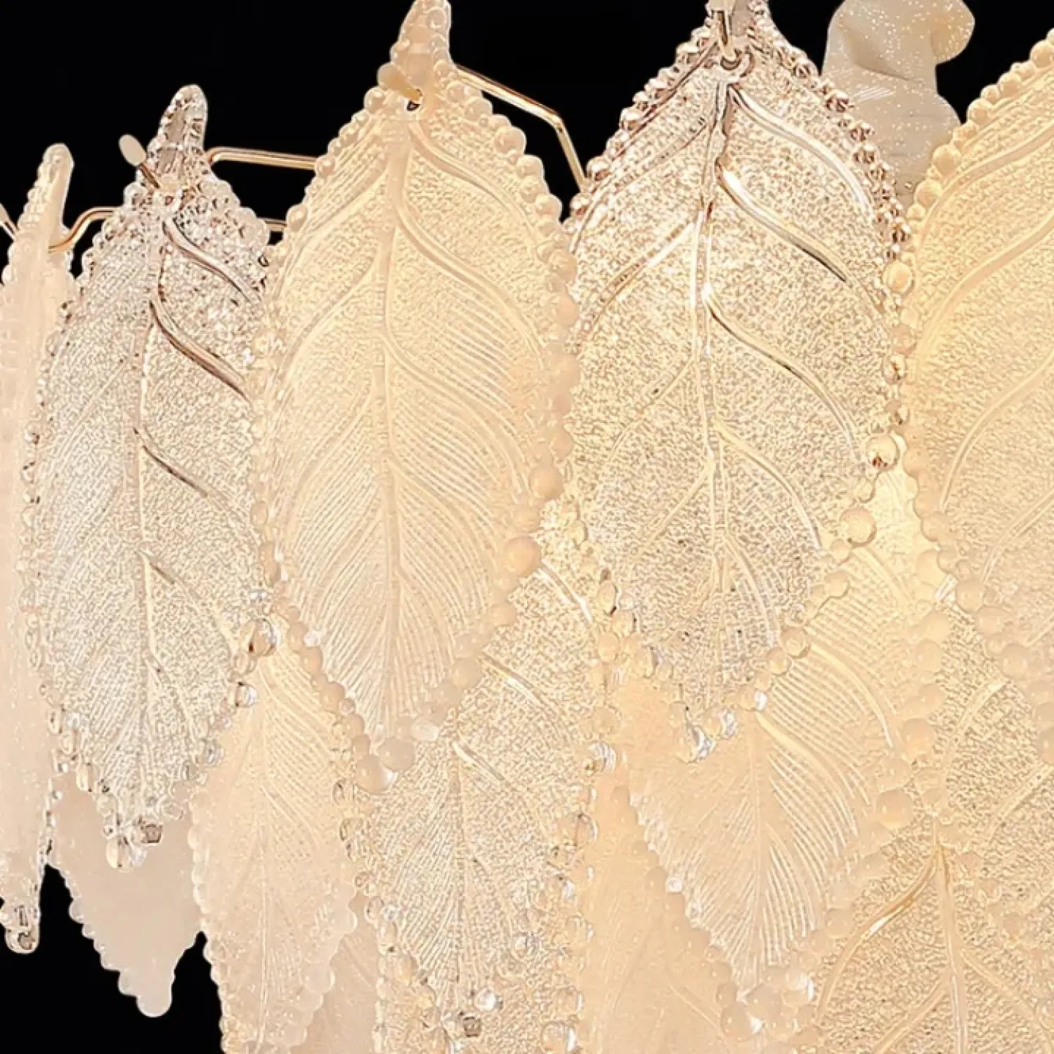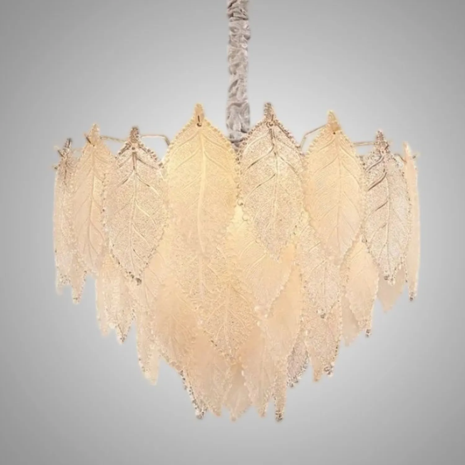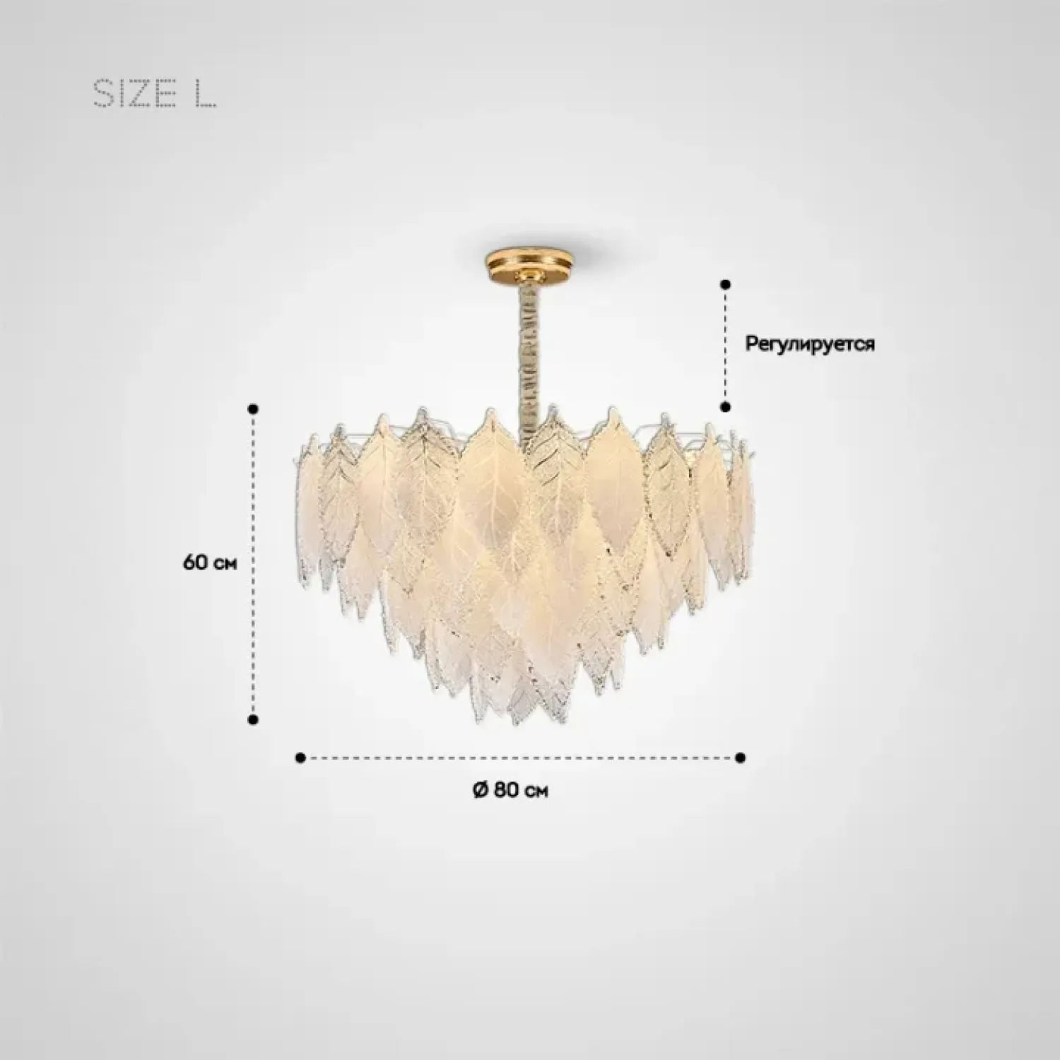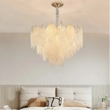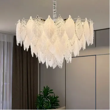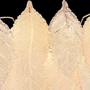 Люстра из прозрачных и матовых стеклянных листьев с многоярусным абажуром сочетает лофт и скандинавский стиль. Диаметр 50 см, высота 44 см. Золотой металлический каркас с элементами из стекла. Рассеивает мягкий свет, создавая уютную атмосферу. Подходит для современного, нейтрального или ретро-интерьера.