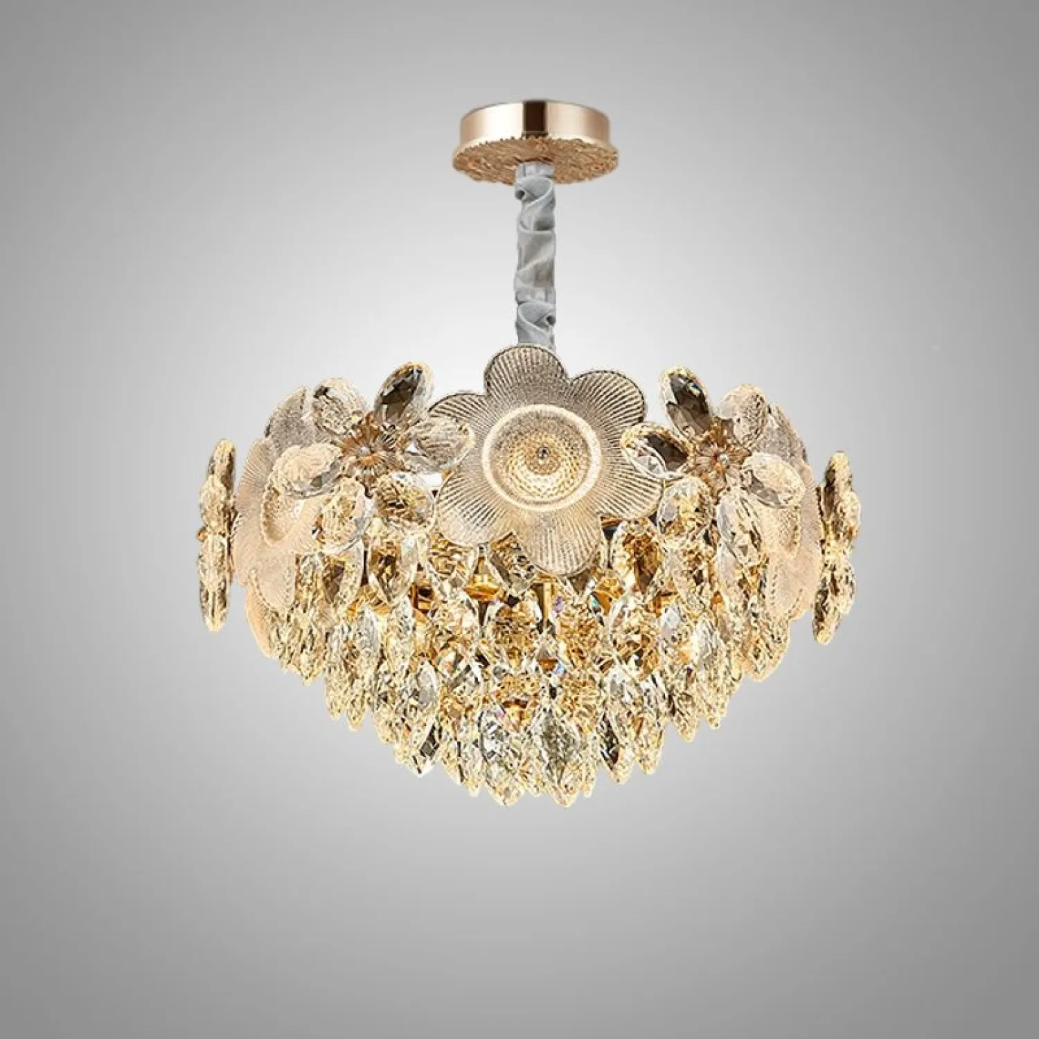 Люстра EGEL-PAW из многоярусных абажуров с хрустальными подвесками подходит для современного лофта, скандинавского или классического стиля. Изготовлена из металла и хрусталя K9 в золотистом цвете.. Регулируемый подвес до 80 см. Мягкое свечение создает уют и тепло.