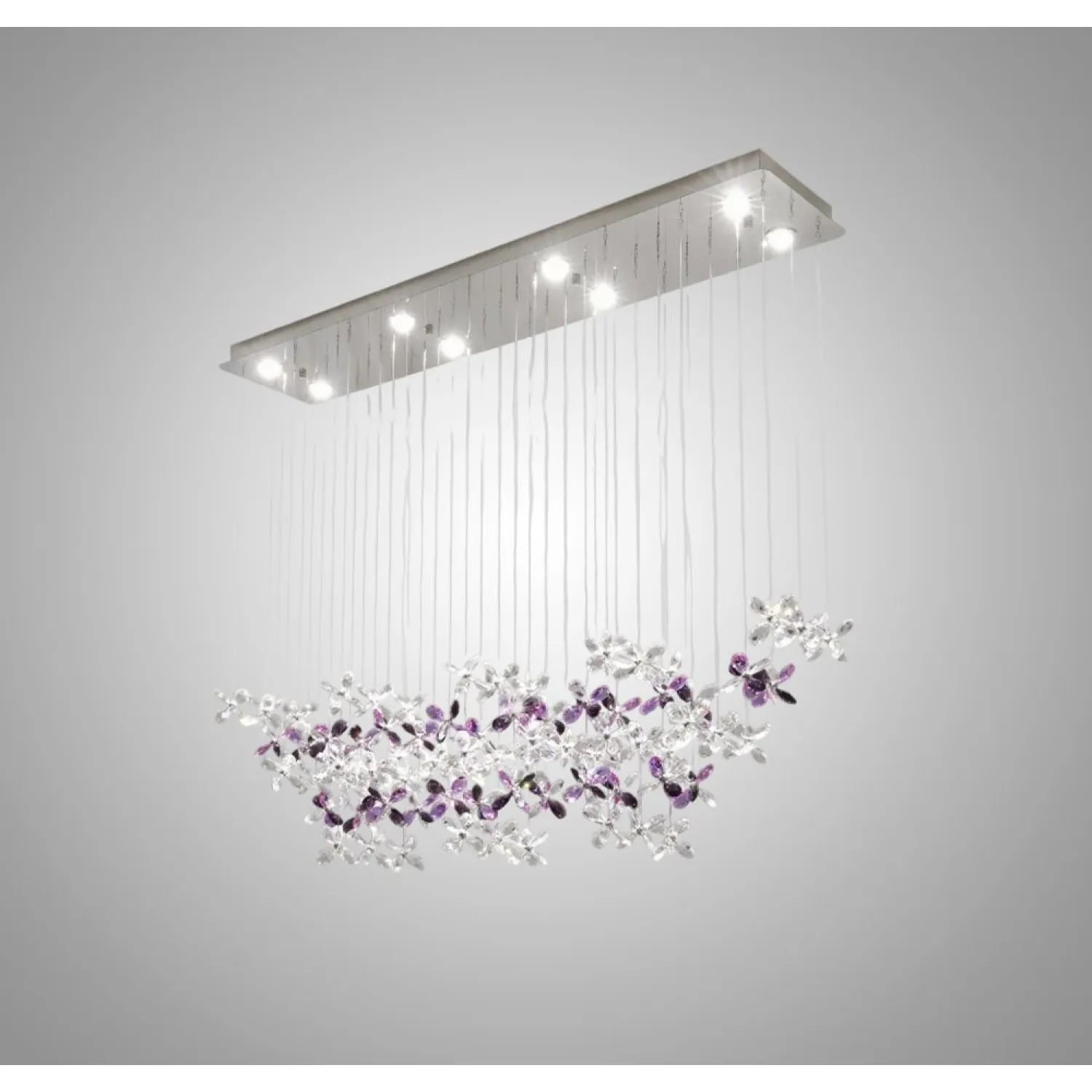 Дизайнерская люстра CHARA AMETHYST IN из металла и хрусталя в хромированном цвете добавит изысканности интерьеру в стиле лофт, скандинавском или классическом. Уникальная форма с подвесными кристаллами создает мягкое освещение. Подходит для просторных помещений, подчеркивая качество материалов и современную светодиодную технологию с трехцветным RGB-светом. Идеально для интерьеров со светодиодами, создавая уютную атмосферу.