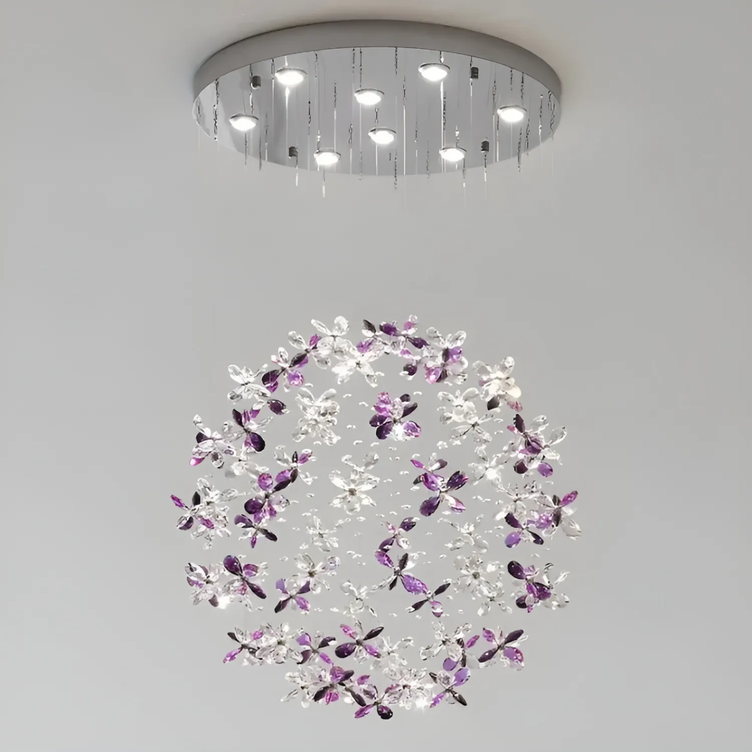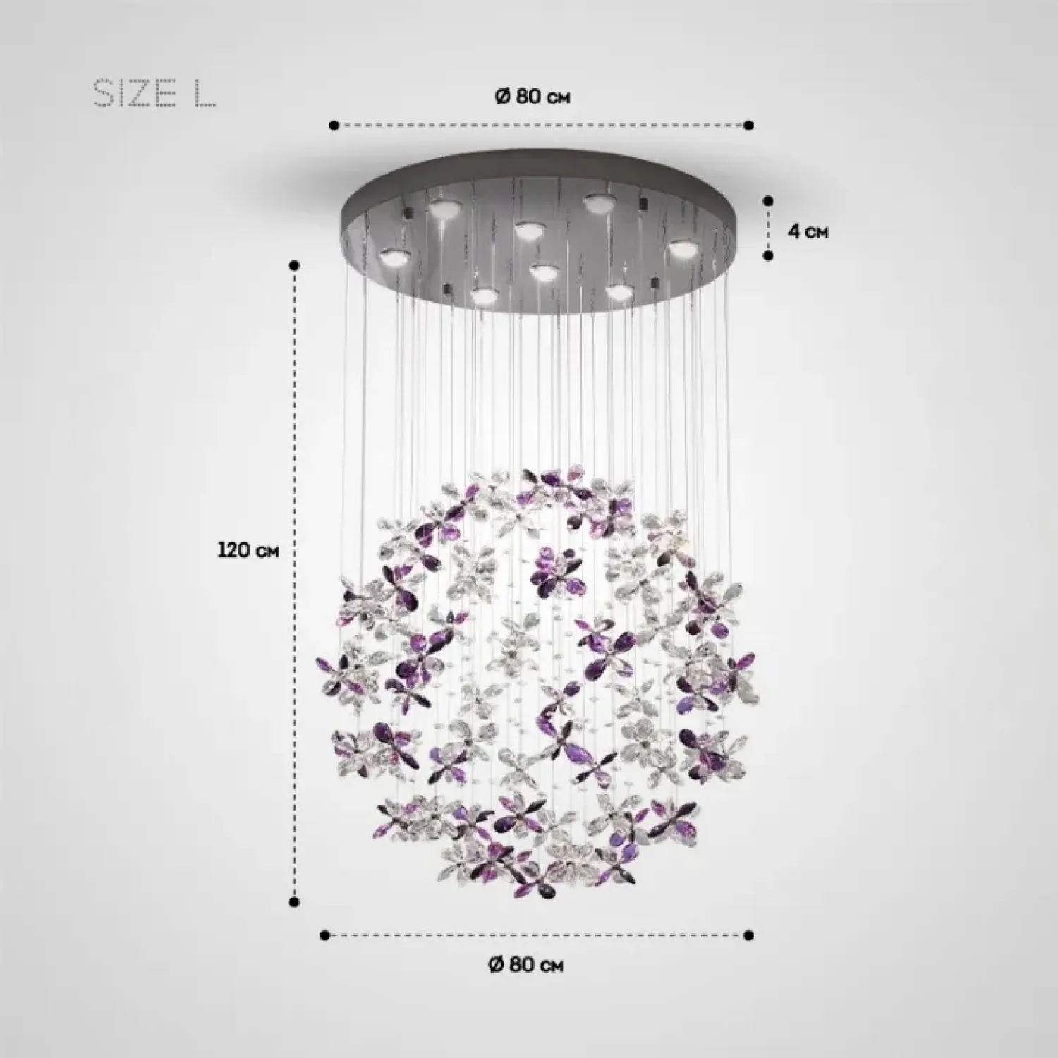 Дизайнерская люстра CHARA AMETHYST из металла и хрусталя в хромированном цвете добавит изысканности интерьеру в стиле лофт, скандинавском или классическом. Уникальная форма с подвесными кристаллами создает мягкое освещение. Подходит для просторных помещений, подчеркивая качество материалов и современную светодиодную технологию с трехцветным RGB-светом. Идеально для интерьеров со светодиодами, создавая уютную атмосферу.