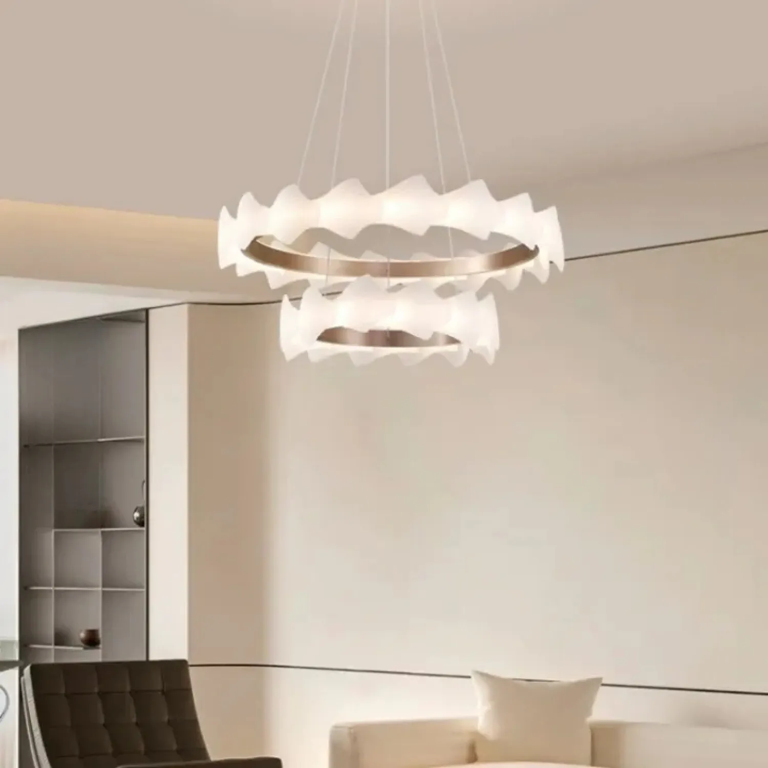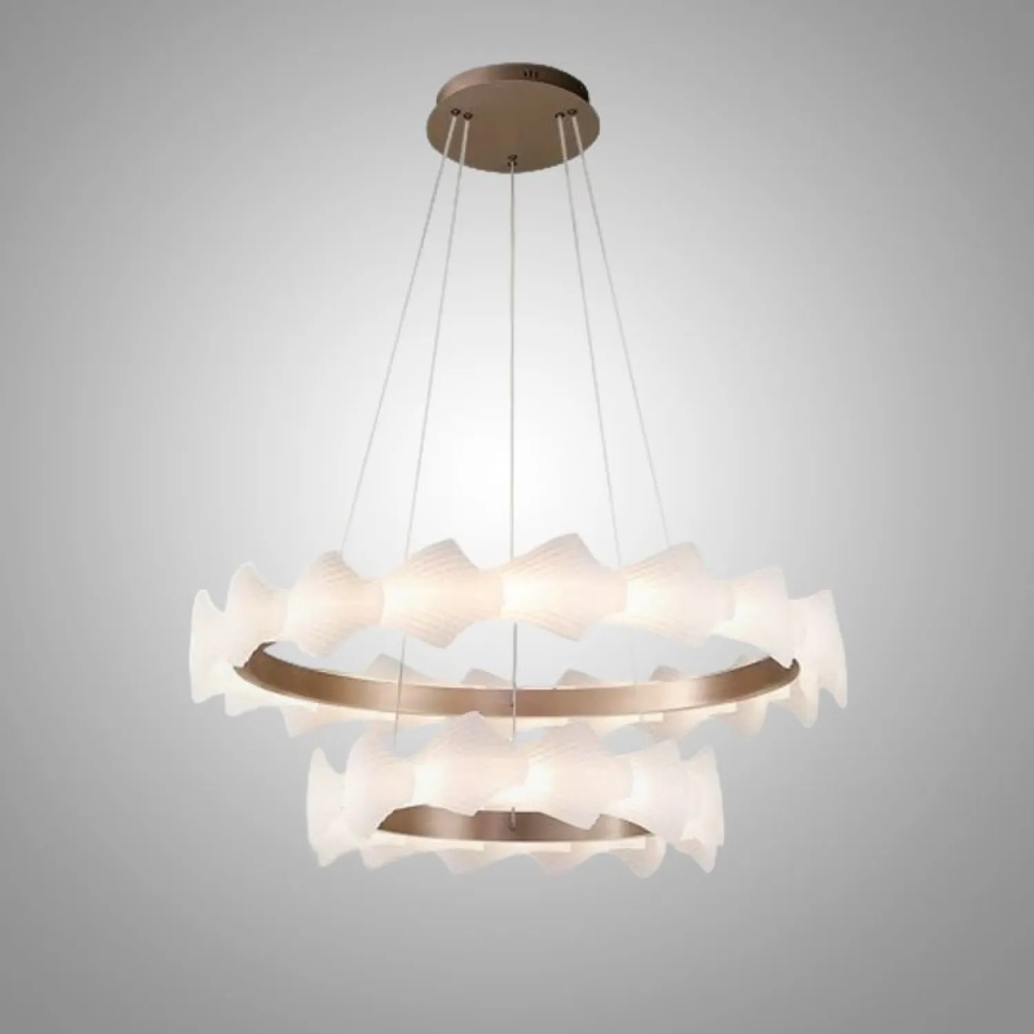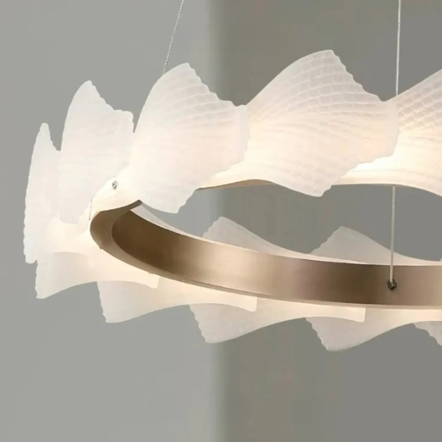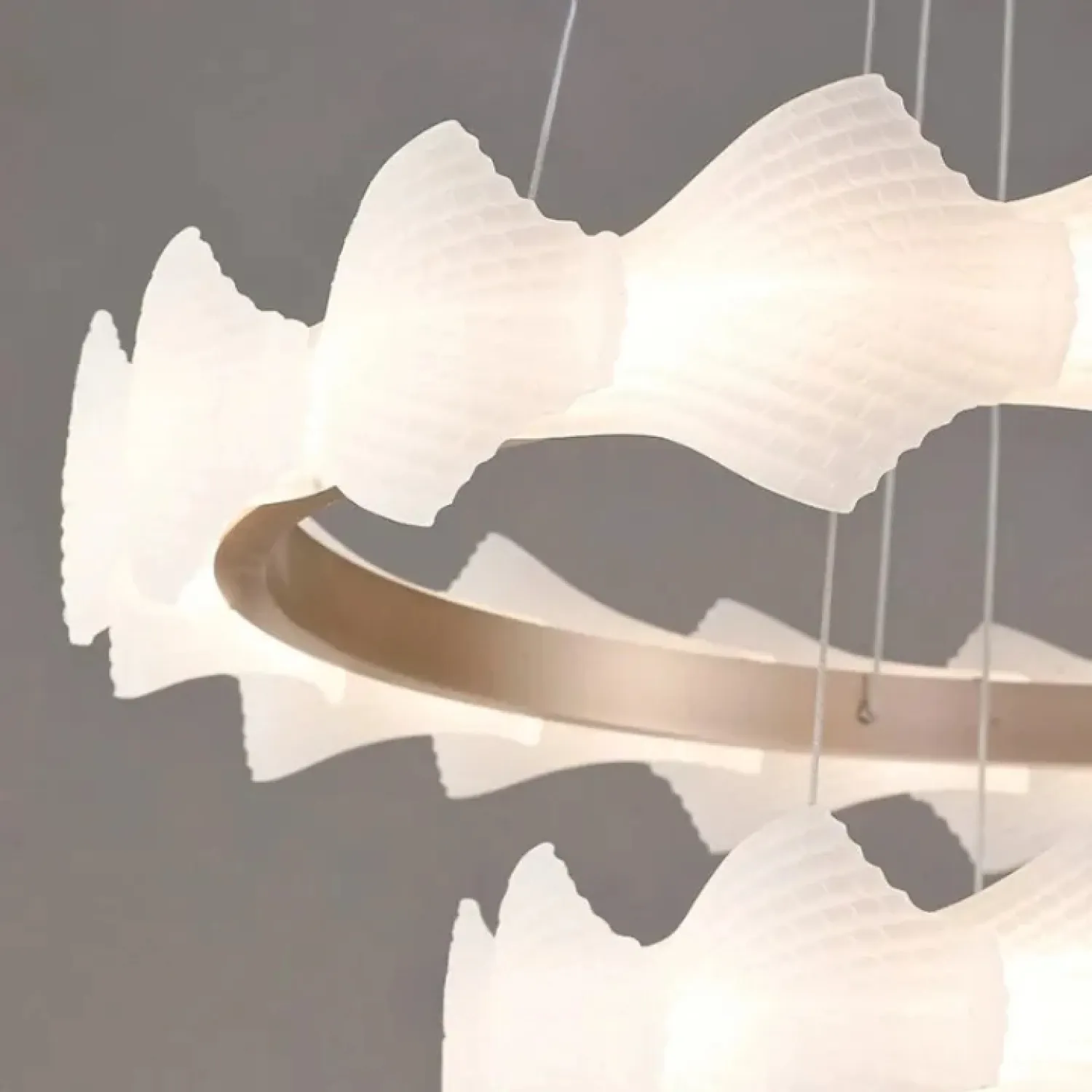 Модель NIAL-RING — это стильный кольцевой светильник с волнообразным корпусом. Корпус выполнен из рельефных рассеивателей с чешуйчатым узором из металла и акрила в тёплом розовом золоте. Он создаёт мягкое и равномерное освещение, которое идеально подходит для гостиной или спальни в скандинавском, лофт или классическом стиле.