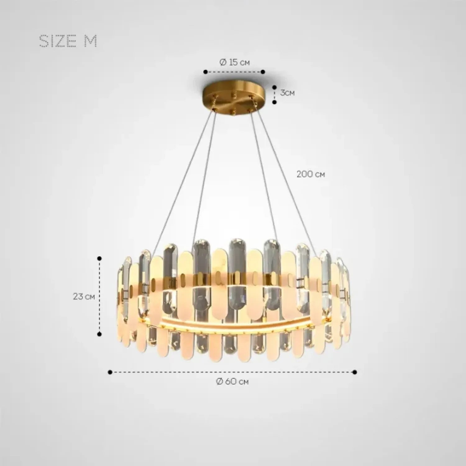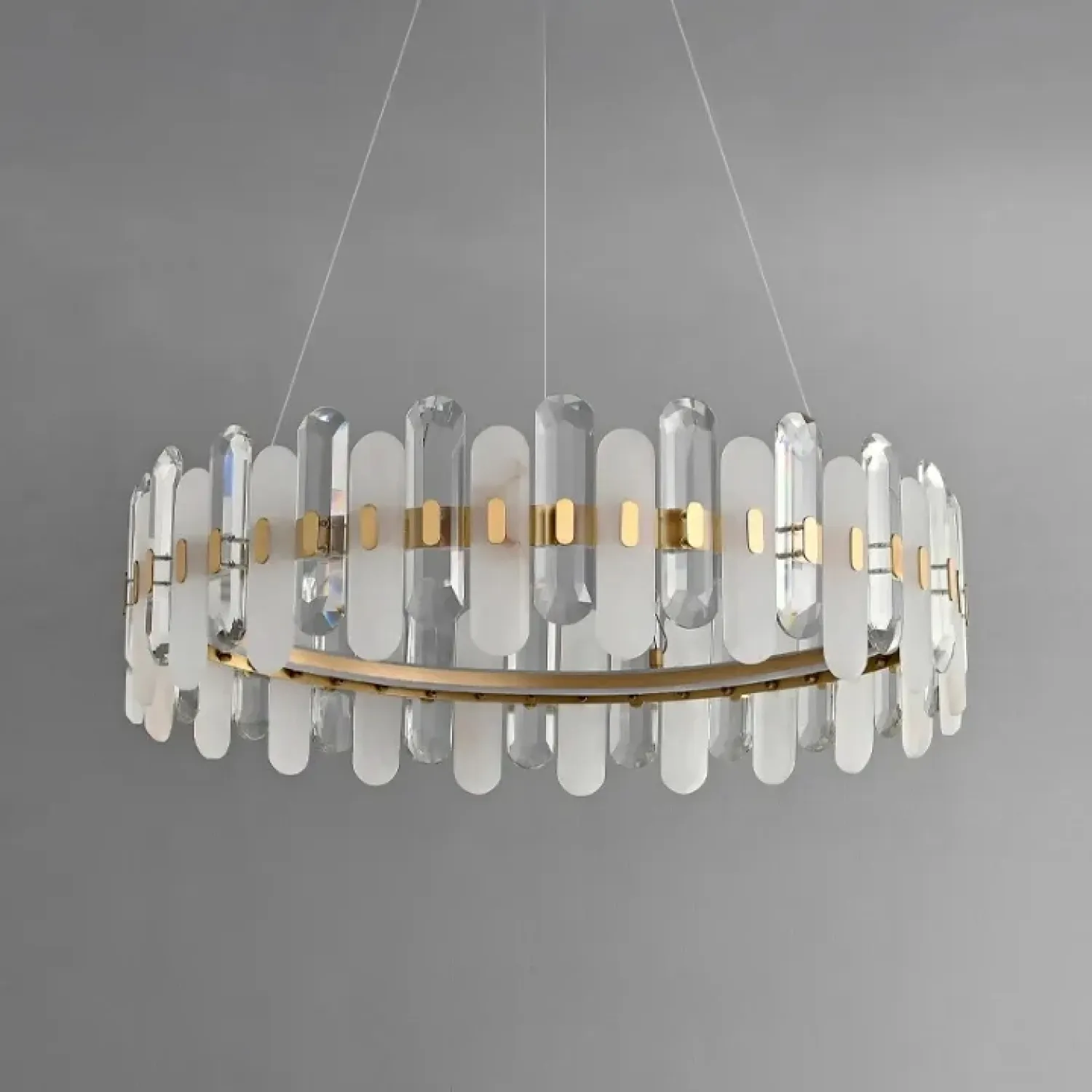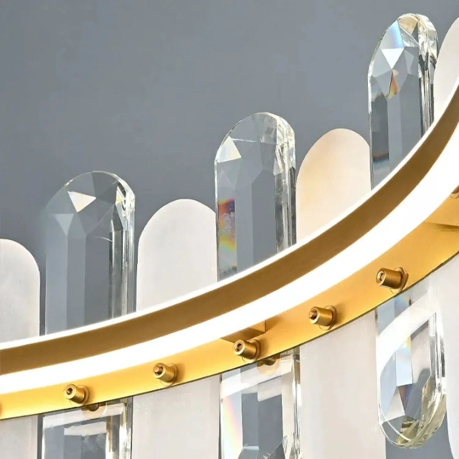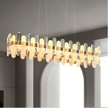 Кольцевой светильник LAUGE изготовлен из латуни с латунной отделкой. Его украшают мраморные и хрустальные пластины с закругленными краями, создавая гармоничный союз классики и современности. Благодаря своим размерам, светильник станет ярким акцентом в просторных гостиных, столовых или спальнях, выполненных в стиле лофт или скандинавского минимализма. Подвес длиной 200 см позволяет гибко настроить его размещение. LED-матрица с трехцветным освещением создает мягкое и рассеянное свечение, которое идеально подчеркивает интерьеры с каменными или деревянными элементами. Этот светильник станет стильным и уютным центром вашего пространства.