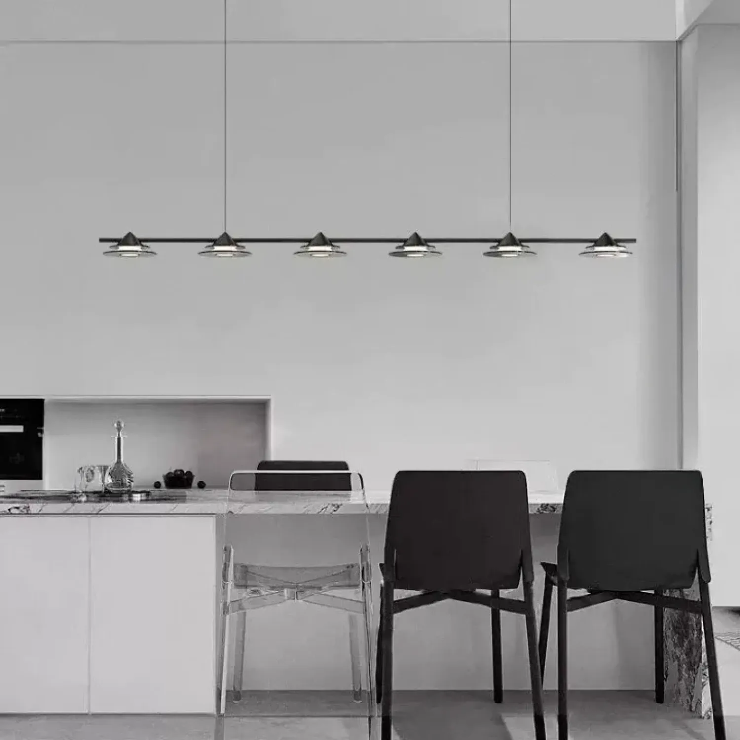 Модель GORM-LONG из линейки реечных светильников изготовлена из металла, стекла и акрила в глубоком черном цвете, идеально вписываясь в интерьеры в стиле лофт, скандинавском или модерн. Благодаря своей длине, светильник равномерно освещает просторные помещения, такие как кухня или гостиная, создавая мягкий и рассеянный свет благодаря плафонам из дымчатого стекла с молочной внутренней поверхностью. Современная LED-система с трехцветной подсветкой обеспечивает яркое и регулируемое освещение, адаптируемое под настроение или время суток. Этот рядный светильник добавляет интерьеру динамичности и функциональности, создавая уютную и просторную атмосферу, идеально подходящую для совмещения кухни и жилых зон. Приобретая эту модель, вы подчеркиваете современность и актуальность своего дизайна, а также создаете комфортную и стильную обстановку.