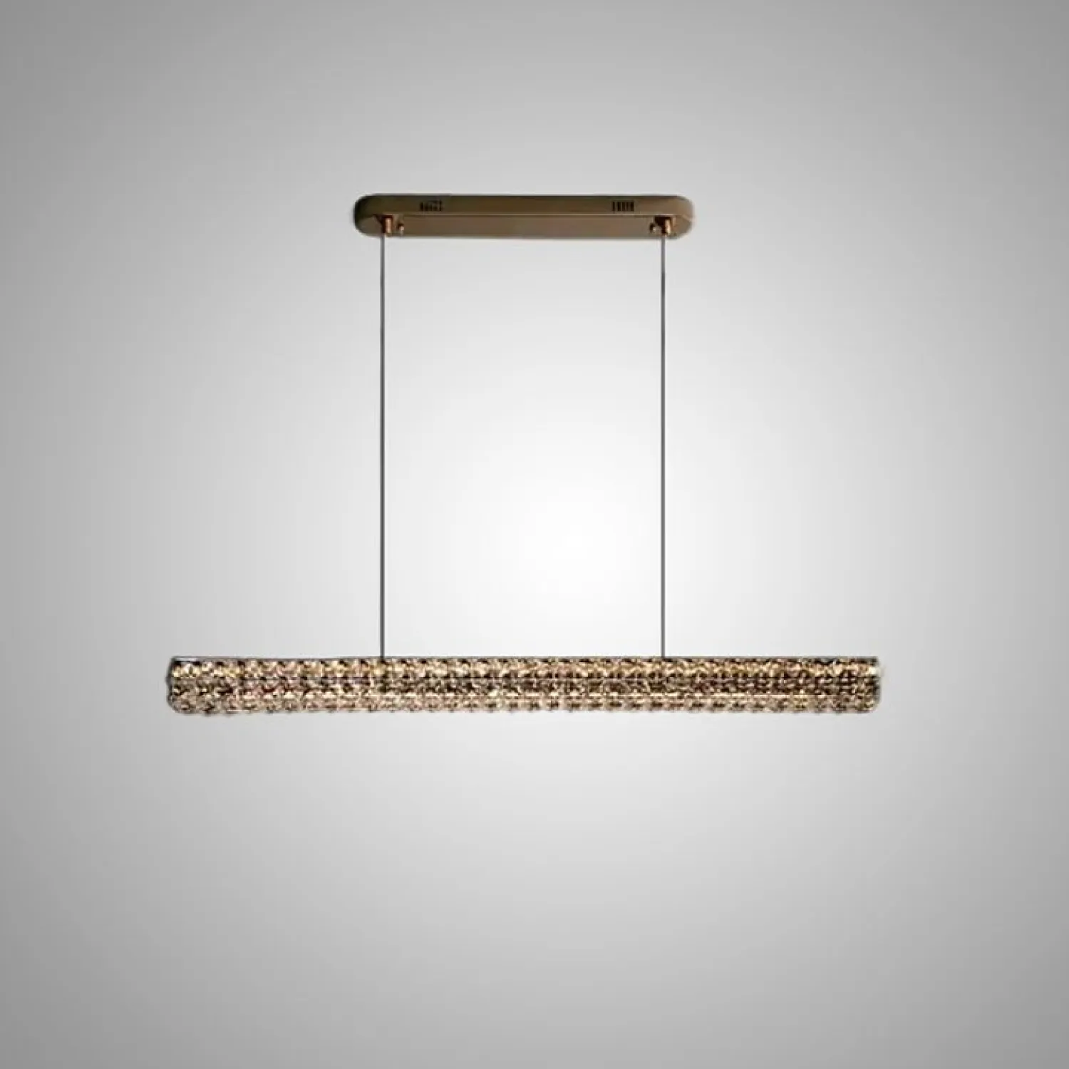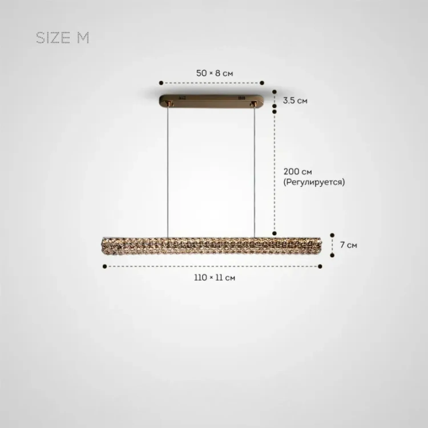 Благодаря своей длине и украшению из ограненного хрусталя с прямоугольным узором, светильник становится акцентом в интерьере. Он наполняет пространство роскошным сиянием и создает атмосферу утонченной элегантности.