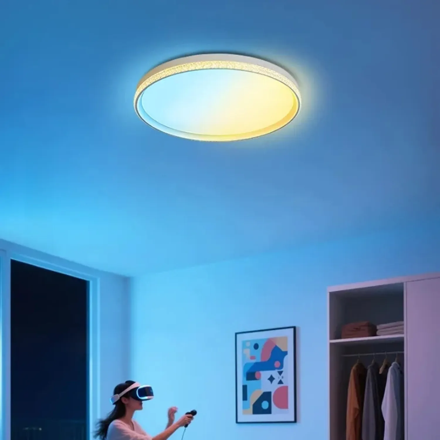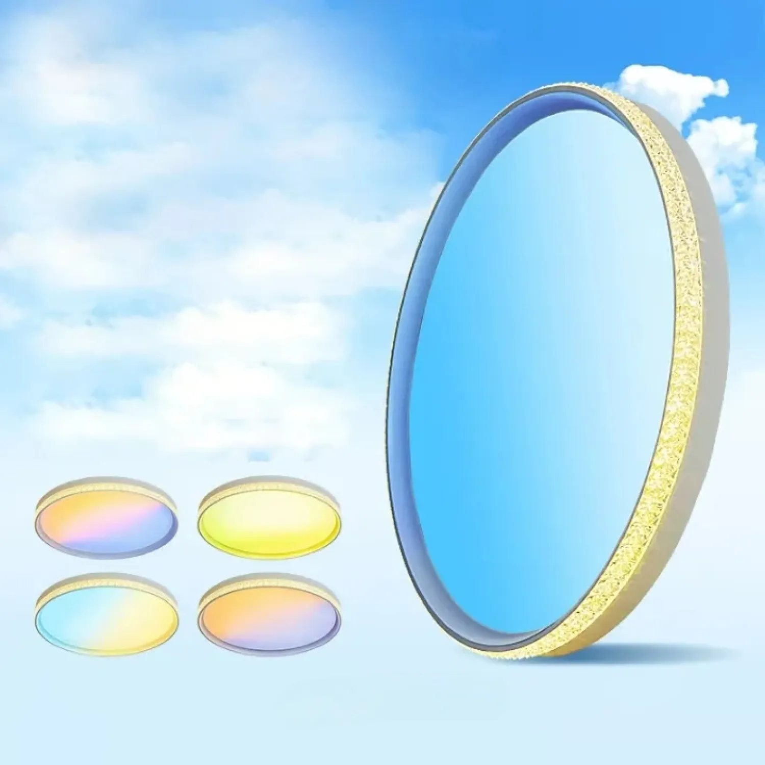 Светильник для потолка с плоским дизайном, имитирующий рассвет, закат, голубое небо и другие эффекты. Для смены режима предусмотрен пульт управления.