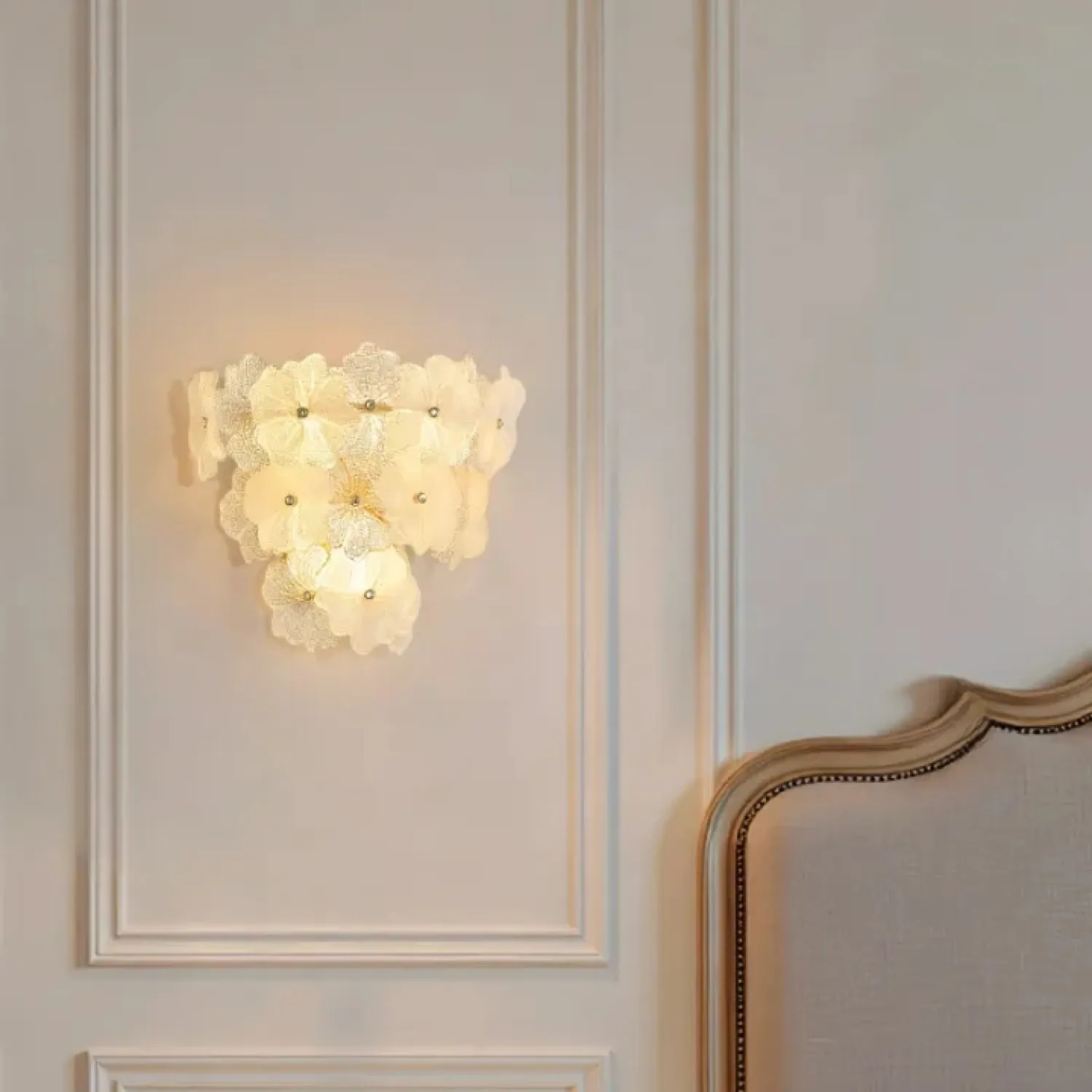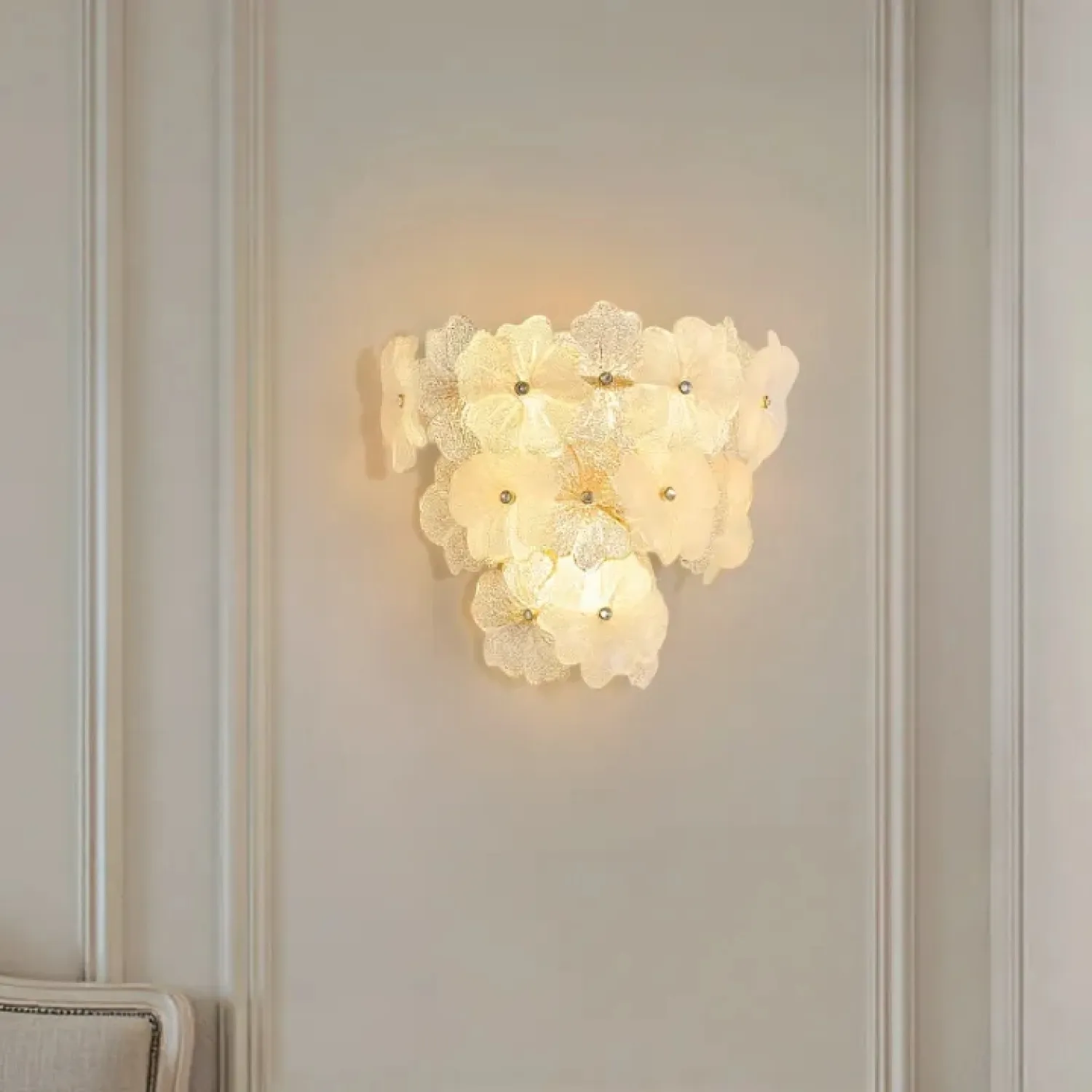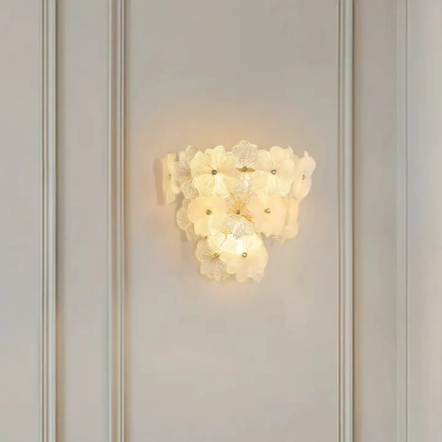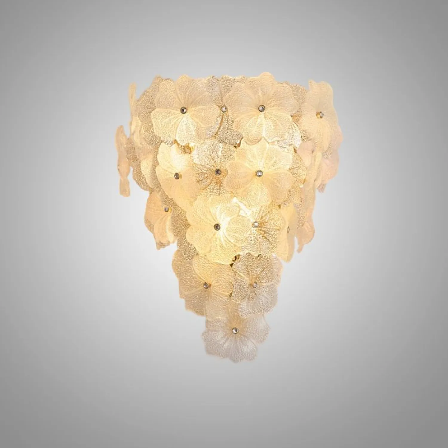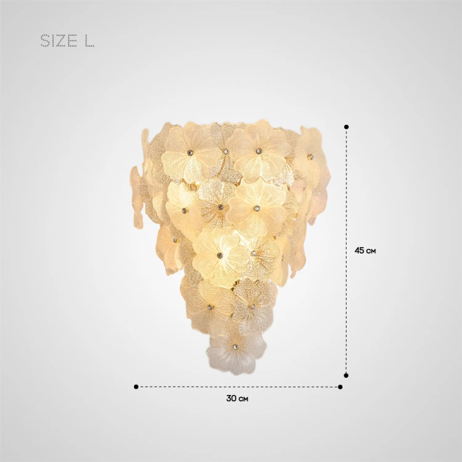 Настенный светильник IVET C WALL — это изысканное сочетание металла и стекла. Его украшает изящный цветочный орнамент из рельефного матового и прозрачного стекла. Этот светильник придает интерьеру нежность и утонченность. Золотой каркас и флористические элементы добавляют элегантности, идеально вписываясь в просторные гостиные, спальни или прихожие. Он уместен как в классическом, так и в скандинавском стиле. Светильник прекрасно подходит для помещений со средними потолками. Он гармонично сочетается с другими элементами премиального освещения или уютной лофт-обстановки. Встроенные источники света с цоколем E14 создают мягкий рассеянный свет, наполняя пространство уютом и теплом.
