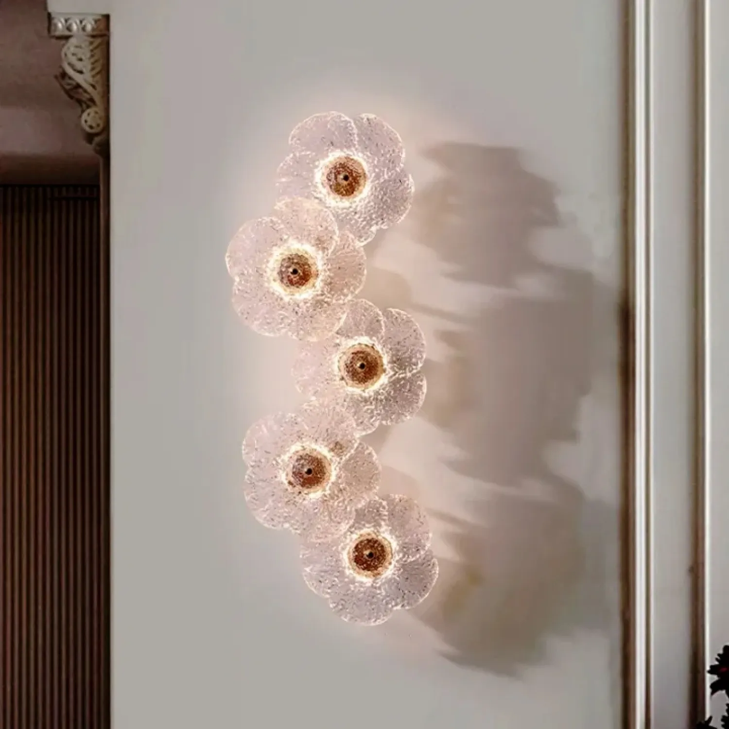 Настенный светильник PAU из прозрачного стекла с цветочными узорами создаёт уютную и тёплую атмосферу в классических или скандинавских интерьерах. Его минималистичный дизайн из металла и латуни гармонично вписывается в современные стили, такие как модерн или лофт. Светильник оснащён трёхцветной LED-матрицей, которая равномерно распределяет мягкий, рассеянный свет, акцентируя внимание на натуральных элементах декора. Компактные размеры позволяют ему легко сочетаться с любым интерьером, не перегружая пространство. Этот светильник идеально дополняет дизайнерские решения, выполненные из стекла и металла, придавая комнате элегантность и особую атмосферу.