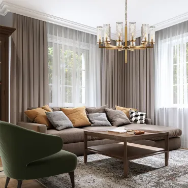 Люстра FEAT из металла и стекла в латунном оттенке привносит в интерьер атмосферу постмодерна с элементами минимализма и классики. Элегантные стеклянные плафоны с текстурой создают мягкое рассеянное свечение, добавляя пространству тепла и уюта. Она идеально подходит для просторной гостиной или столовой в скандинавском, модерн или классическом стиле, где каждая деталь подчеркивает изысканность и современный вкус. Благодаря своим размерам, люстра гармонично смотрится над крупным обеденным столом или в центре светлой гостиной, дополняя интерьер декоративными акцентами. Сочетание металла и стекла придает интерьеру культуру и атмосферу роскоши, не перегружая пространство.