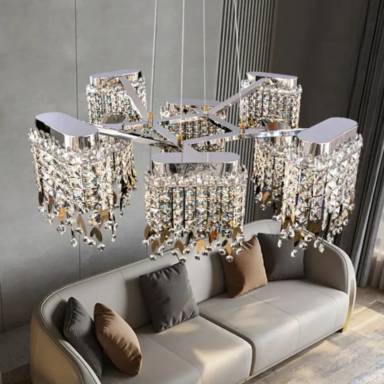 Эта дизайнерская люстра в стиле Ар-Деко выполнена из хромированного корпуса и оснащена лучевым каркасом с подвесками из многогранного хрусталя. Она излучает мягкий, рассеянный свет, идеально подходящий для просторных гостиных и столовых. Люстра создает роскошную атмосферу для торжественных мероприятий. В ней используется энергоэффективная LED-матрица с возможностью регулировки трехцветного освещения, что позволяет легко менять настроение комнаты. Подвеска длиной 100 см добавляет эффектности и прекрасно подходит для высоких потолков. Люстра гармонично сочетается с современными интерьерами и элегантным оформлением в стиле Ар-Деко, подчеркивая статус помещения.