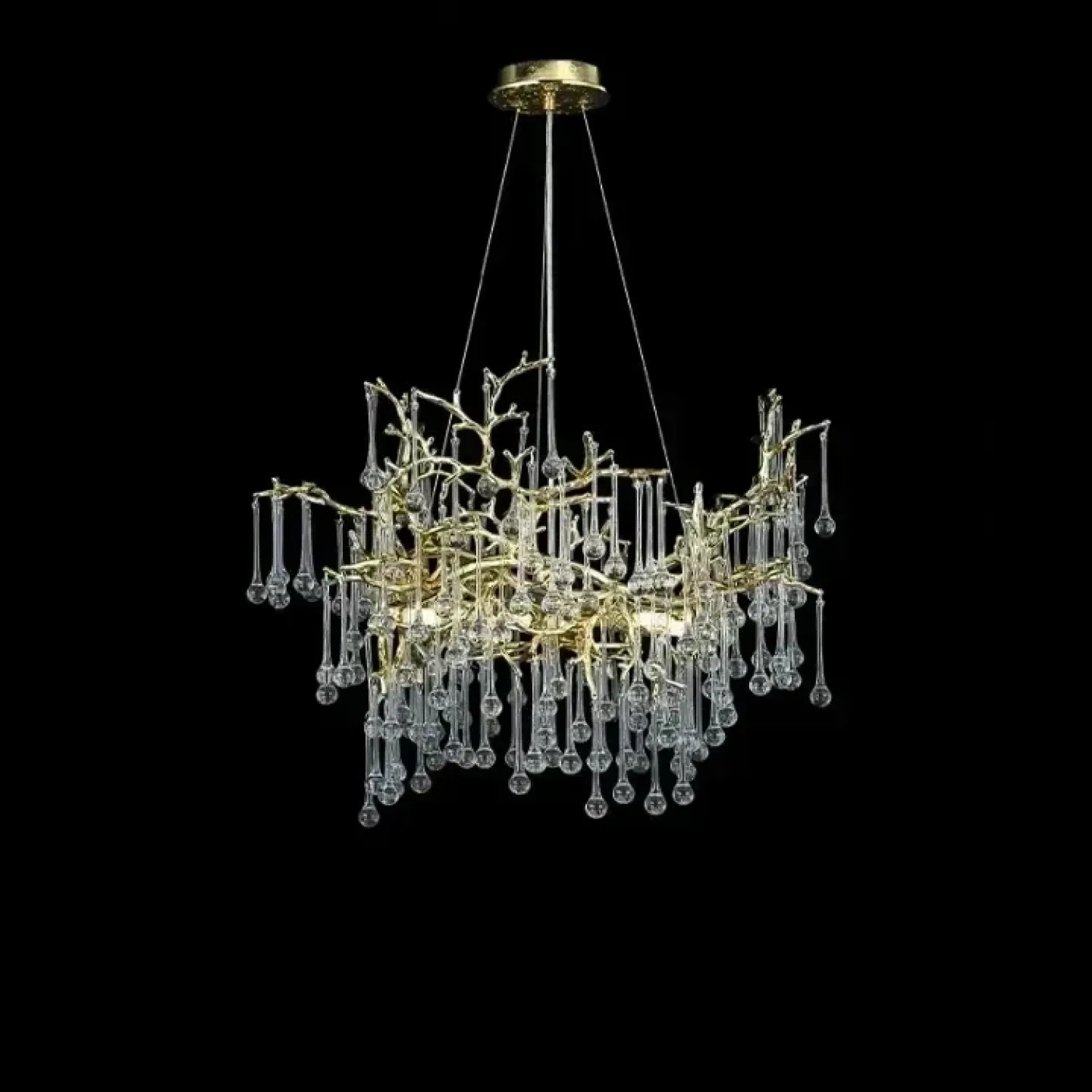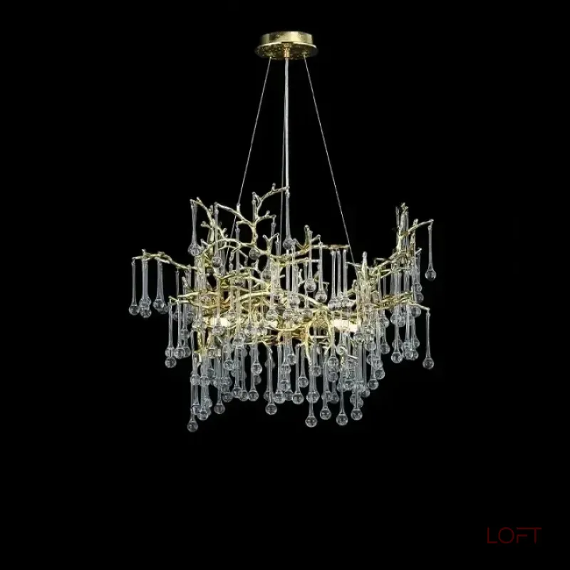 Люстра WATERDROPS изготовлена из металла и хрусталя в золотом цвете. Она легкая и изящная, как ветка с каплями стеклянных драгоценностей. Свет мягко рассеивается, наполняя интерьер теплом и уютом.