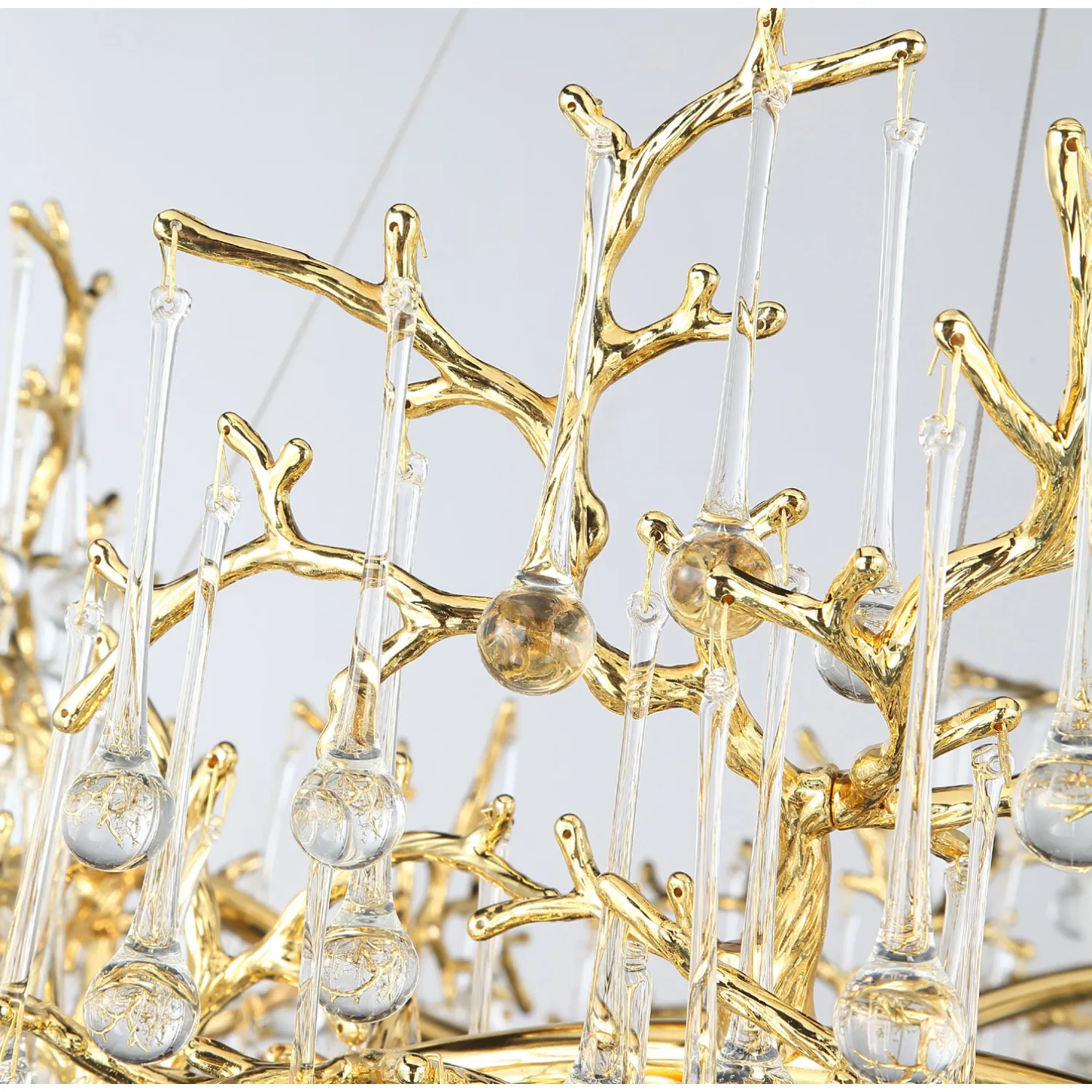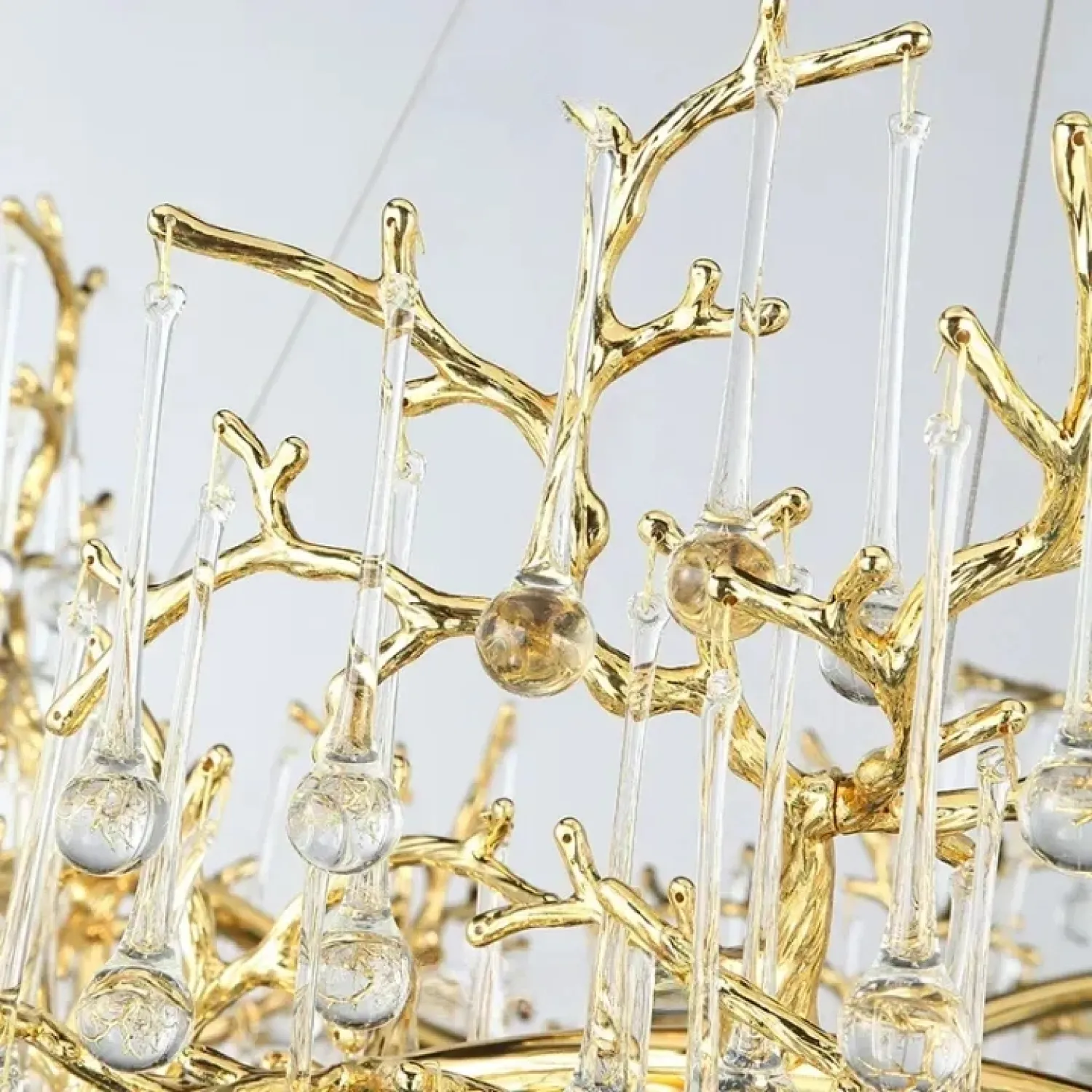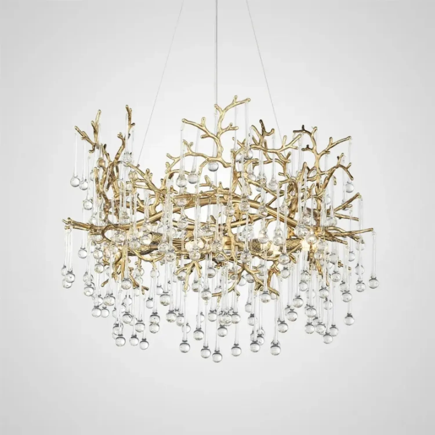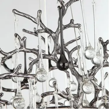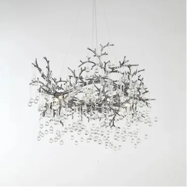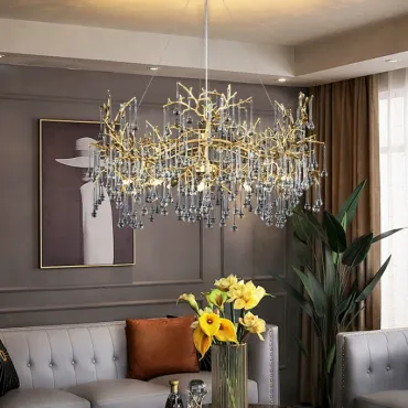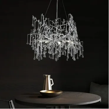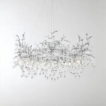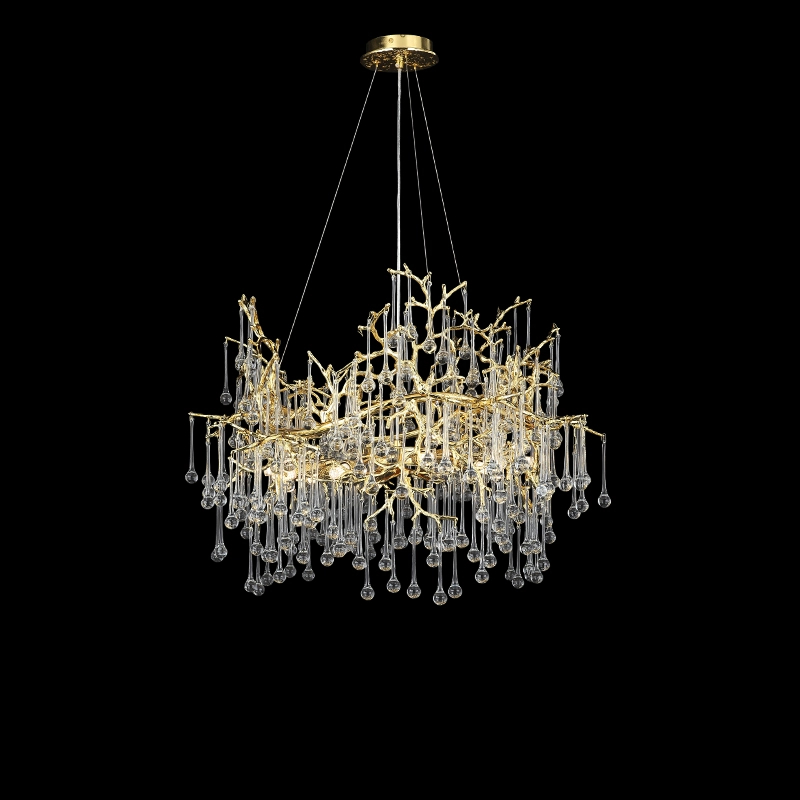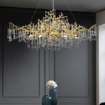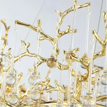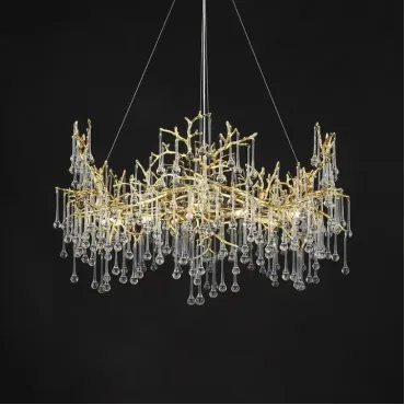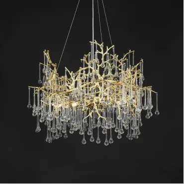 Люстра WATERDROPS изготовлена из металла и хрусталя в золотом цвете. Она легкая и изящная, как ветка с каплями стеклянных драгоценностей. Свет мягко рассеивается, наполняя интерьер теплом и уютом.