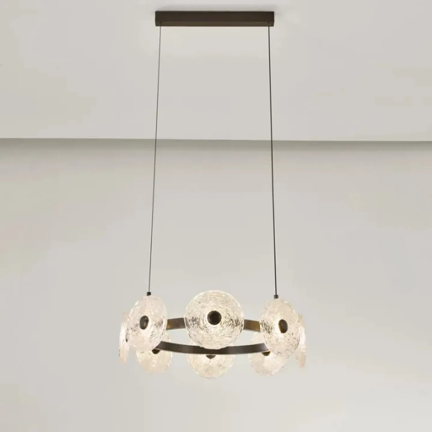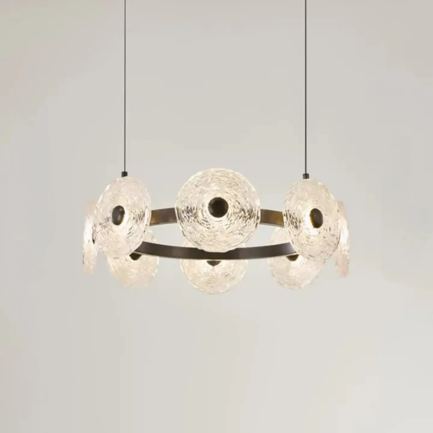 Эта модель светильника станет идеальным дополнением для современного интерьера в премиум-стиле. Она создана для тех, кто ценит утонченность и комфорт. Кольцевая люстра диаметром 50 см изготовлена из металла и стекла. На ней расположены рельефные дисковидные рассеиватели ручной работы. Они придают изделию уникальность и мягко рассеивают теплый свет.
