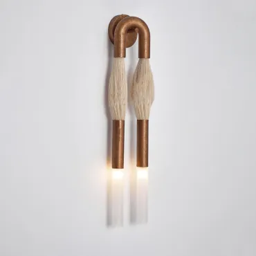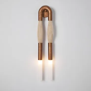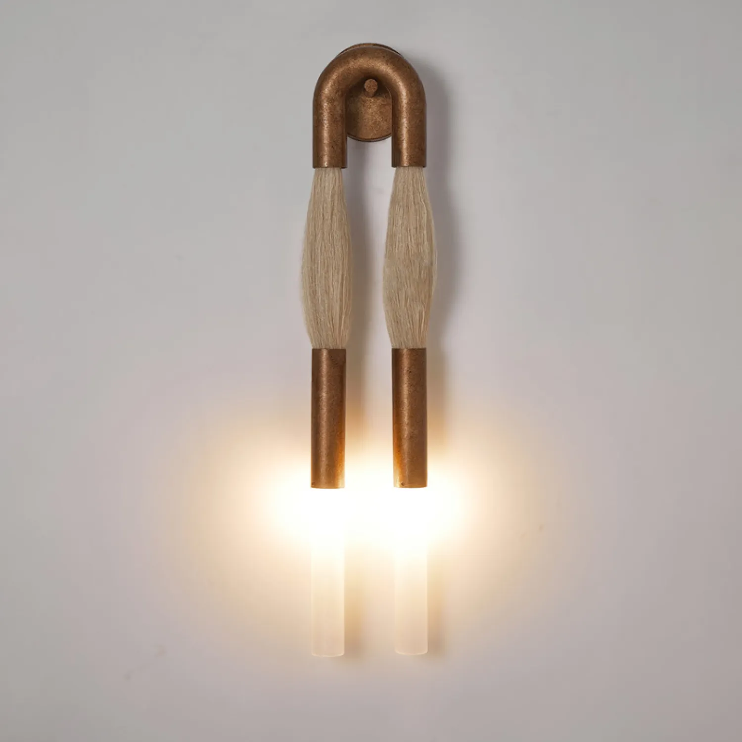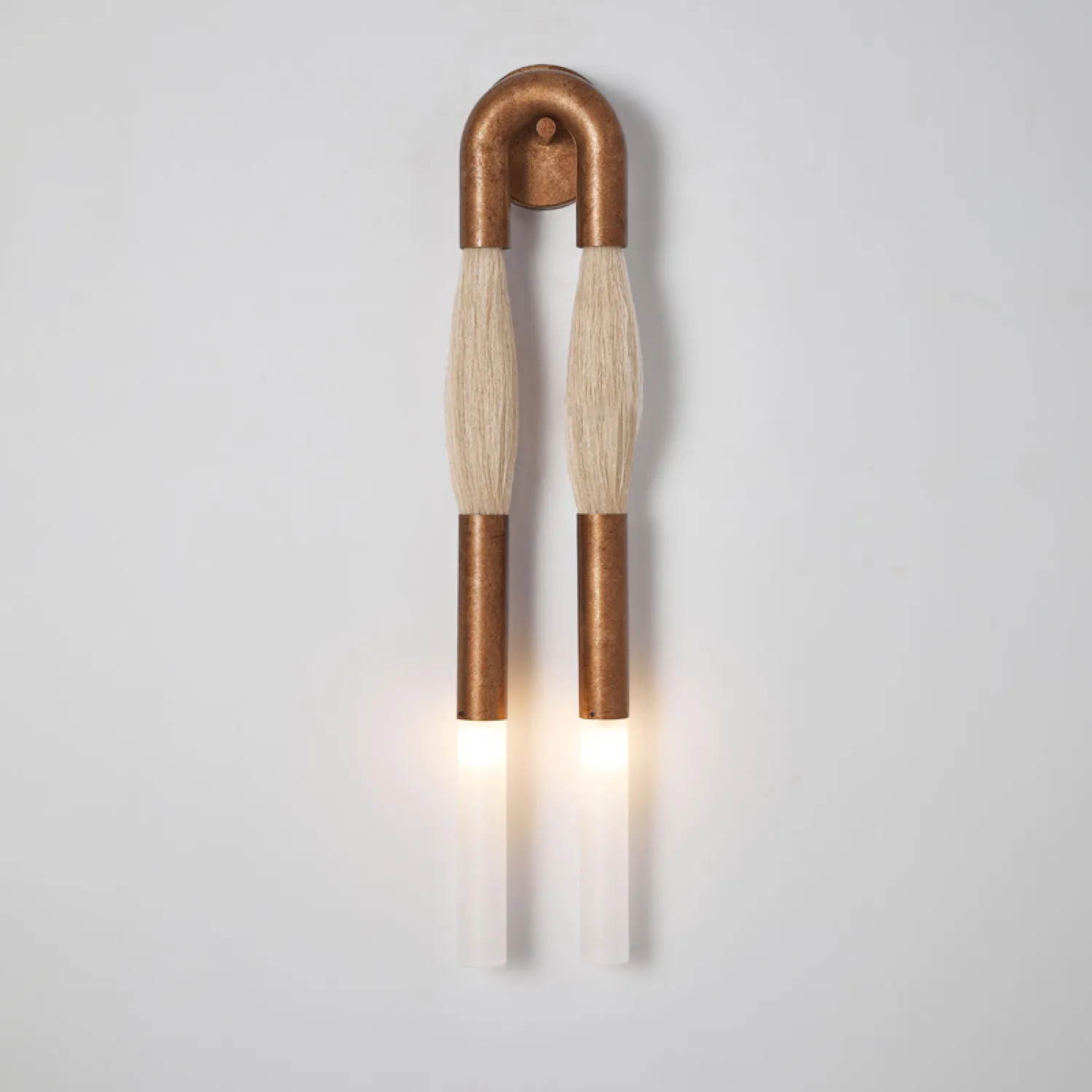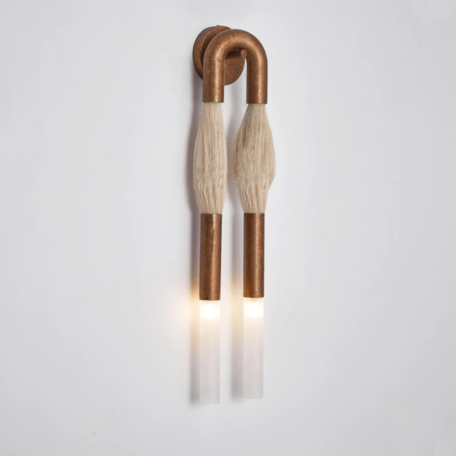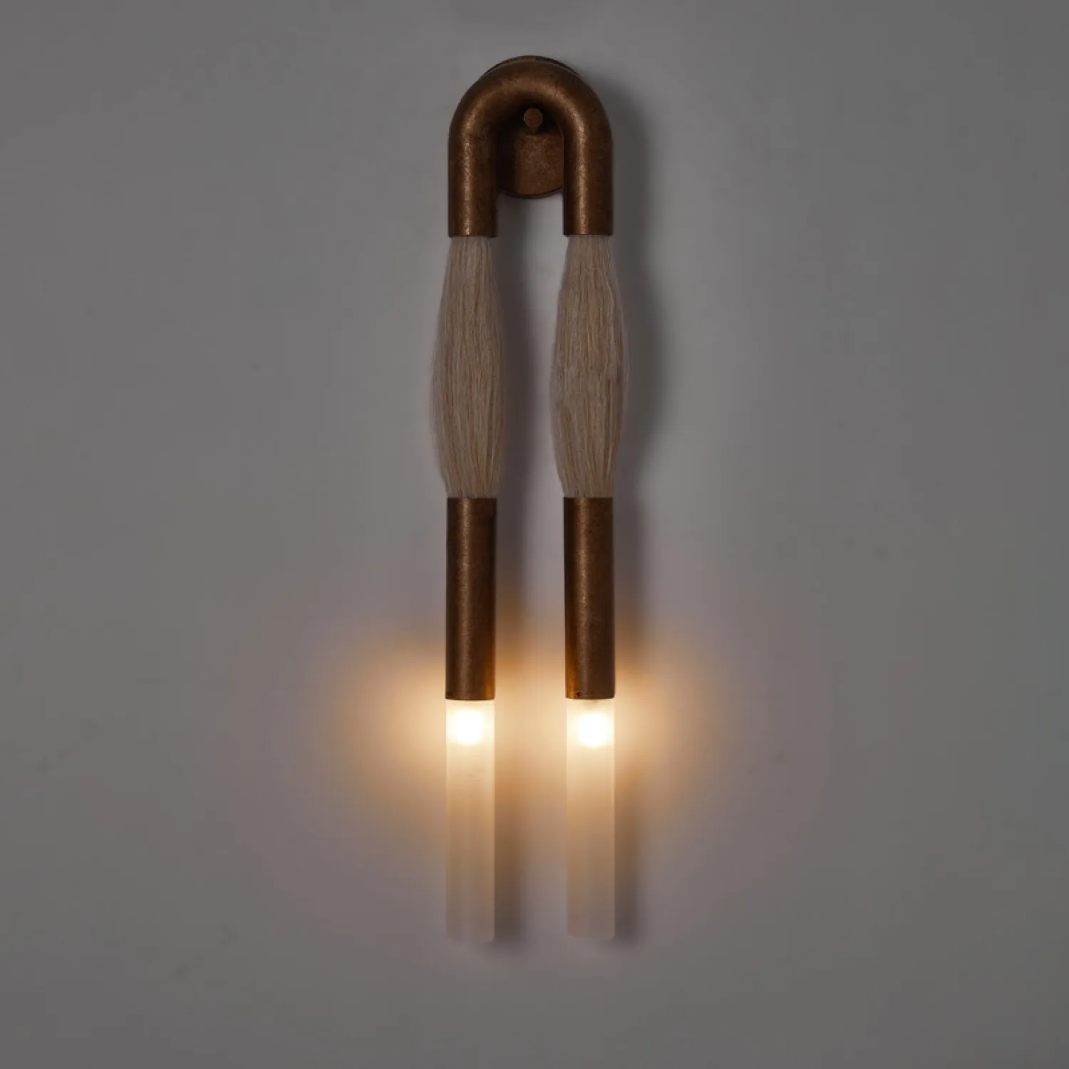 Стильный настенный светильник в современном дизайне: две «кисточки» из металла и конского волоса сочетаются с матовыми стеклянными плафонами и металлической U-образной рамой. Создаёт мягкое, уютное освещение, подчёркивая эстетику интерьера. Отлично впишется в гостиную, прихожую или зону галереи с картинами. Лаконичность и оригинальность — в каждой детали!