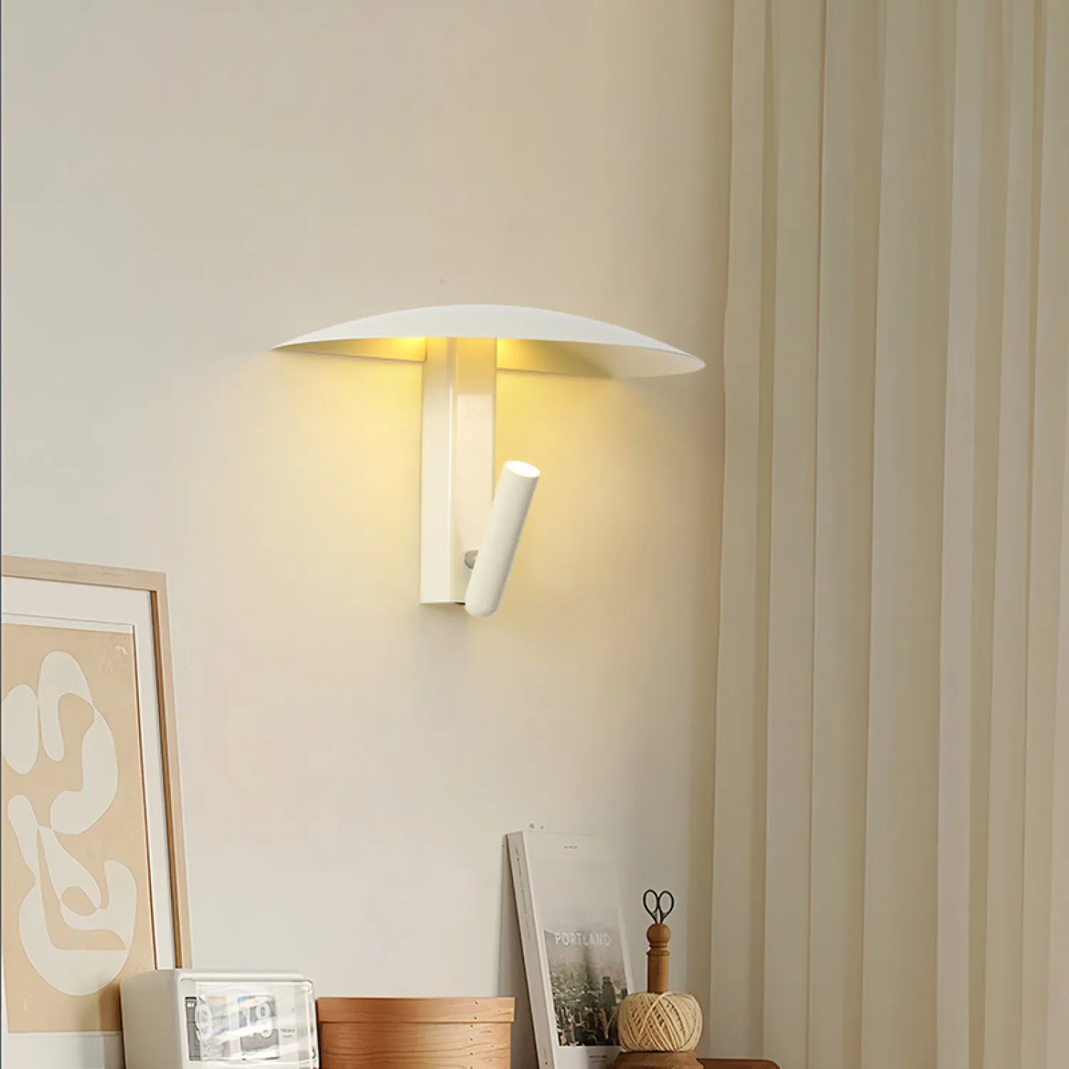 Стильный настенный светильник с оригинальным дизайном: куполообразный плафон напоминает грибную шляпку, а направленный спот добавляет функциональности. Чёрная матовая отделка придаёт изделию современный вид, а тёплый свет создаёт уютную атмосферу в интерьере.