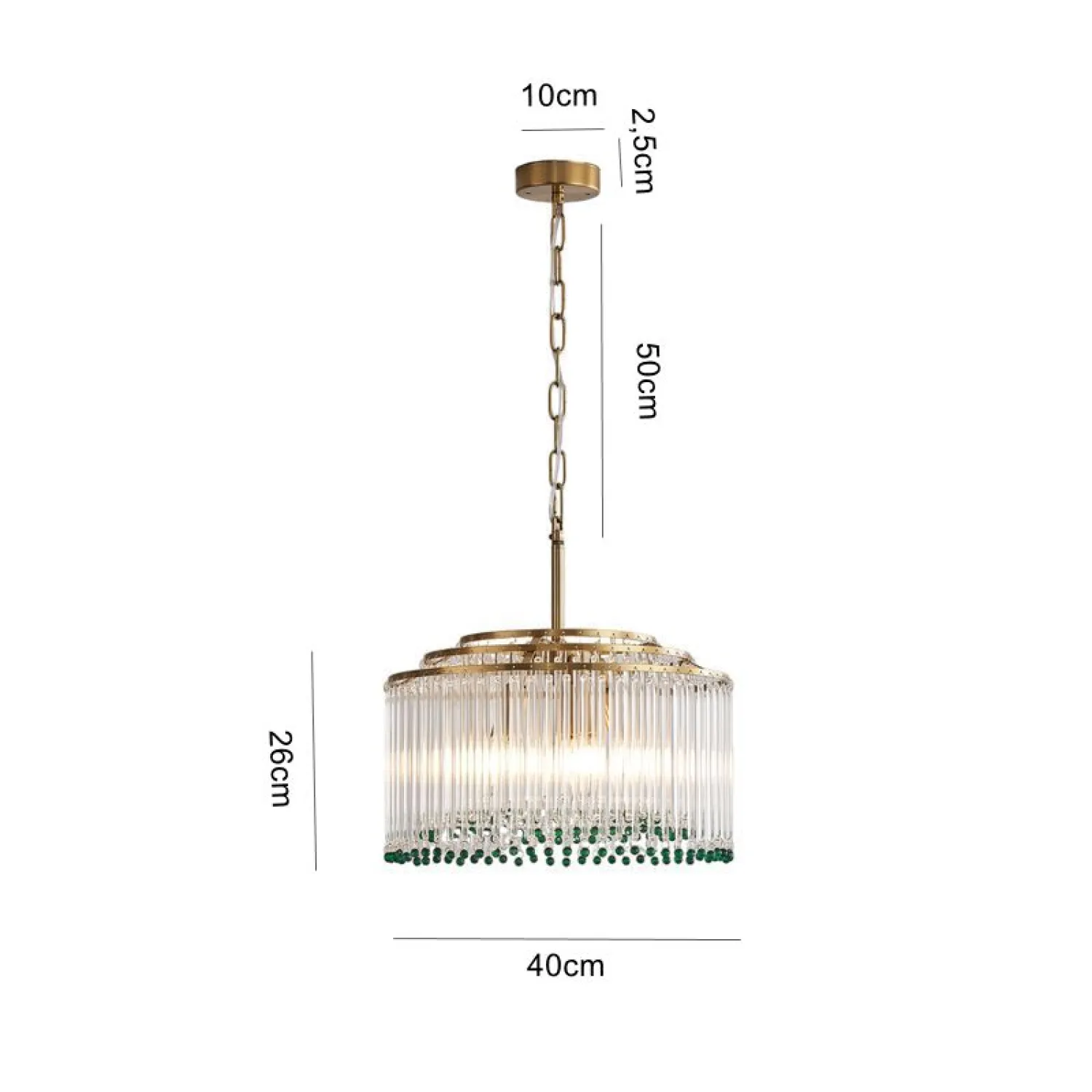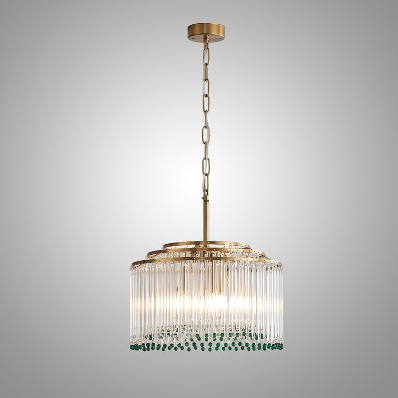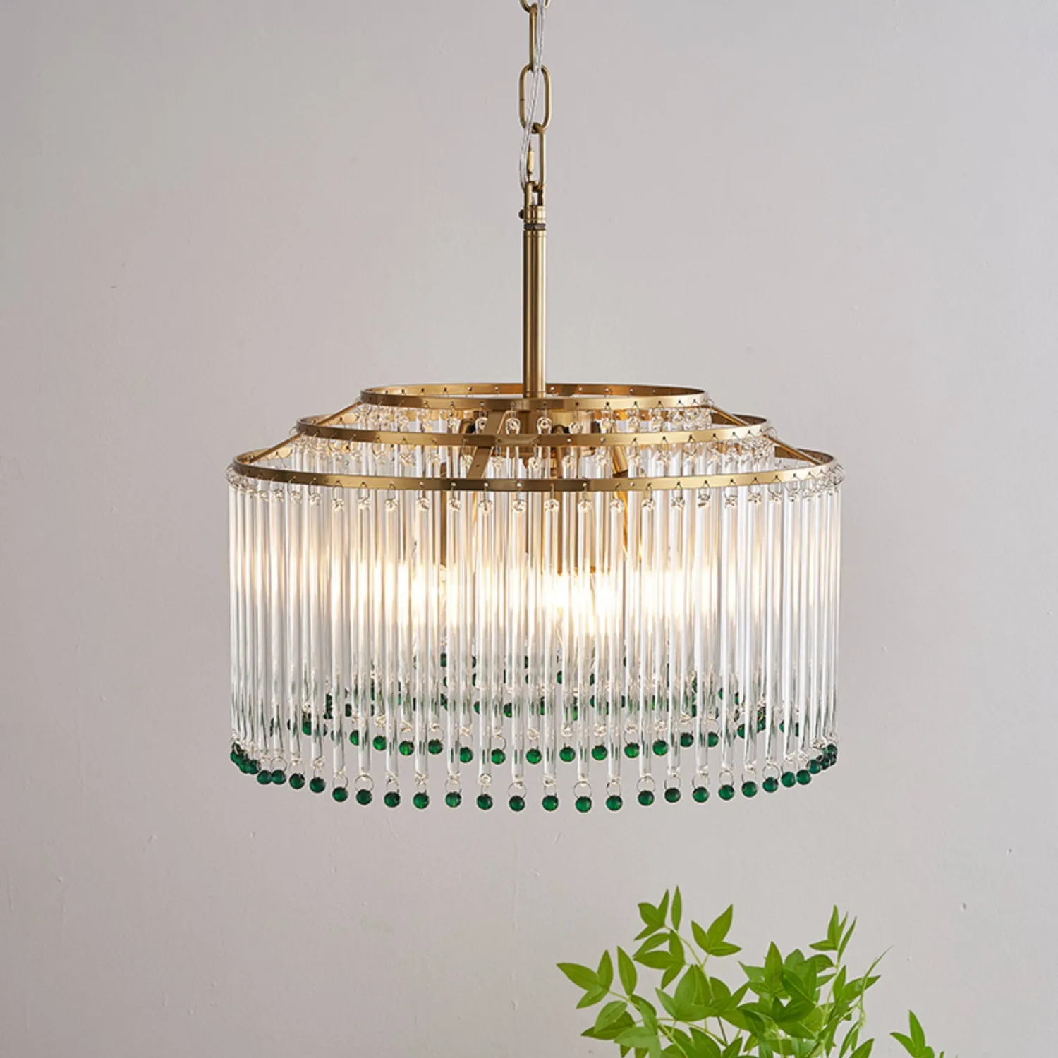 Элегантная подвесная люстра сочетает в себе роскошь и изящество: золотистая основа гармонично сочетается с каскадом прозрачных стеклянных стержней. Завершают композицию яркие зелёные хрустальные бусины, придающие изделию особый шарм и глубину. Мягкий рассеянный свет, проходя через стеклянные элементы, создаёт в помещении атмосферу уюта и торжественности. Этот изысканный светильник станет центральным акцентом в гостиной, столовой или холле.