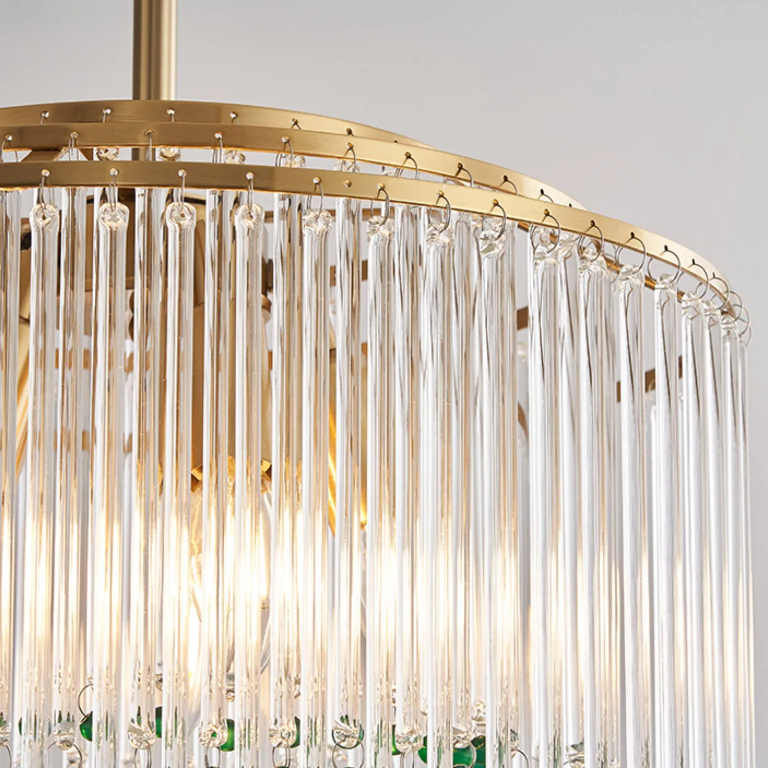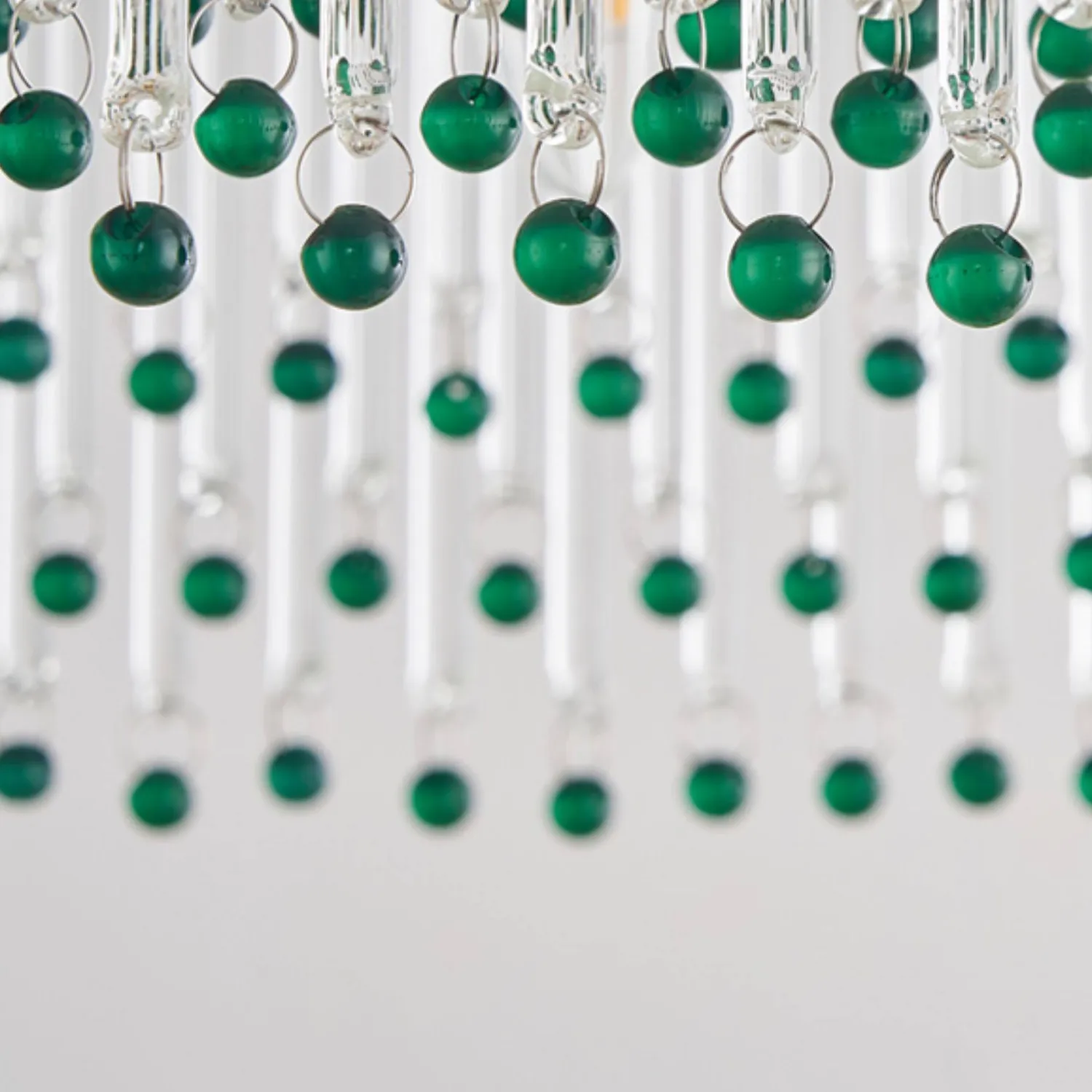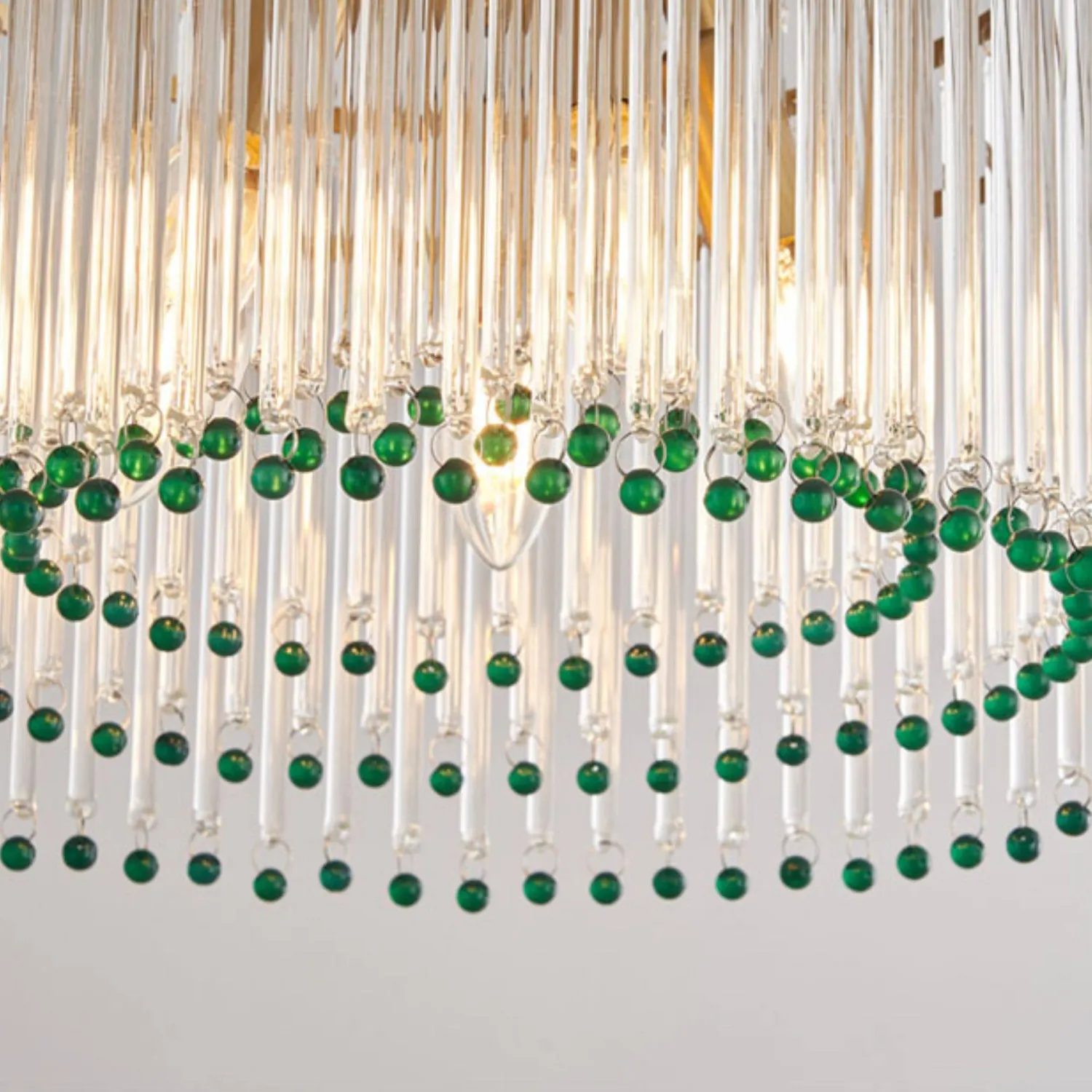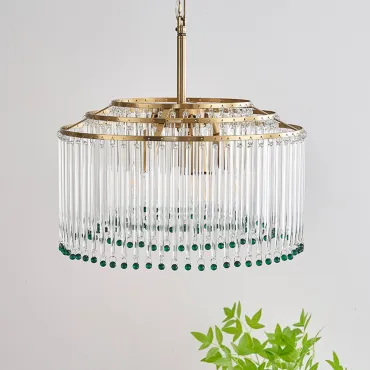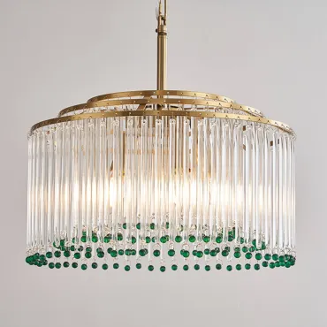 Элегантная подвесная люстра сочетает в себе роскошь и изящество: золотистая основа гармонично сочетается с каскадом прозрачных стеклянных стержней. Завершают композицию яркие зелёные хрустальные бусины, придающие изделию особый шарм и глубину. Мягкий рассеянный свет, проходя через стеклянные элементы, создаёт в помещении атмосферу уюта и торжественности. Этот изысканный светильник станет центральным акцентом в гостиной, столовой или холле.