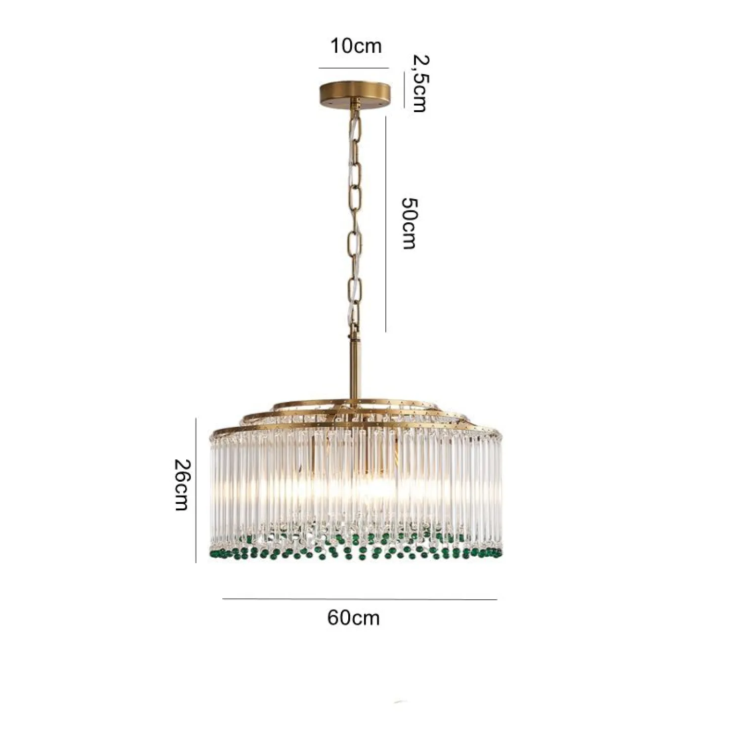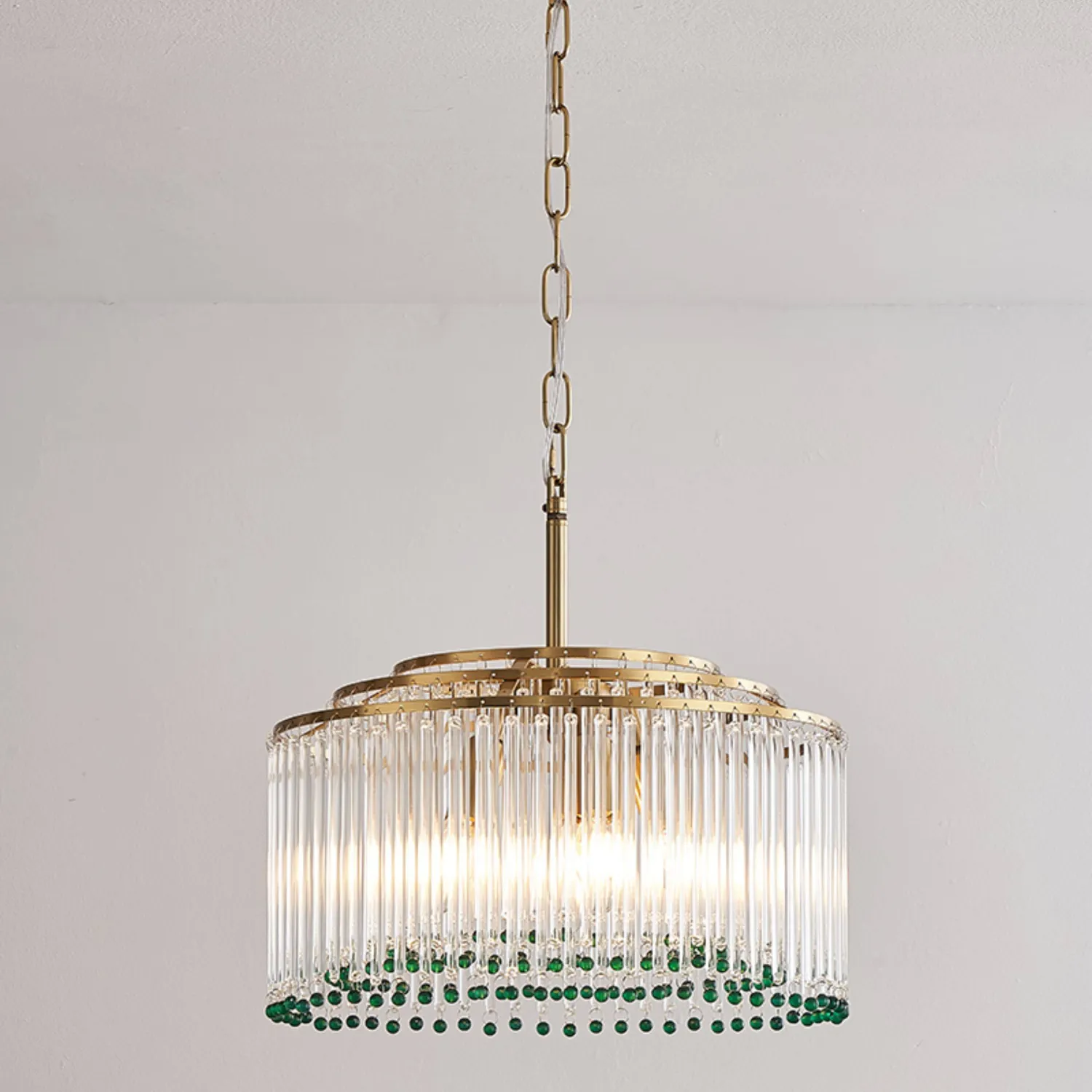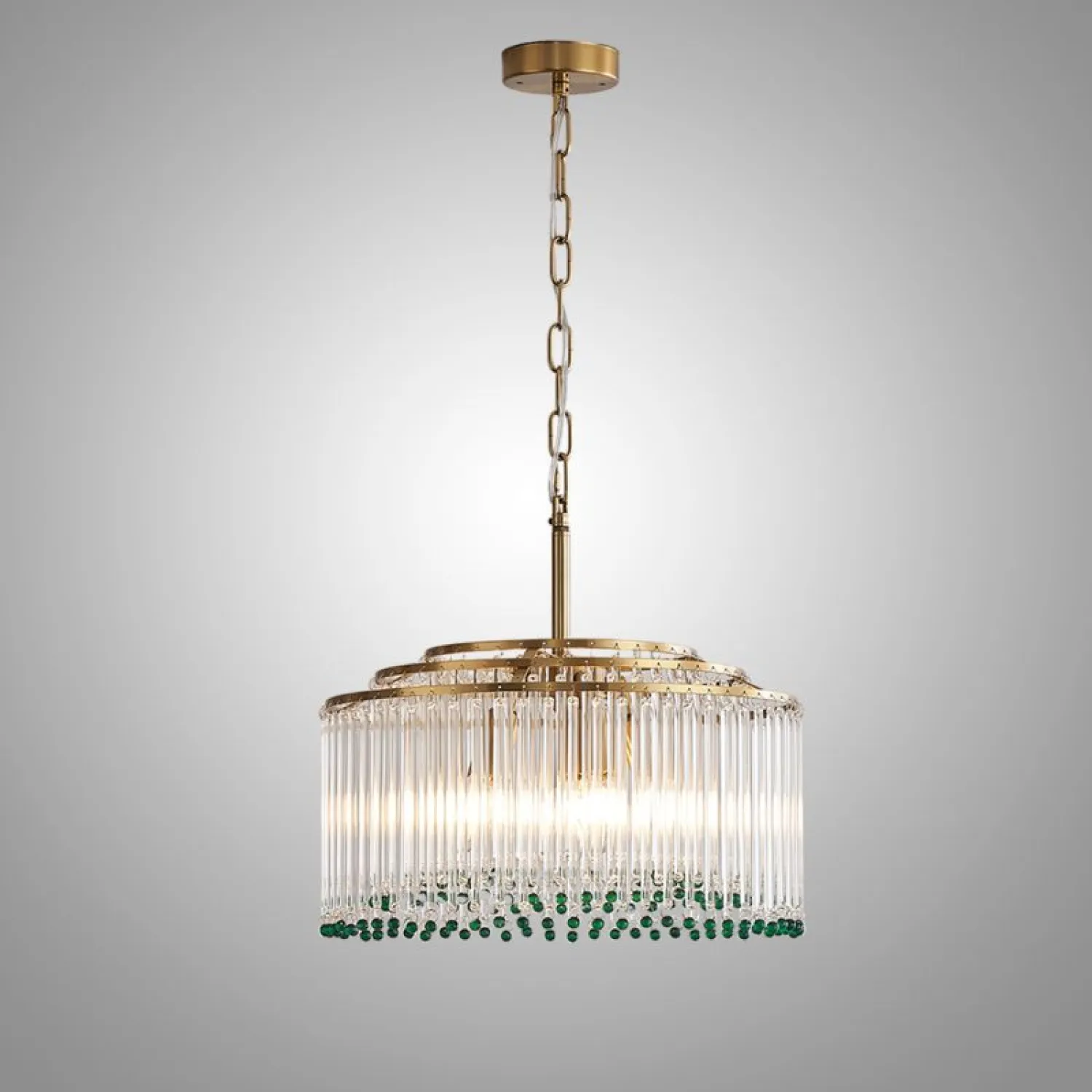 Элегантная подвесная люстра сочетает в себе роскошь и изящество: золотистая основа гармонично сочетается с каскадом прозрачных стеклянных стержней. Завершают композицию яркие зелёные хрустальные бусины, придающие изделию особый шарм и глубину. Мягкий рассеянный свет, проходя через стеклянные элементы, создаёт в помещении атмосферу уюта и торжественности. Этот изысканный светильник станет центральным акцентом в гостиной, столовой или холле.