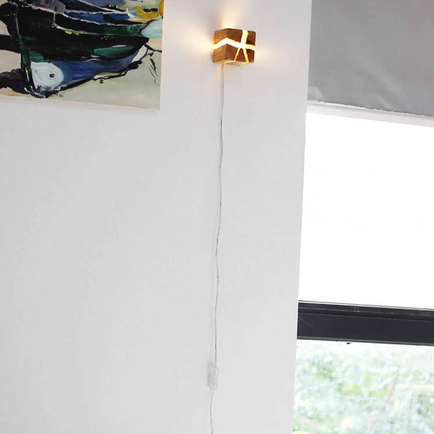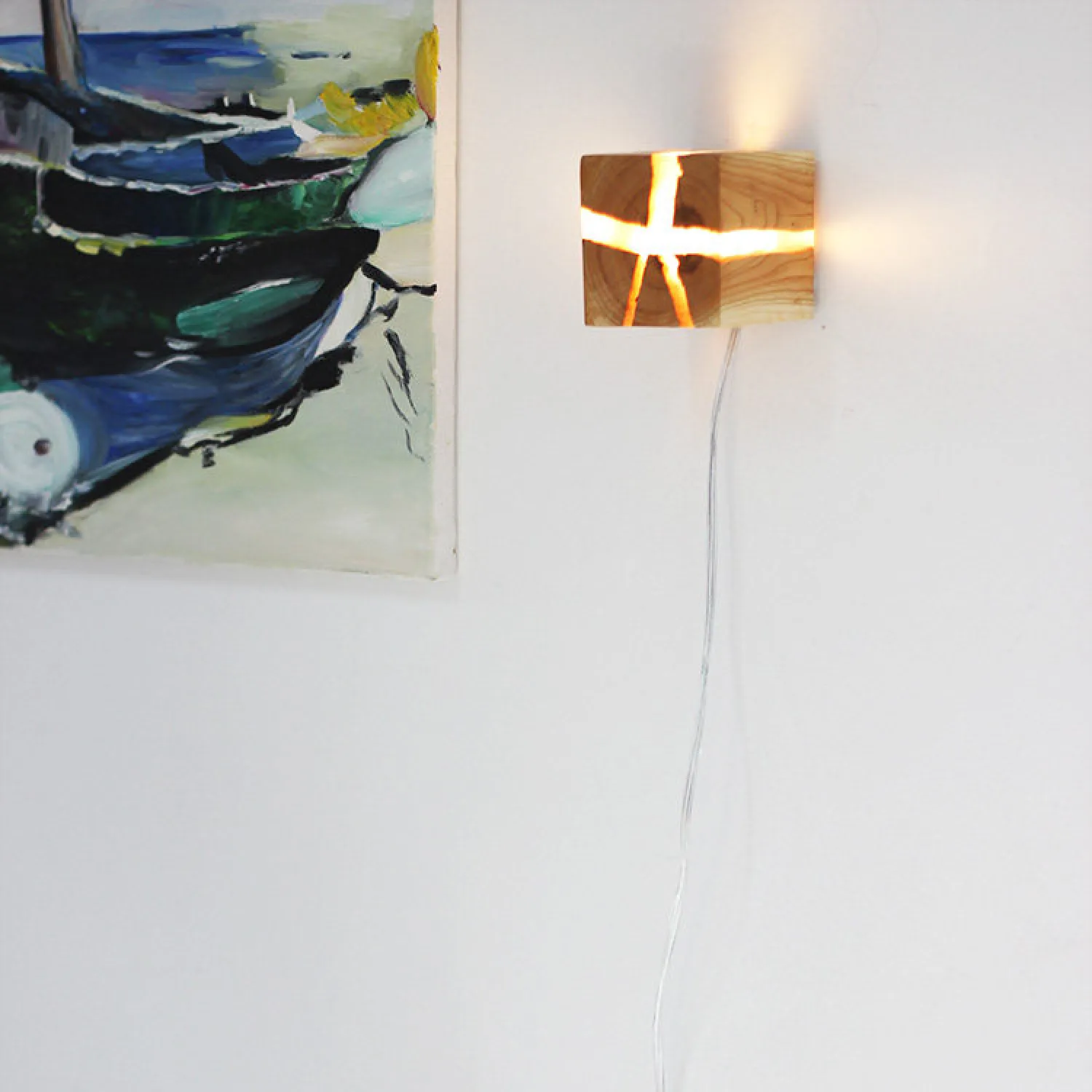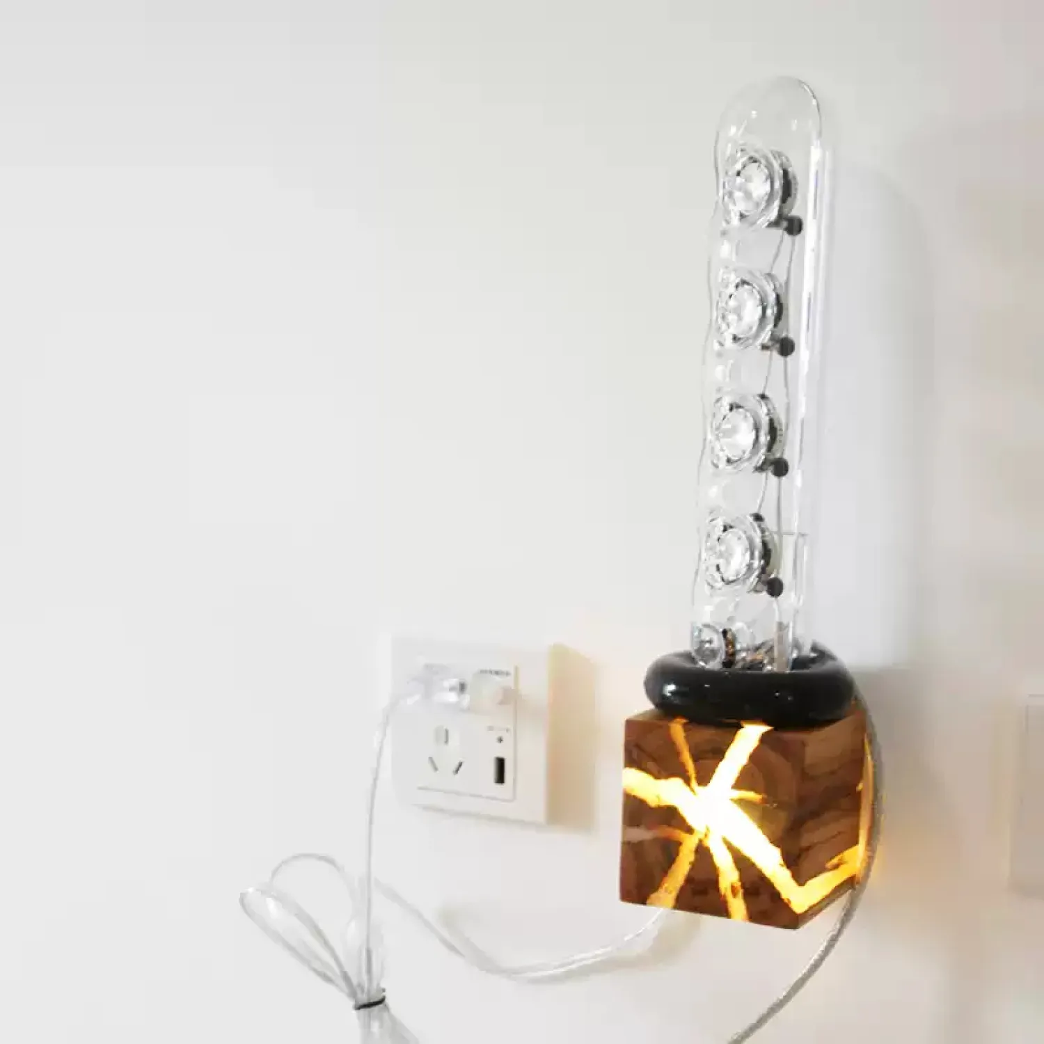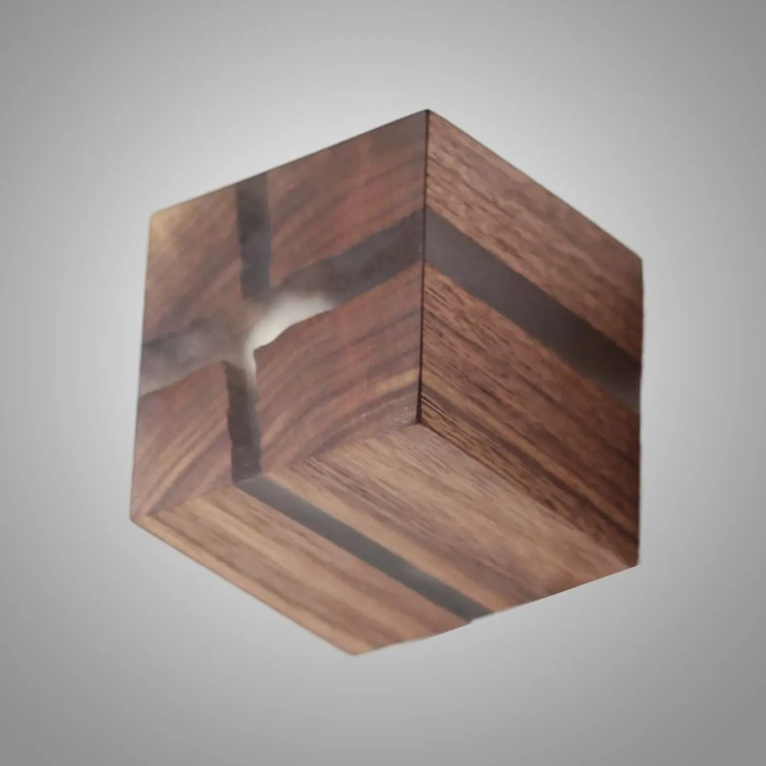 Настенный светильник в виде куба выполнен из натурального дерева с выразительной текстурой. Особенность модели — светящиеся «трещины», создающие оригинальный световой узор. Компактный и стильный, он станет акцентным элементом интерьера спальни, прихожей или гостиной. Сочетает экологичность материала и современный дизайн.